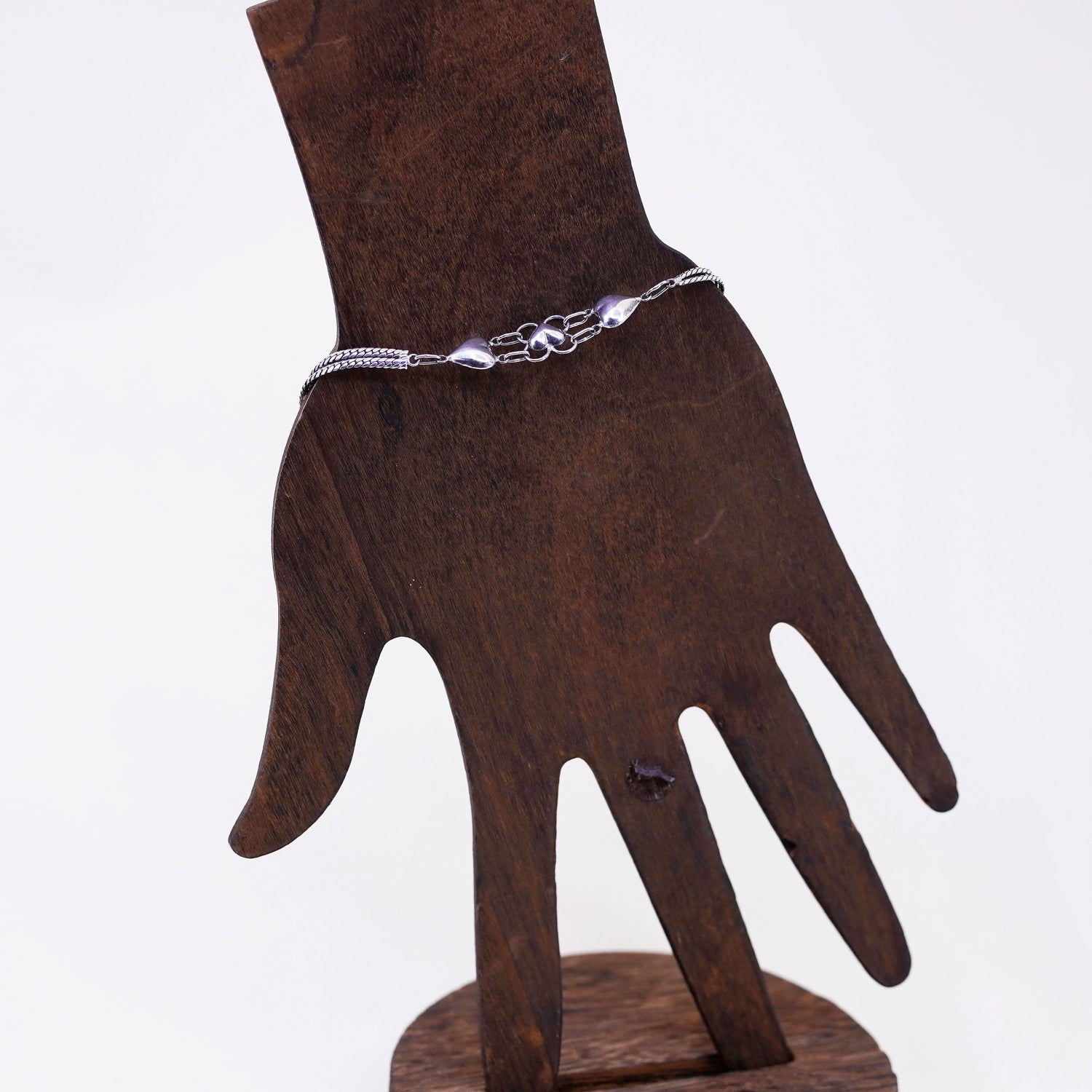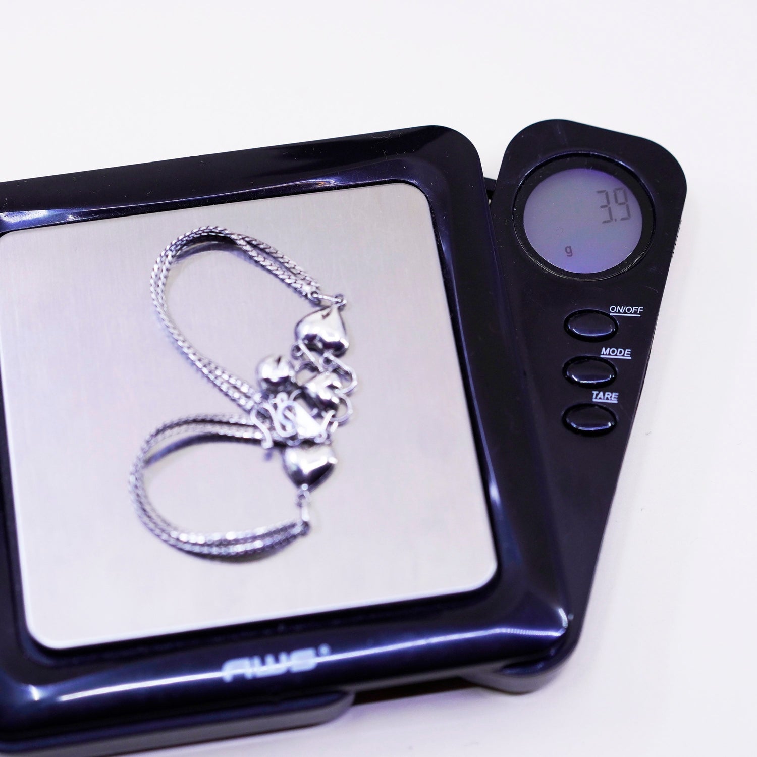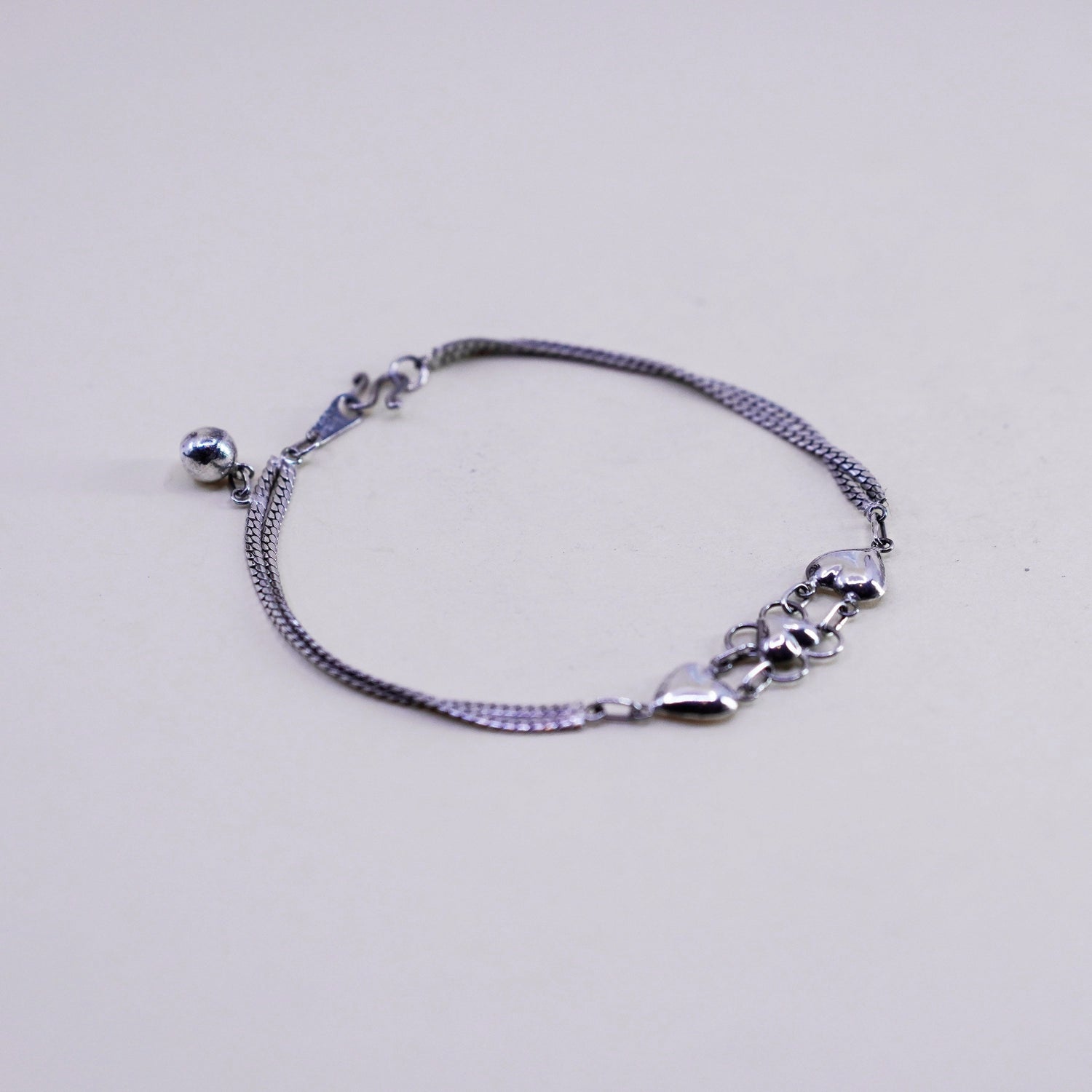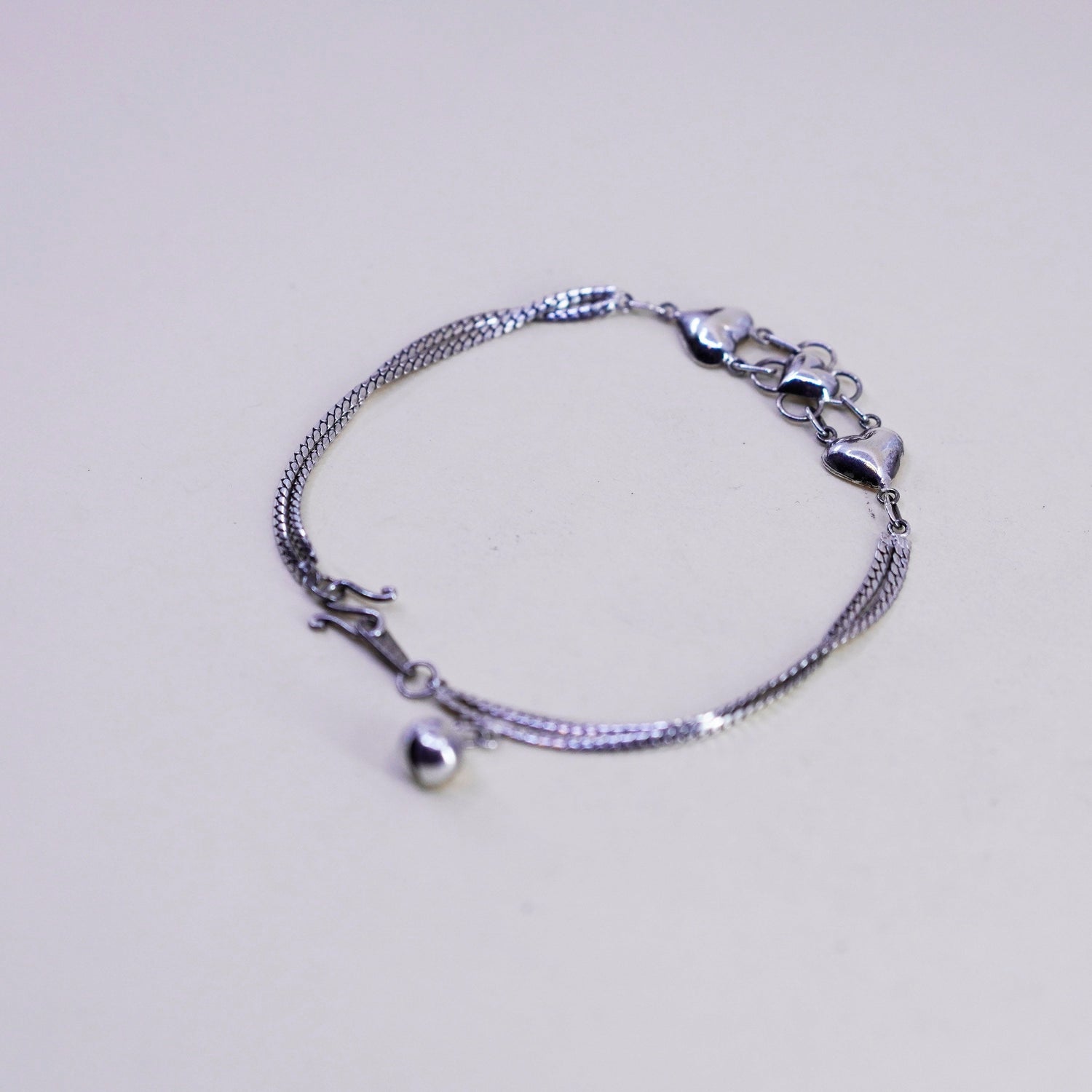 7.5", vintage Sterling Silver Handmade Bracelet, 925 curb chain with heart and bell chime, stamped 925