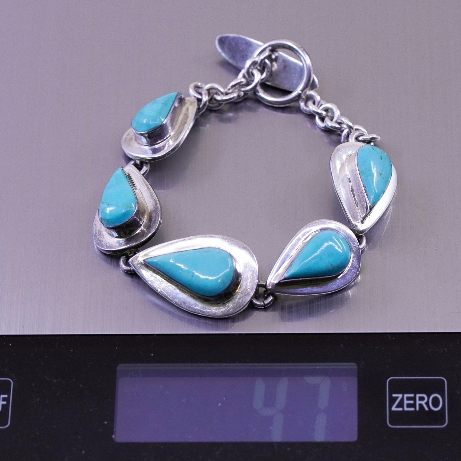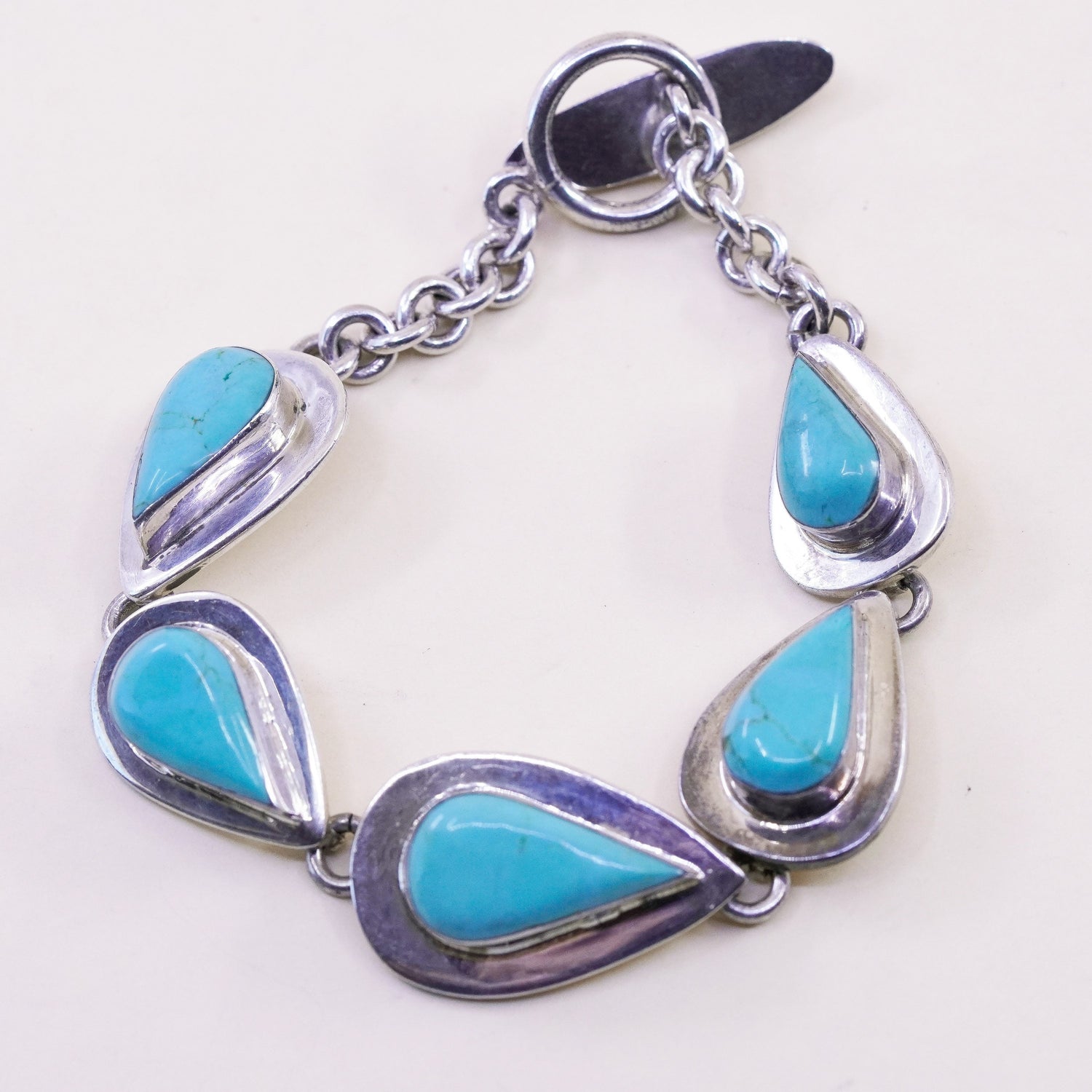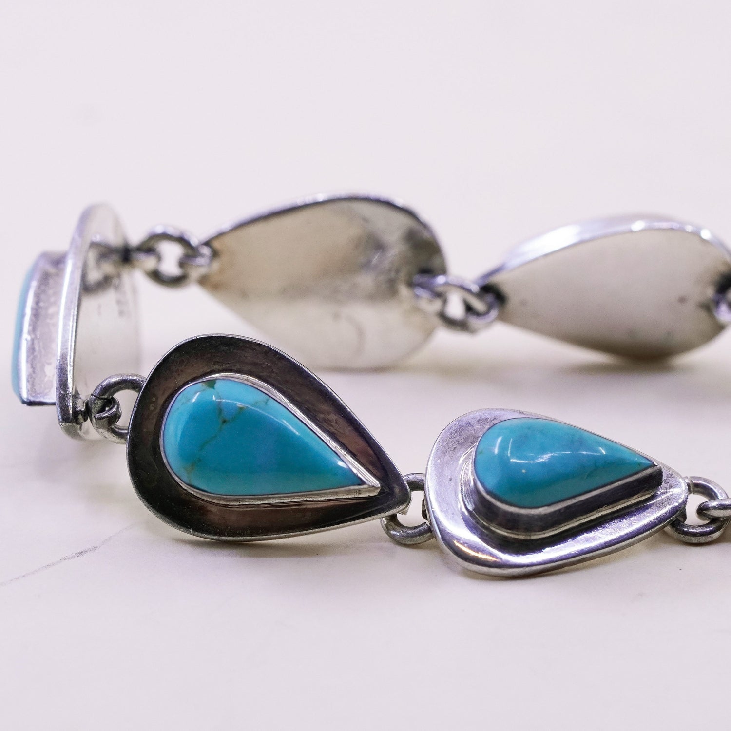 7.5", Vintage Sterling silver handmade bracelet, Mexico 925 chain with teardrop turquoise, stamped 925 Mexico
