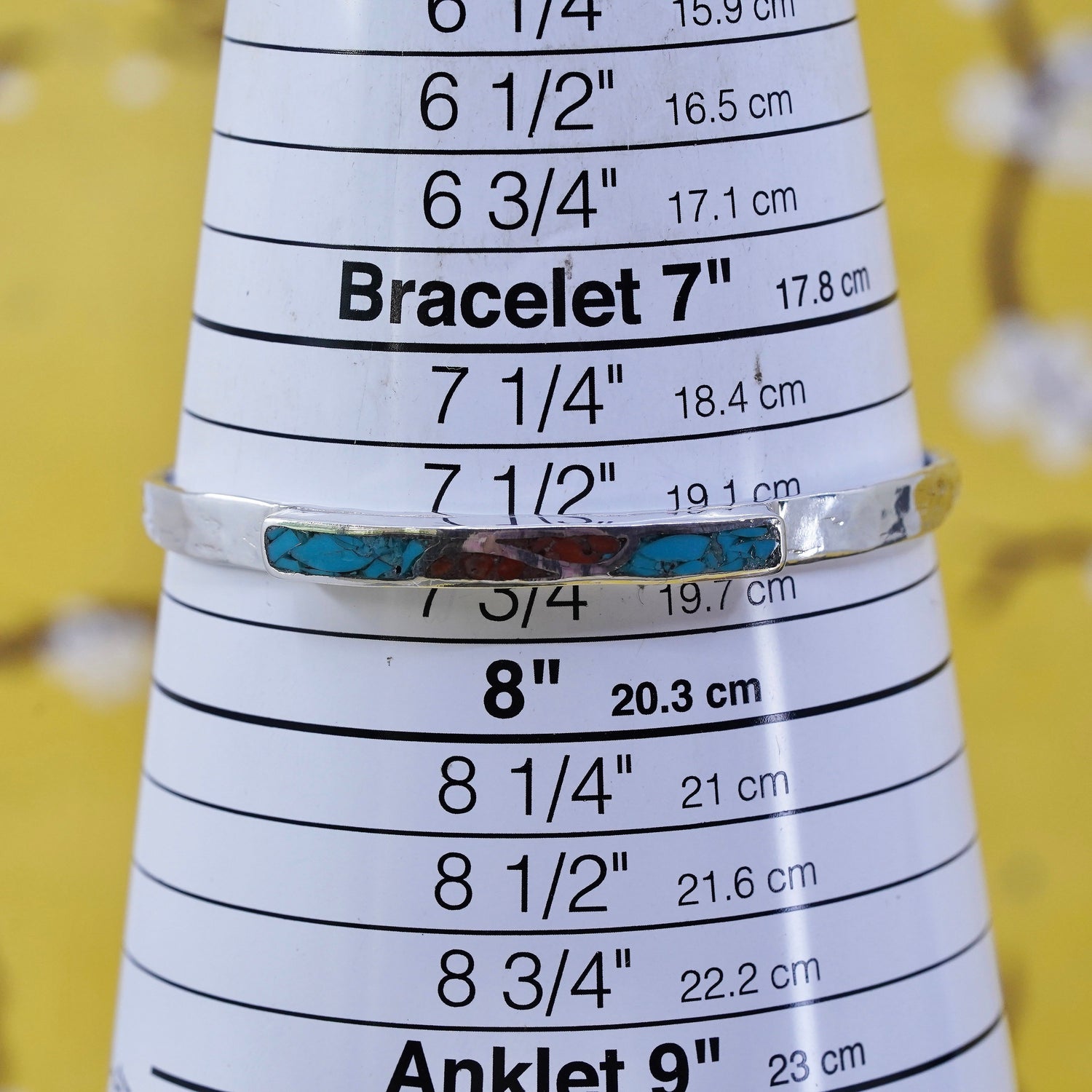 7.75", Vintage Navajo Sterling silver handmade inlay bracelet, Native American, 925 cuff with turquoise and coral, stamped 925