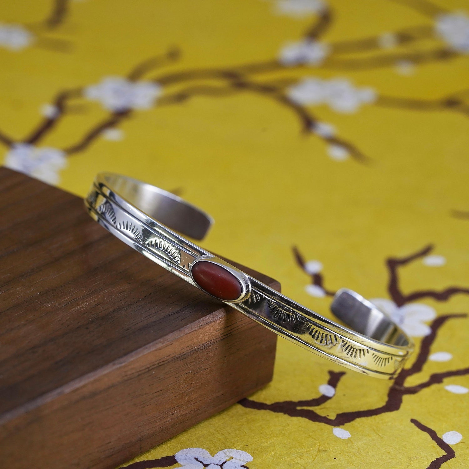 7" Vintage Native American Sterling silver handmade bracelet, jewelry, textured 925 cuff with coral inlay, stamped sterling