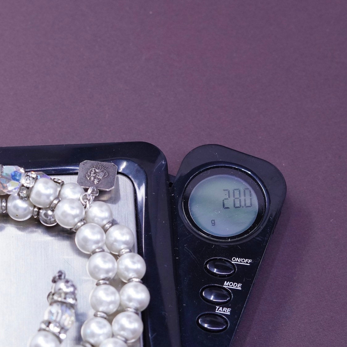 7" Vintage handmade faux pearl beads wrap around bangle bracelet with sterling 925 silver Jesus charm, Stamped 925