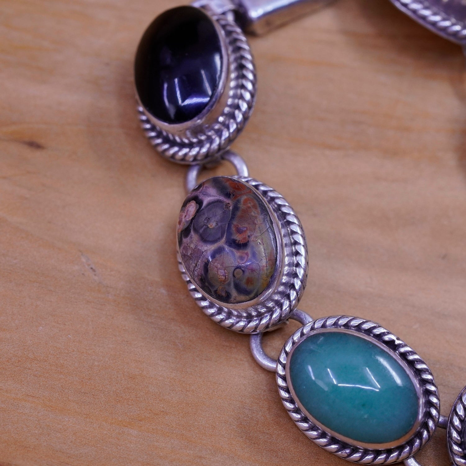 7", Vintage sterling 925 silver handmade carved bracelet, golden tiger eye jasper sodalite jade quartz obsidian, stamped mexico 925 TF-AC