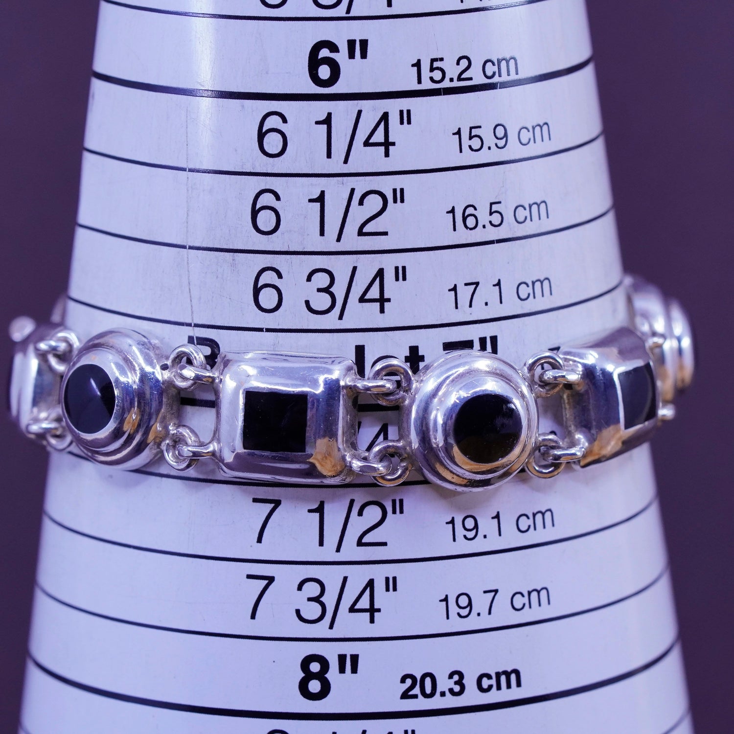 7", vintage Sterling silver handmade bracelet, Mexico 925 circle square chain with onyx, stamped Mexico 925 TJ-72