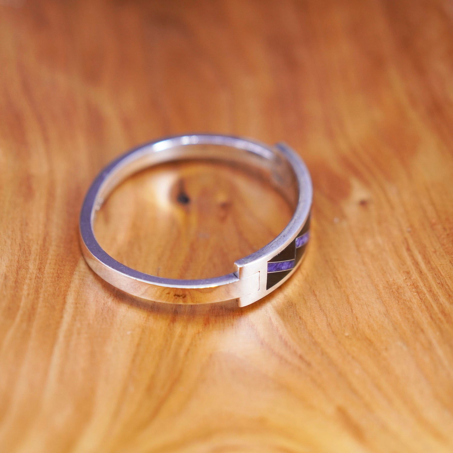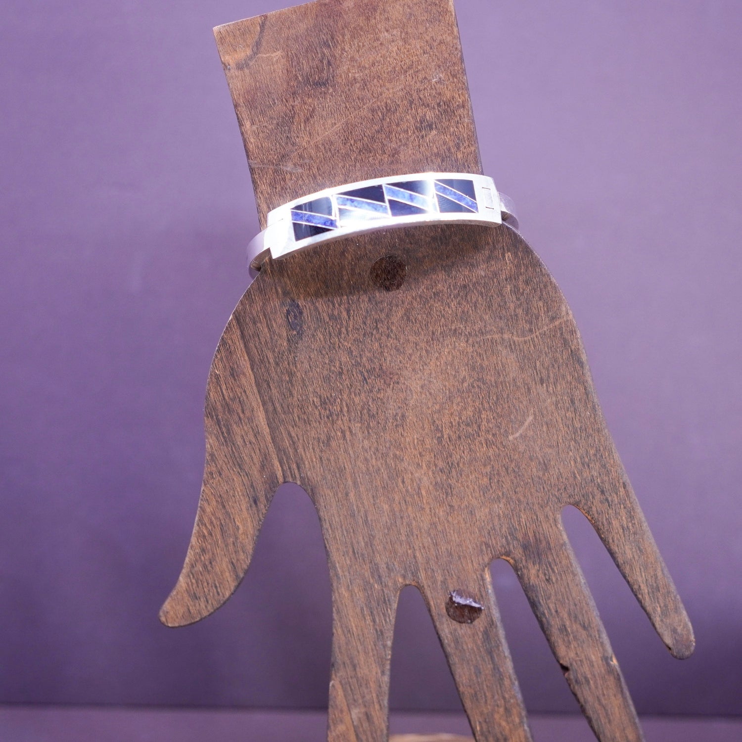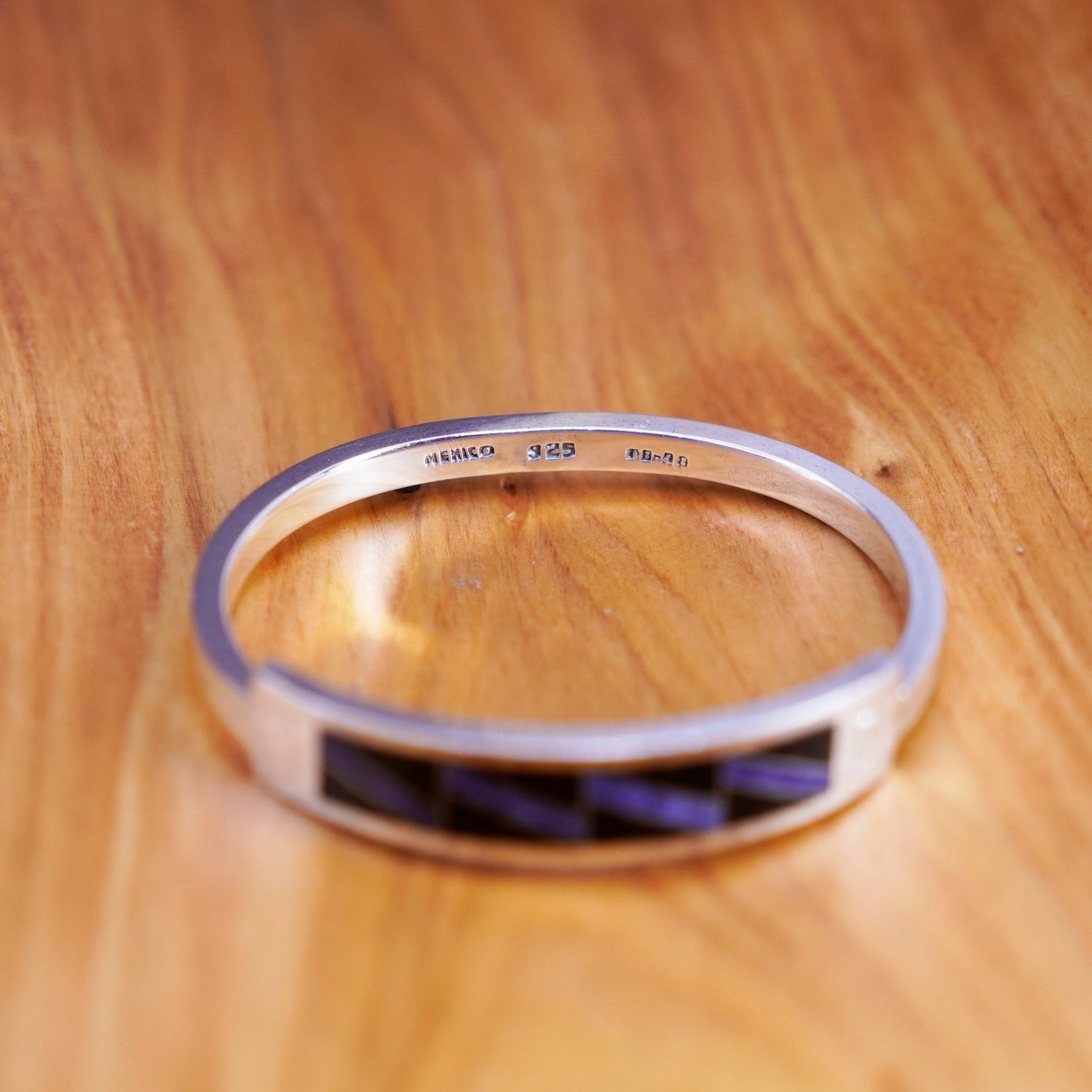 7", Vintage Sterling silver handmade bracelet, Mexico 925 hinged bangle with sodalite and onyx inlay, stamped 925 Mexico TB-98