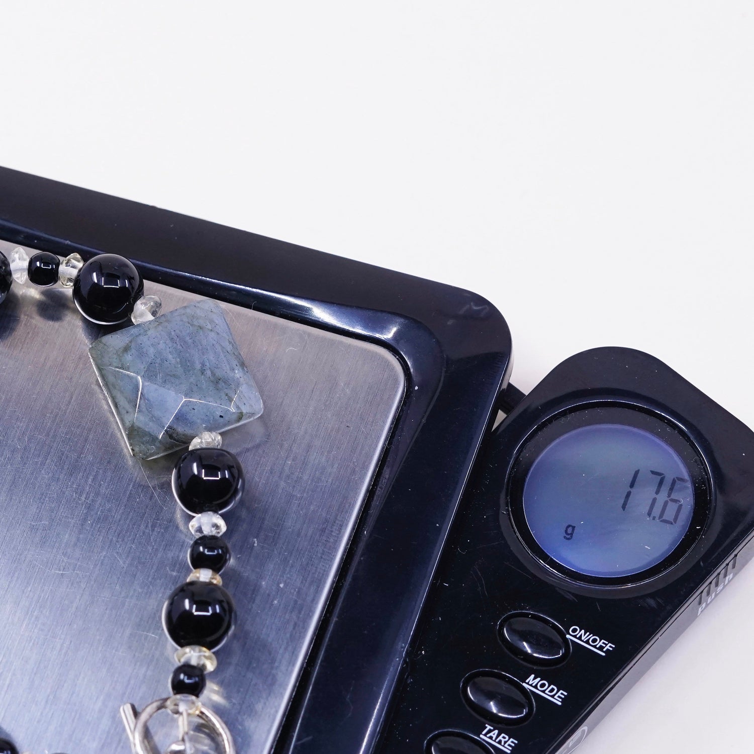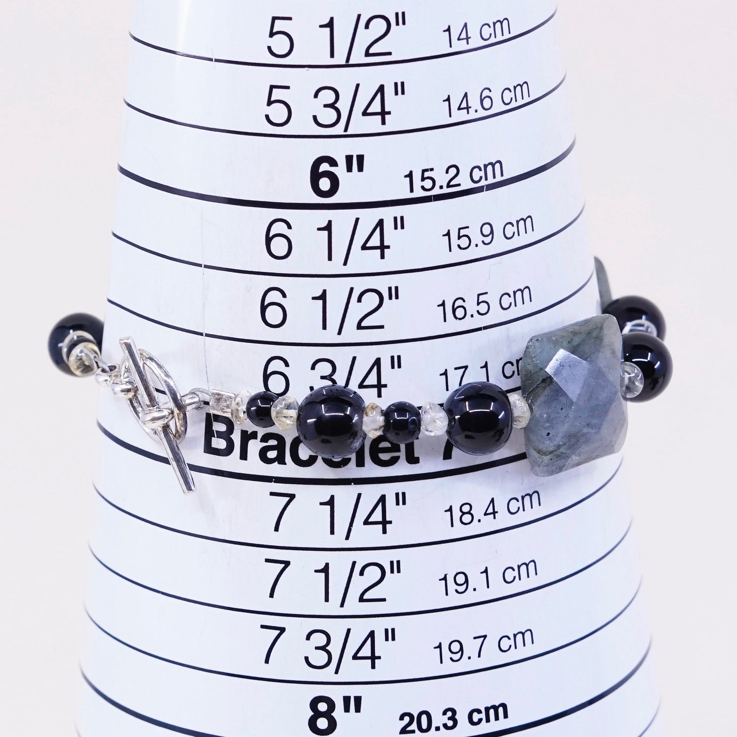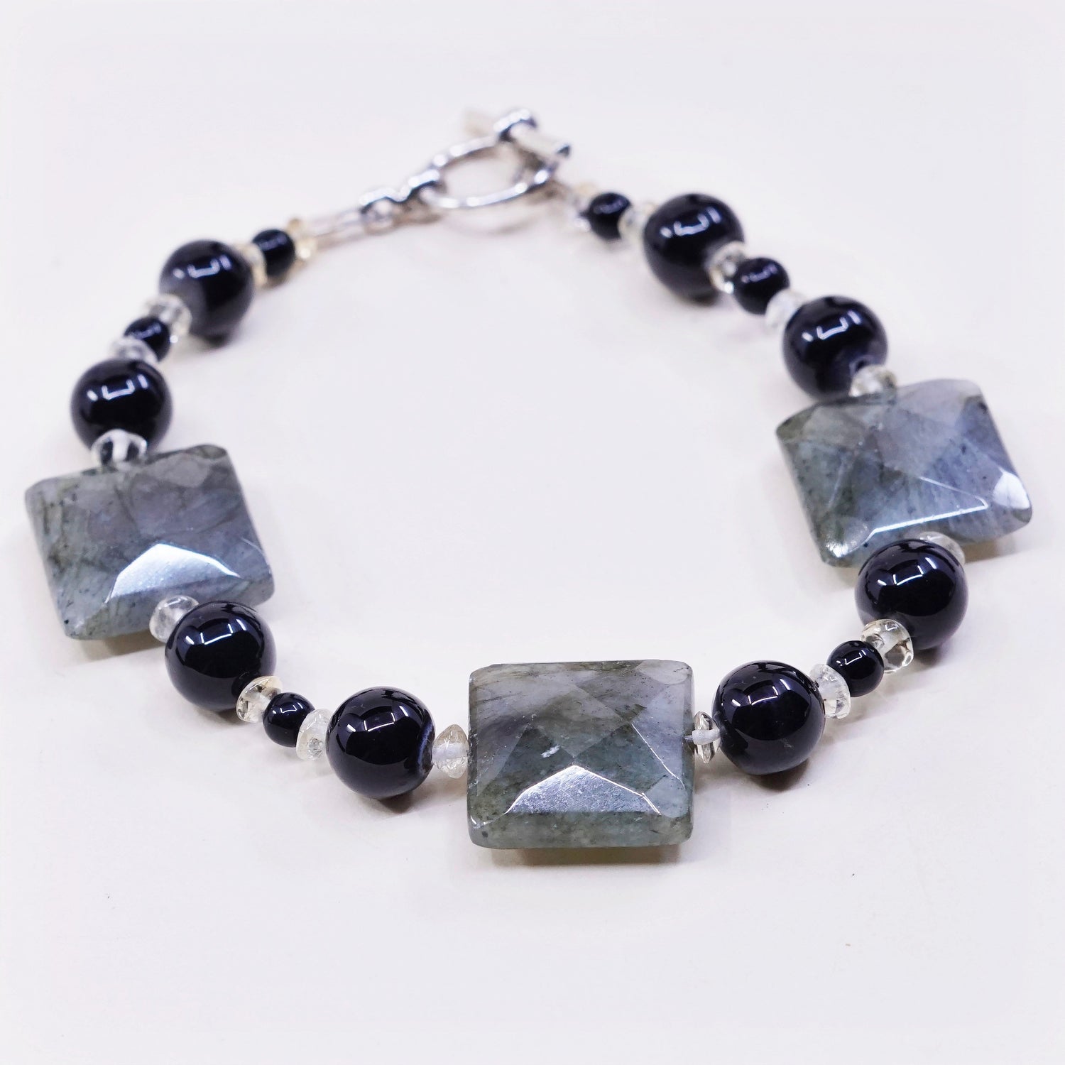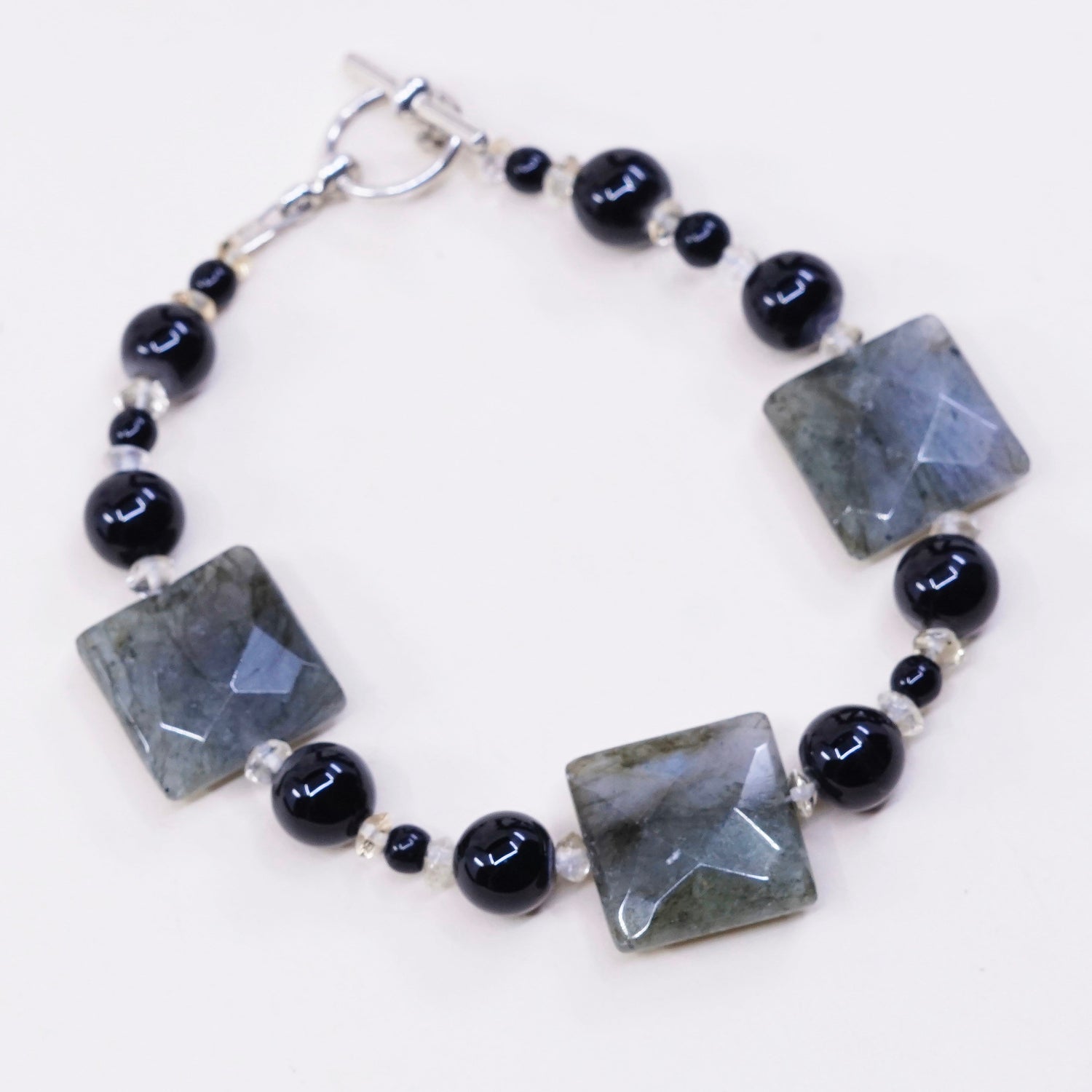 7", Vintage handmade bracelet with square labradorite and obsidian, silver tone toggle closure