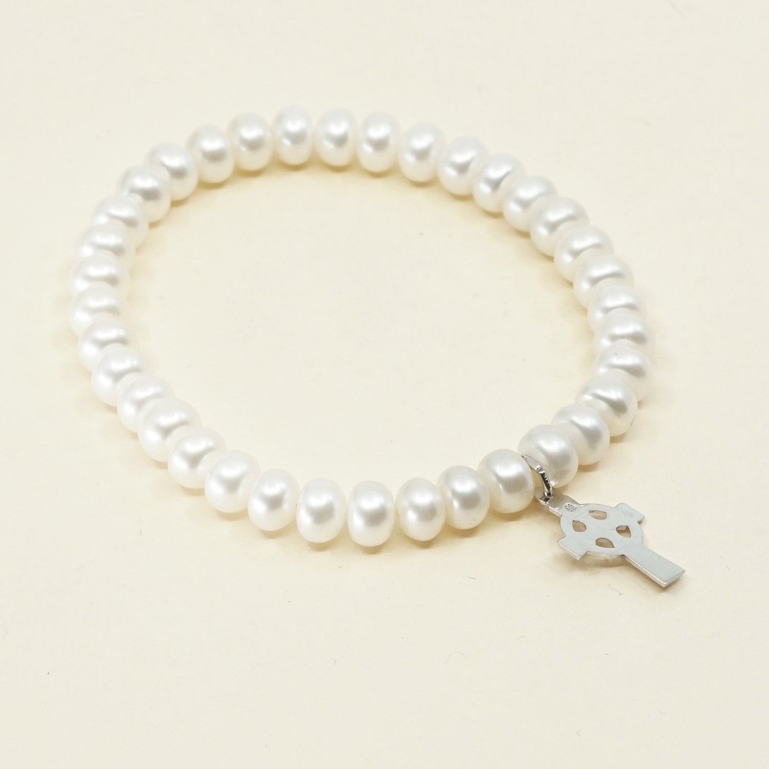 7", VTG handmade bracelet, pearl beads w/ elastic band and 925 cross charm