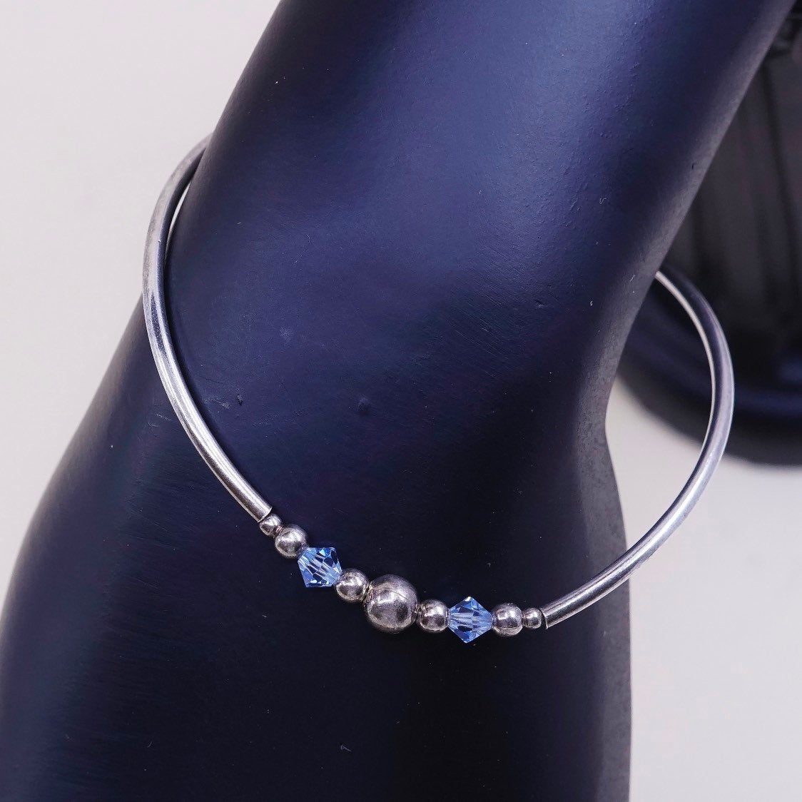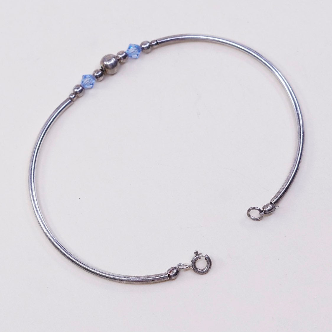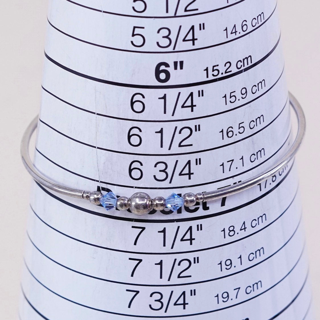 7", Vintage sterling silver handmade bracelet, 925 silver bangle with beads and blue crystal, Stamped 925