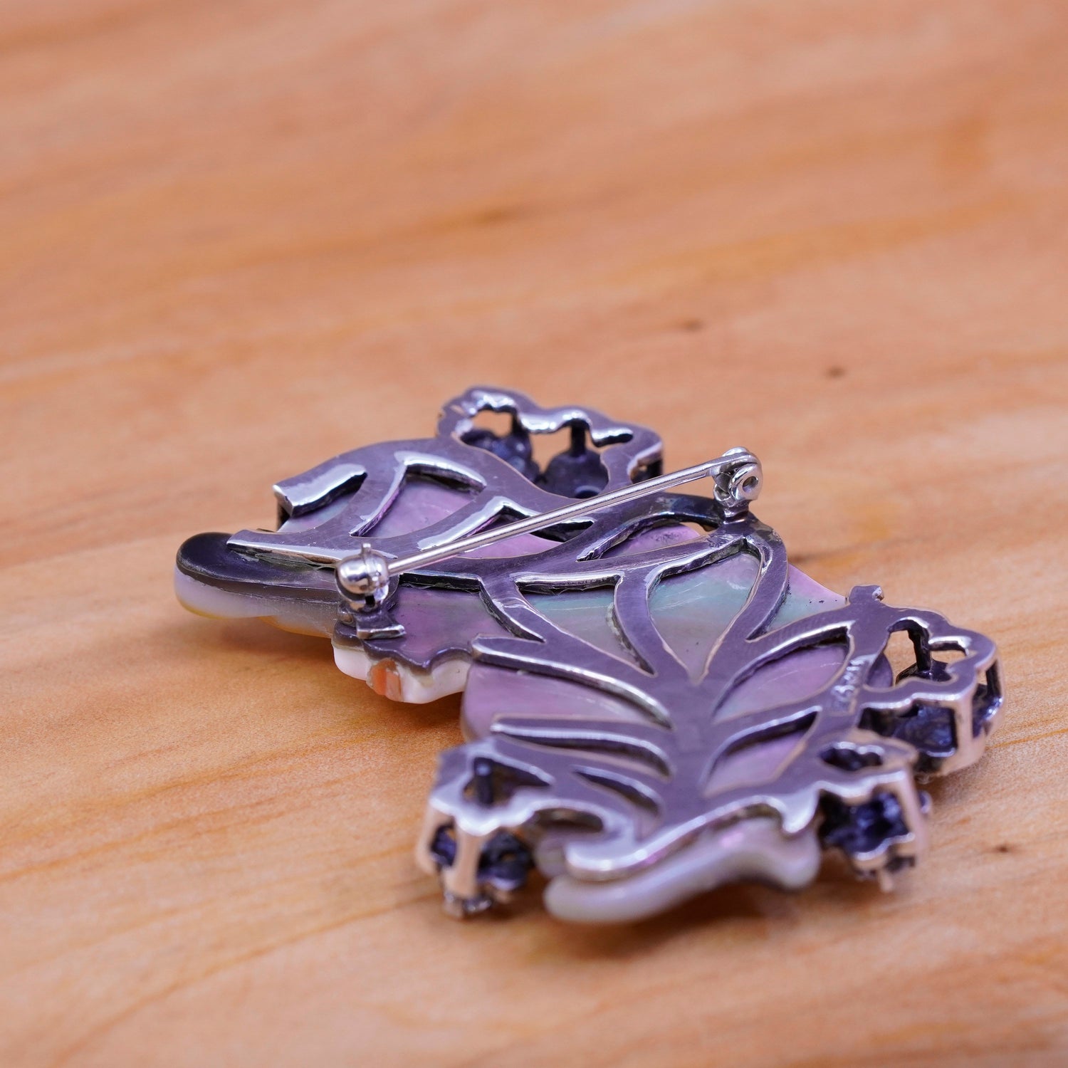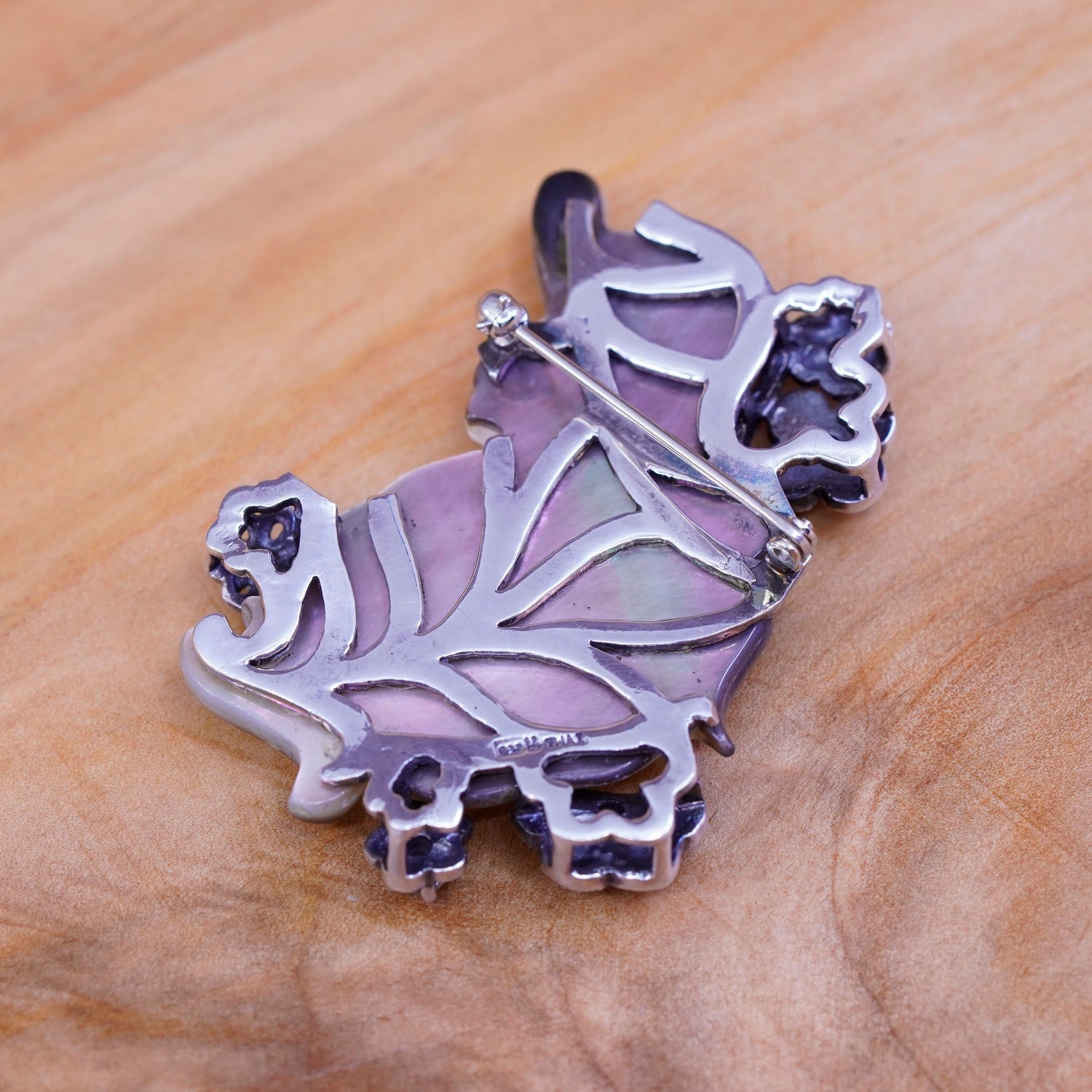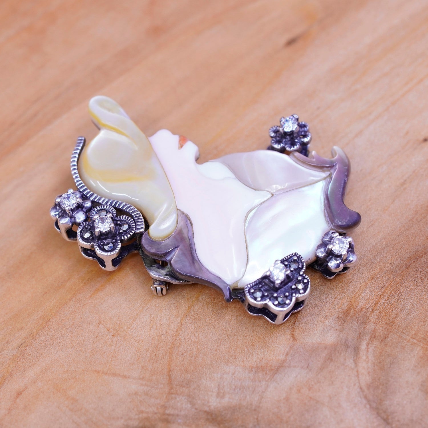 Vintage antique southwestern handmade sterling 925 silver woman portrait brooch with mother of pearl, Stamped 925 SU