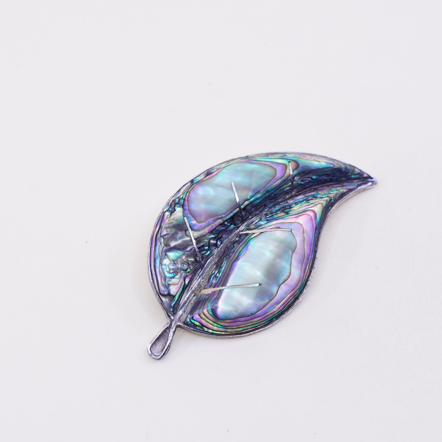 Antique Sterling silver handmade brooch, 925 leaf pin with abalone inlay