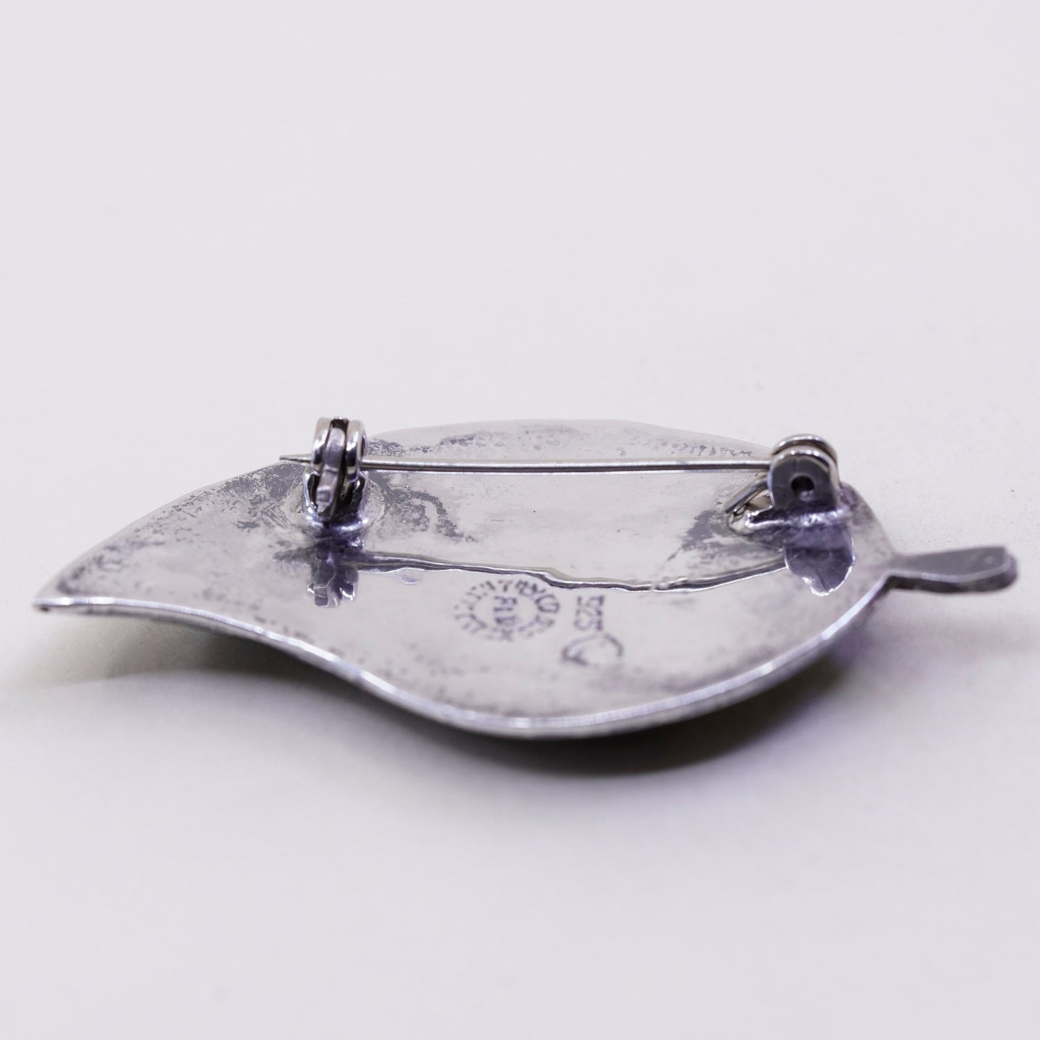 Antique Sterling silver handmade brooch, 925 leaf pin with abalone inlay, stamped 925 Mexico, signed PLD