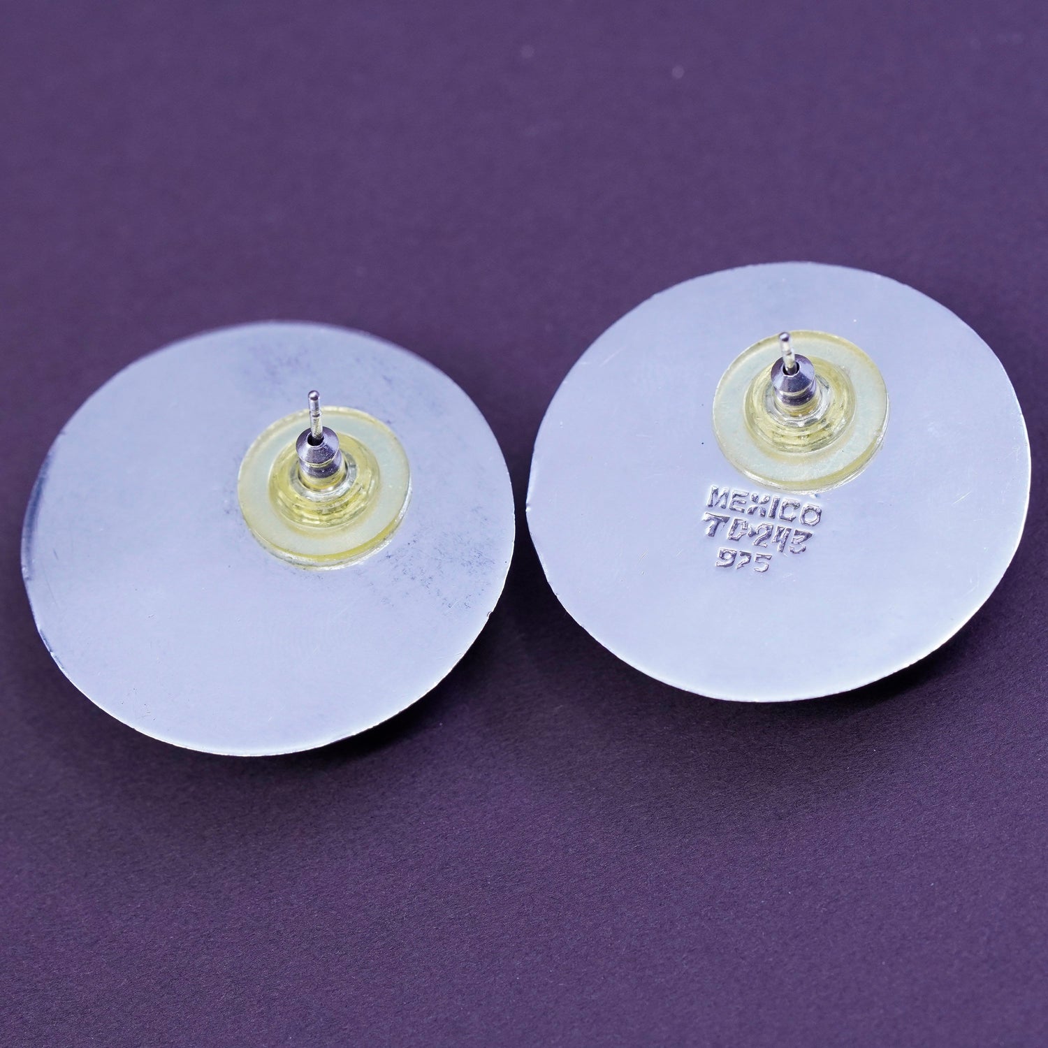 Vintage mexico Sterling silver earrings, studs, huge 925 round studs with green malachite inlay stamped 925 mexico TC-243