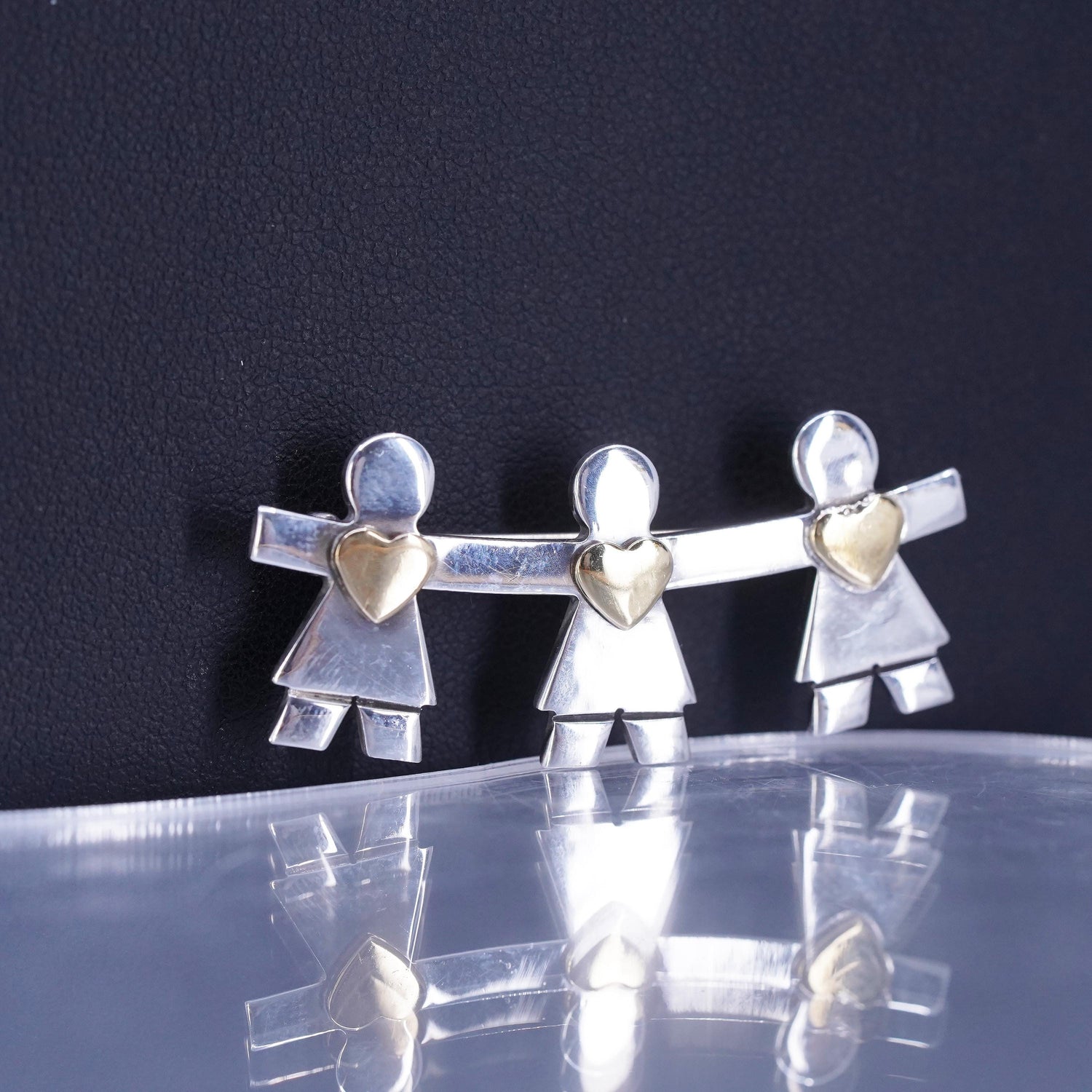 Naldo two tone sterling silver handmade brooch, three girls holding hands with gold heart, 925 silver pin, stamped 925 sterling, signed