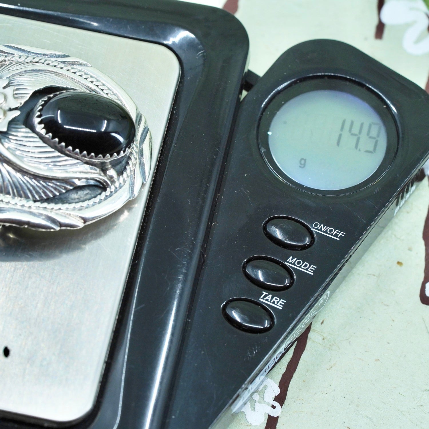 Native American Navajo Timothy Lee sterling silver floral feather brooch, 925 oval pendant with onyx, stamped Sterling Timothy Lee