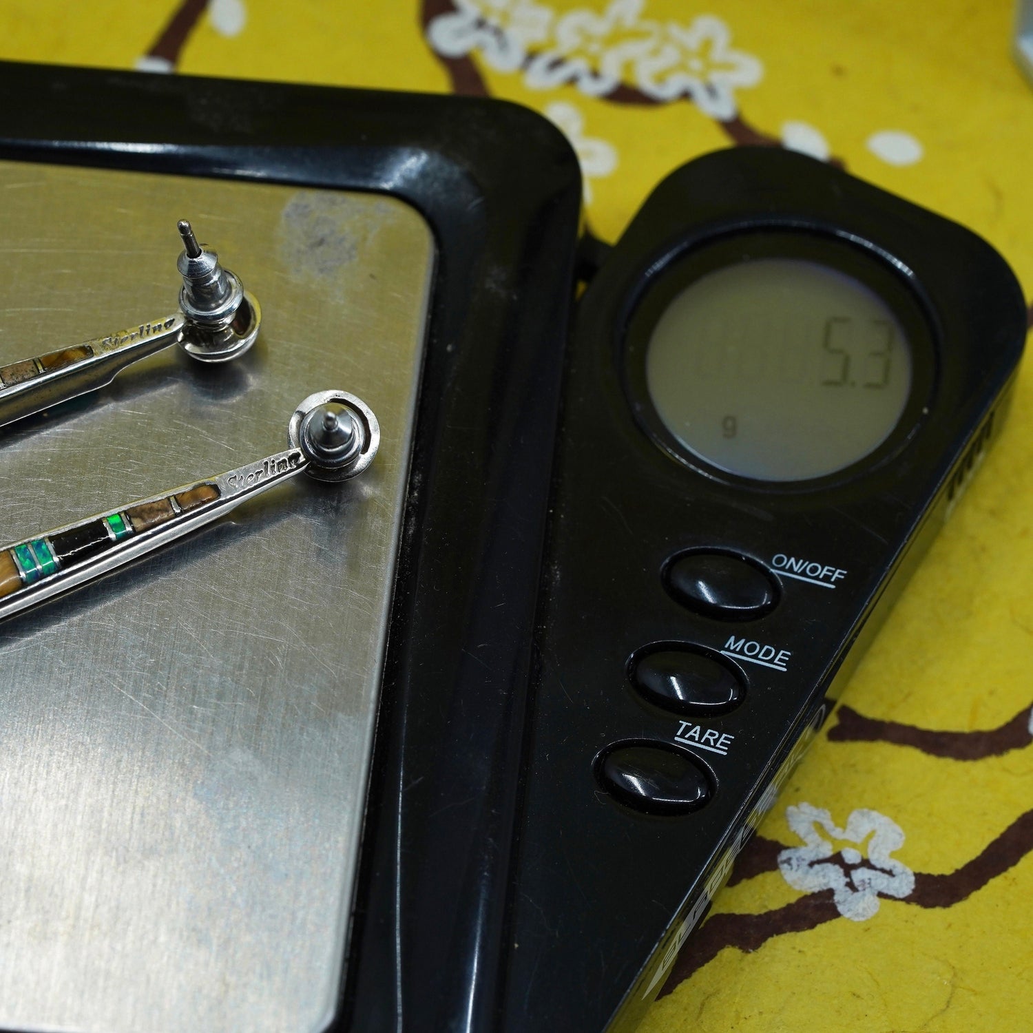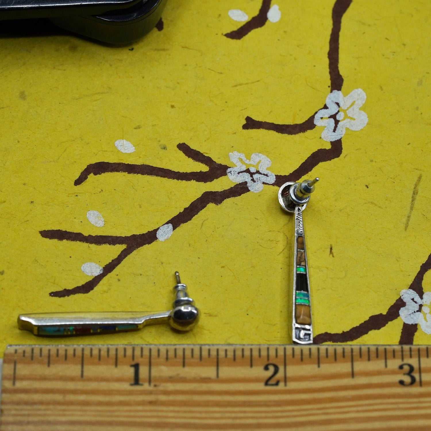 Vintage Native American sterling silver handmade earrings, zuni 925 double sided teardrop with turquoise and opal inlay, stamped Sterling