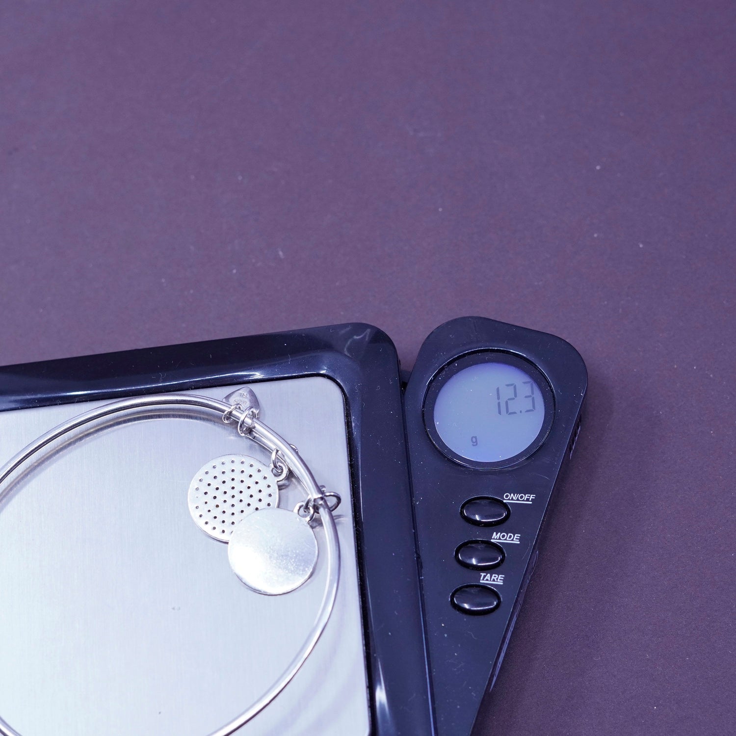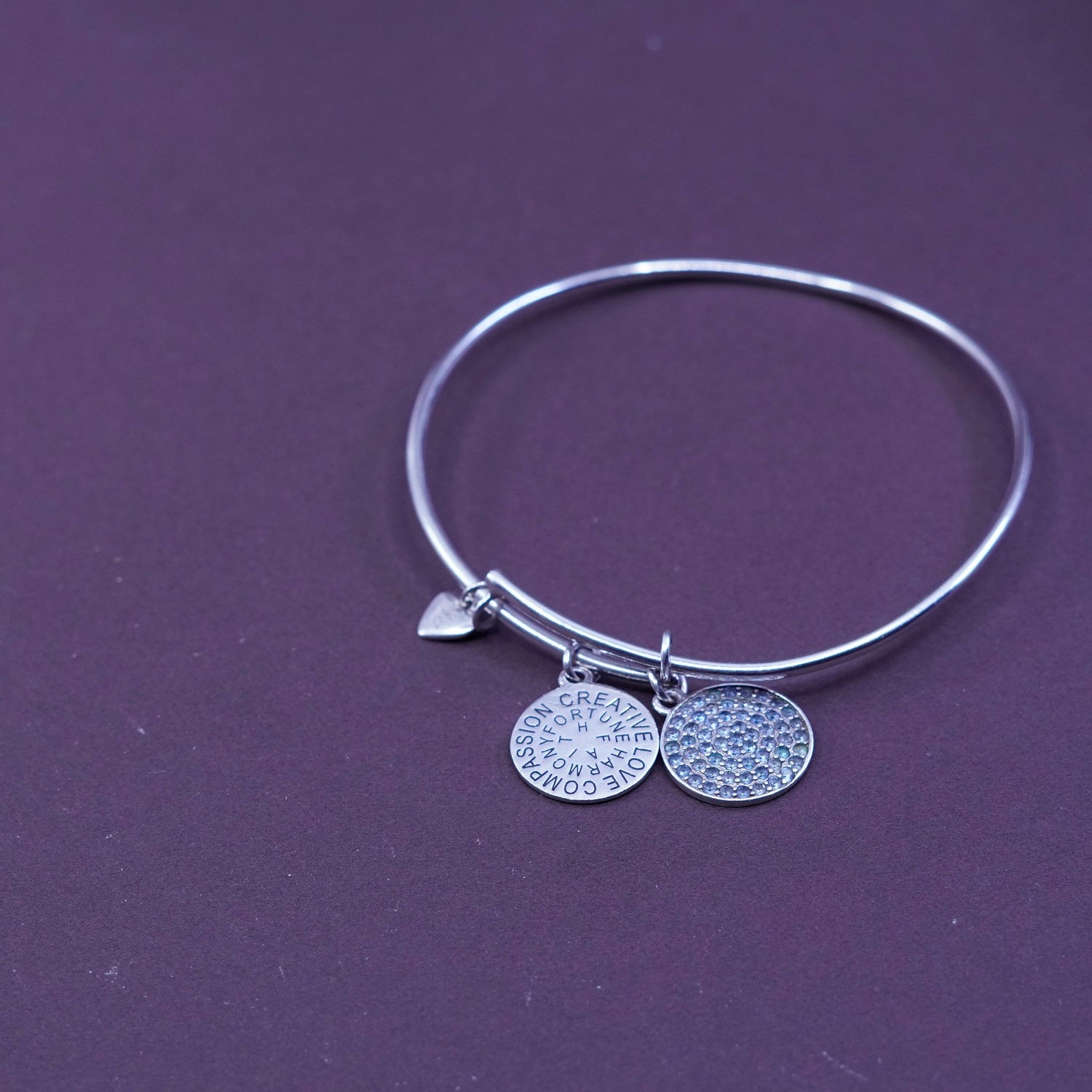 Size adjustable, ralph lauren Sterling 925 silver handmade bracelet bangle with two charms engraved "creative love compassion harmony fortune faith" and topaz, stamped 925 RL