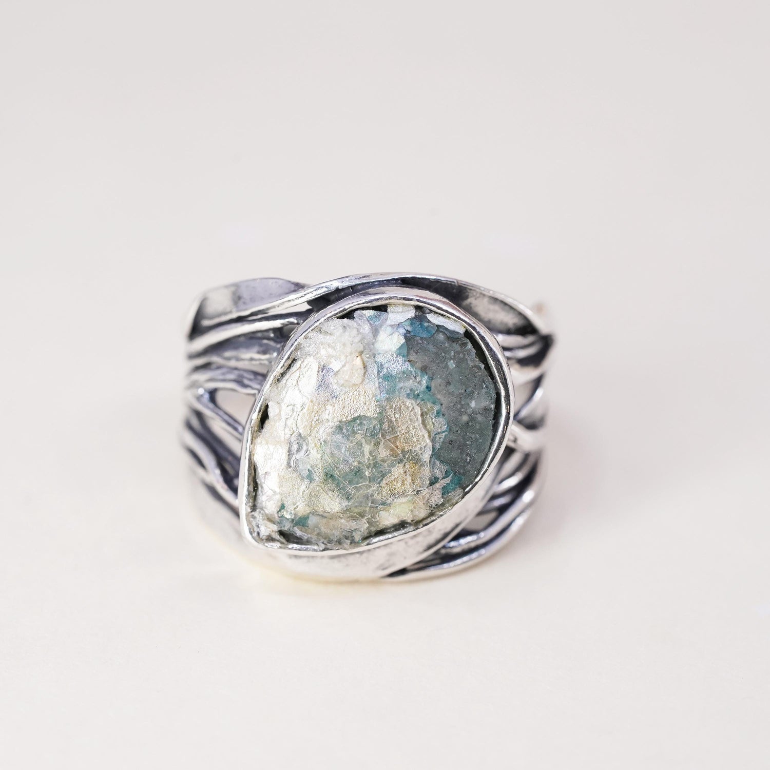Size 10.25, Israel Pz Or Paz Sterling 925 silver ring teardrop Roman glass