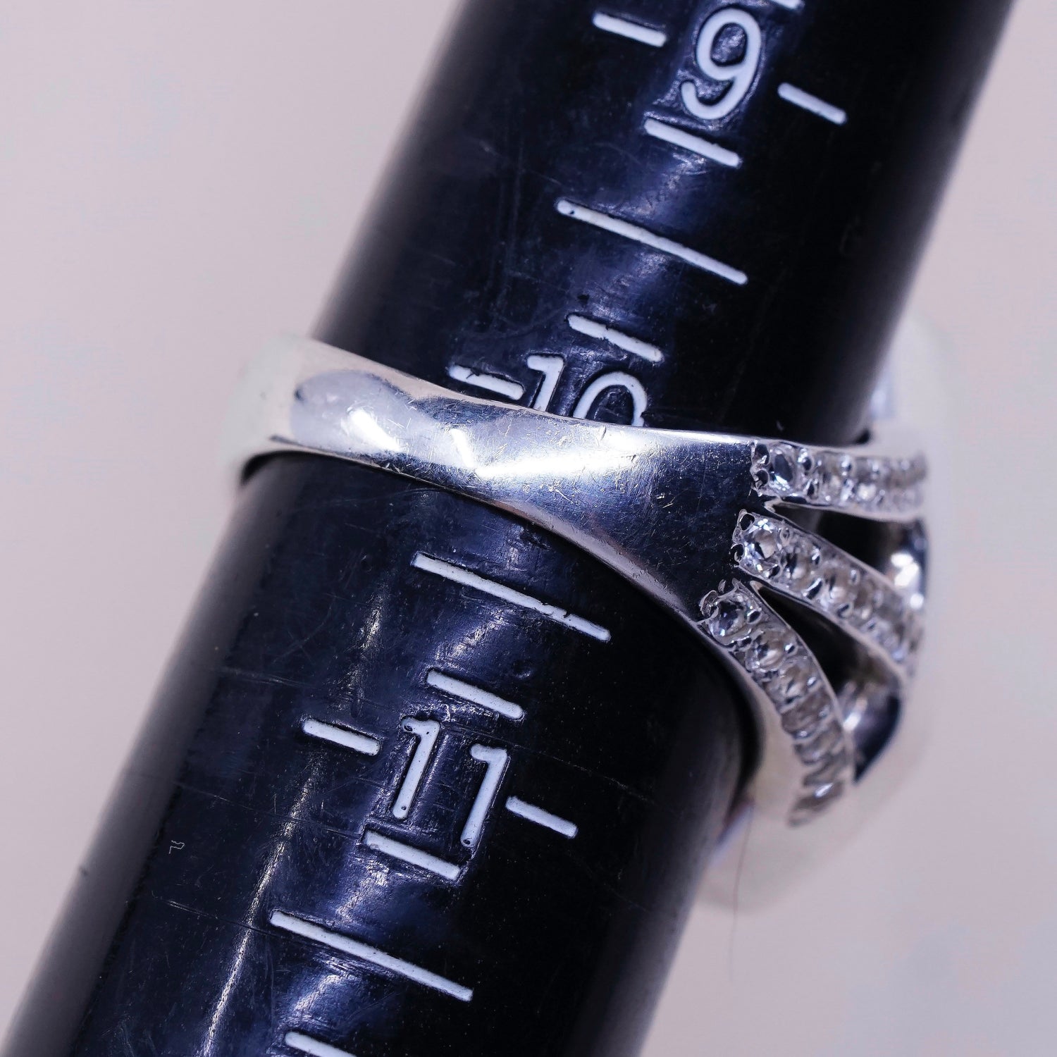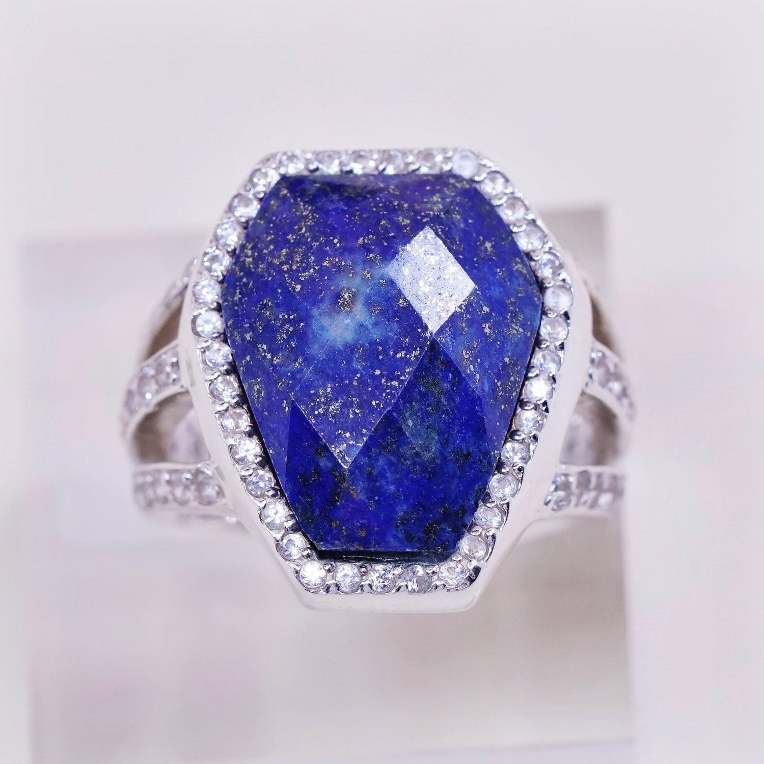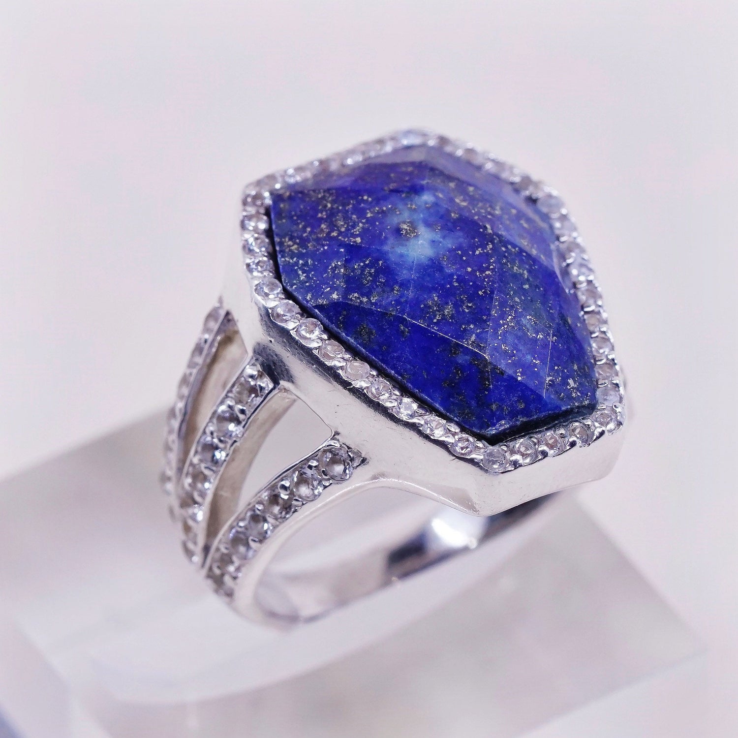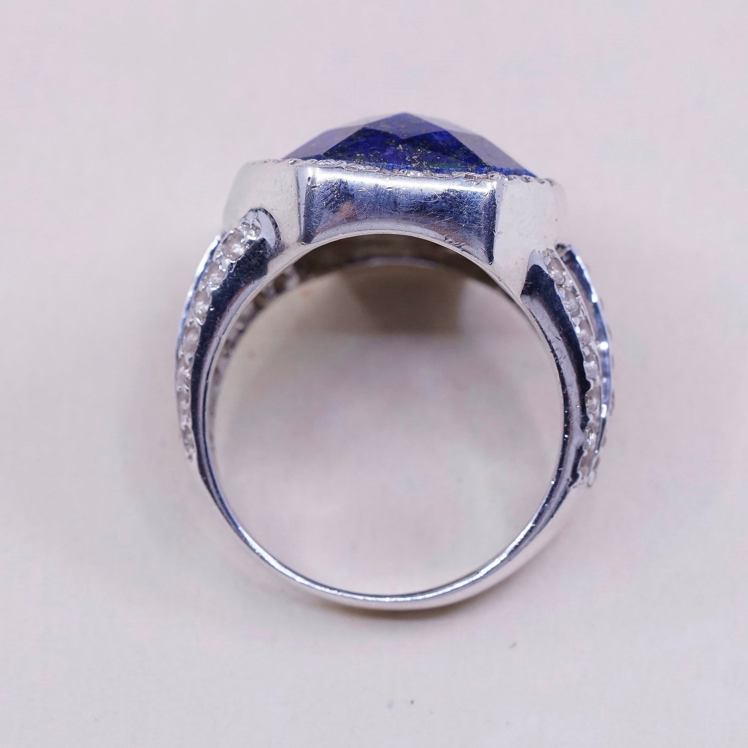 Size 10, vintage sterling 925 silver handmade ring with Lapis lazuli and Cz around, Stamped 925