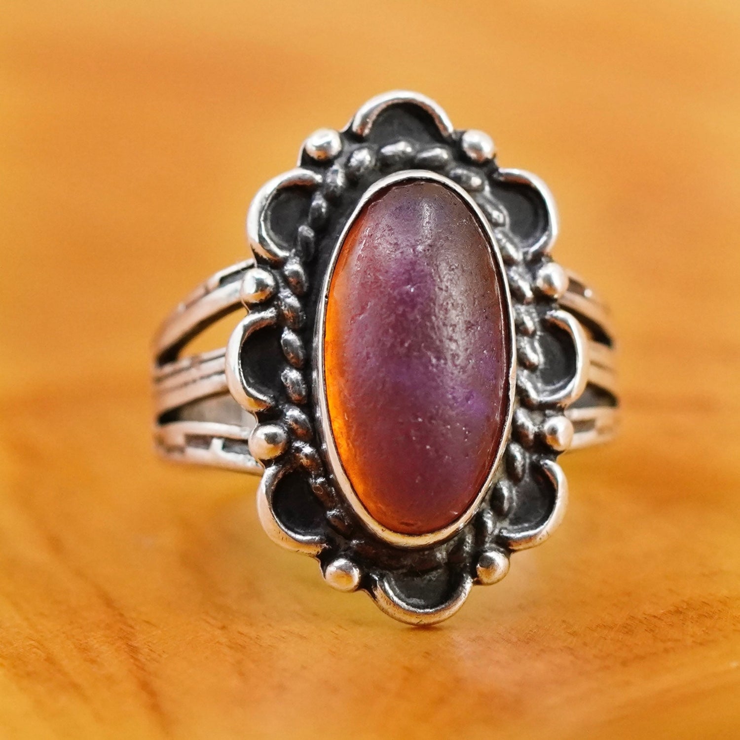 Size 5.5, vintage Sterling 925 silver handmade statement ring, Native American, Navajo with dragon breath glass, stamped Sterling