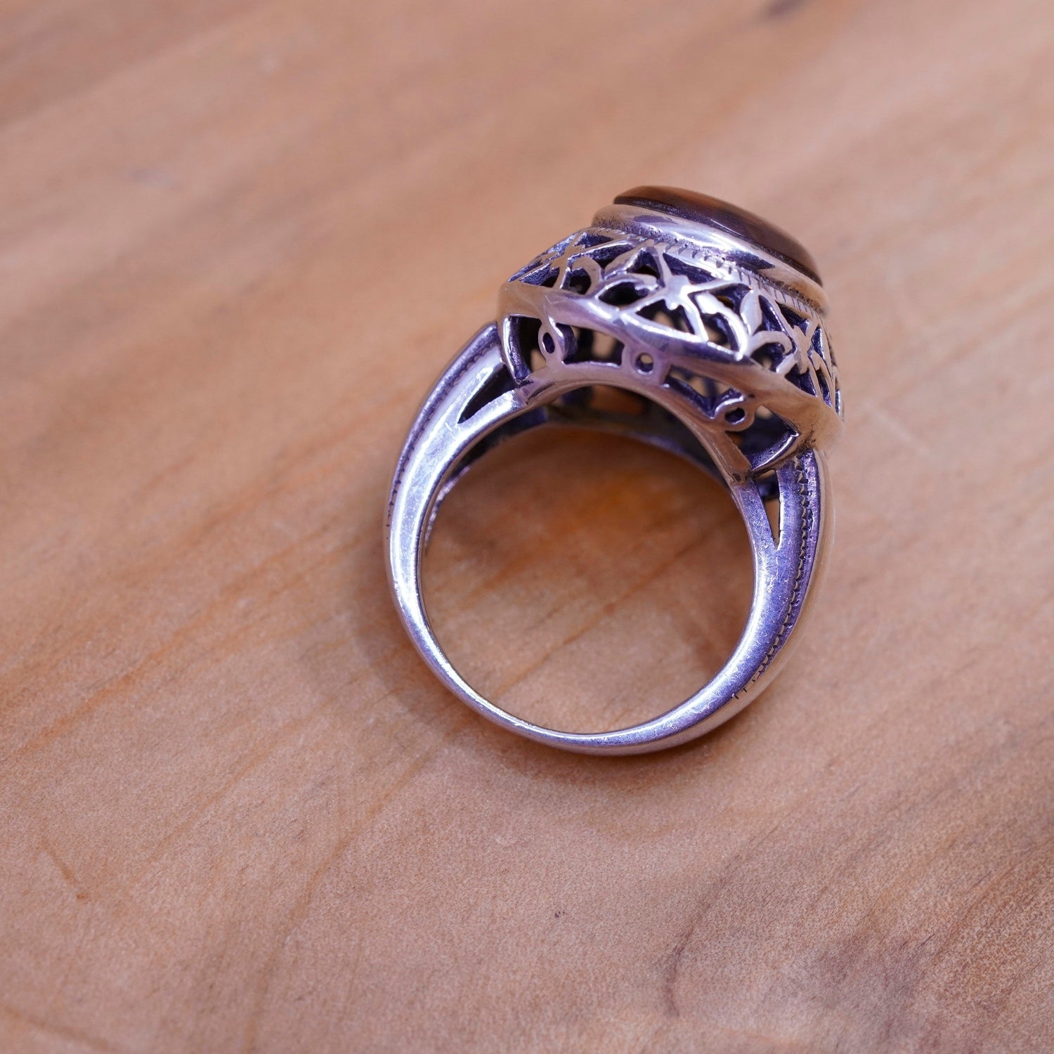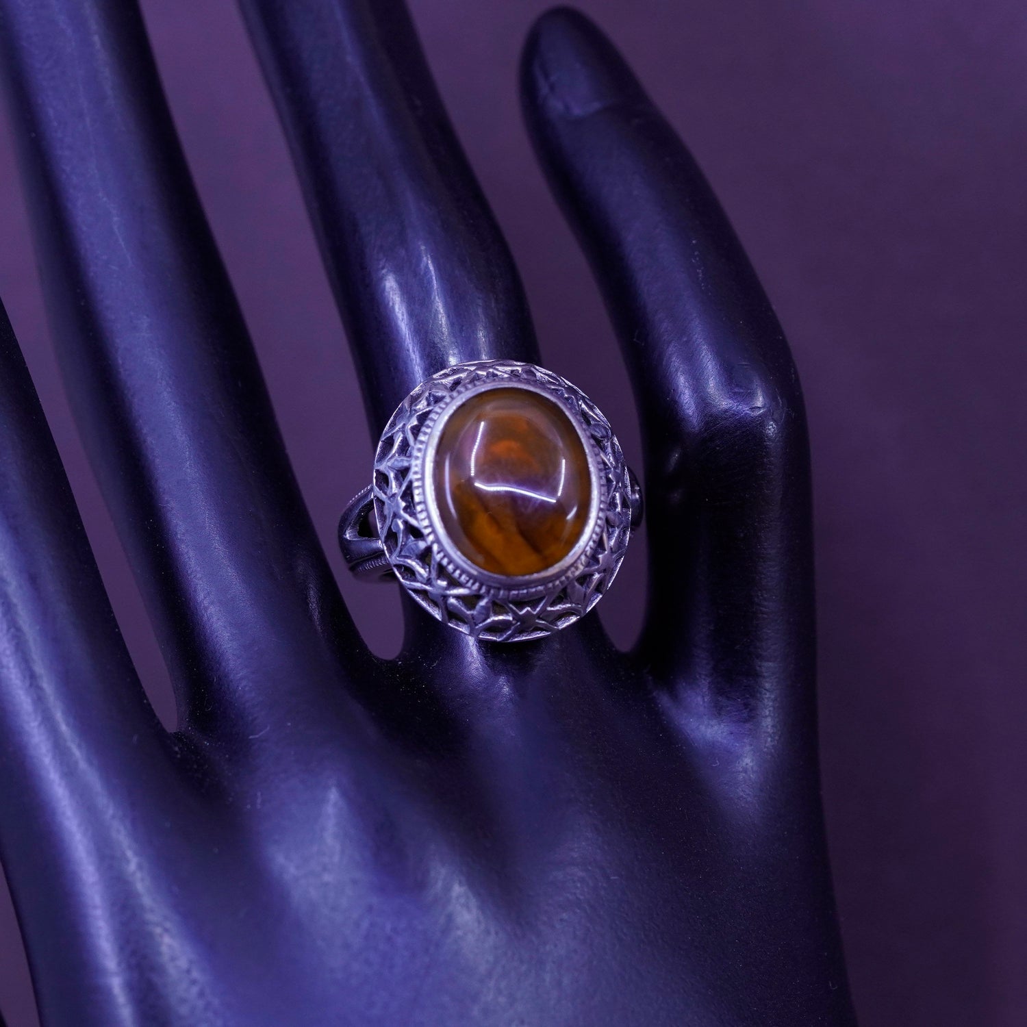 Size 6.25, vintage Sterling 925 silver handmade filigree ring with oval Amber