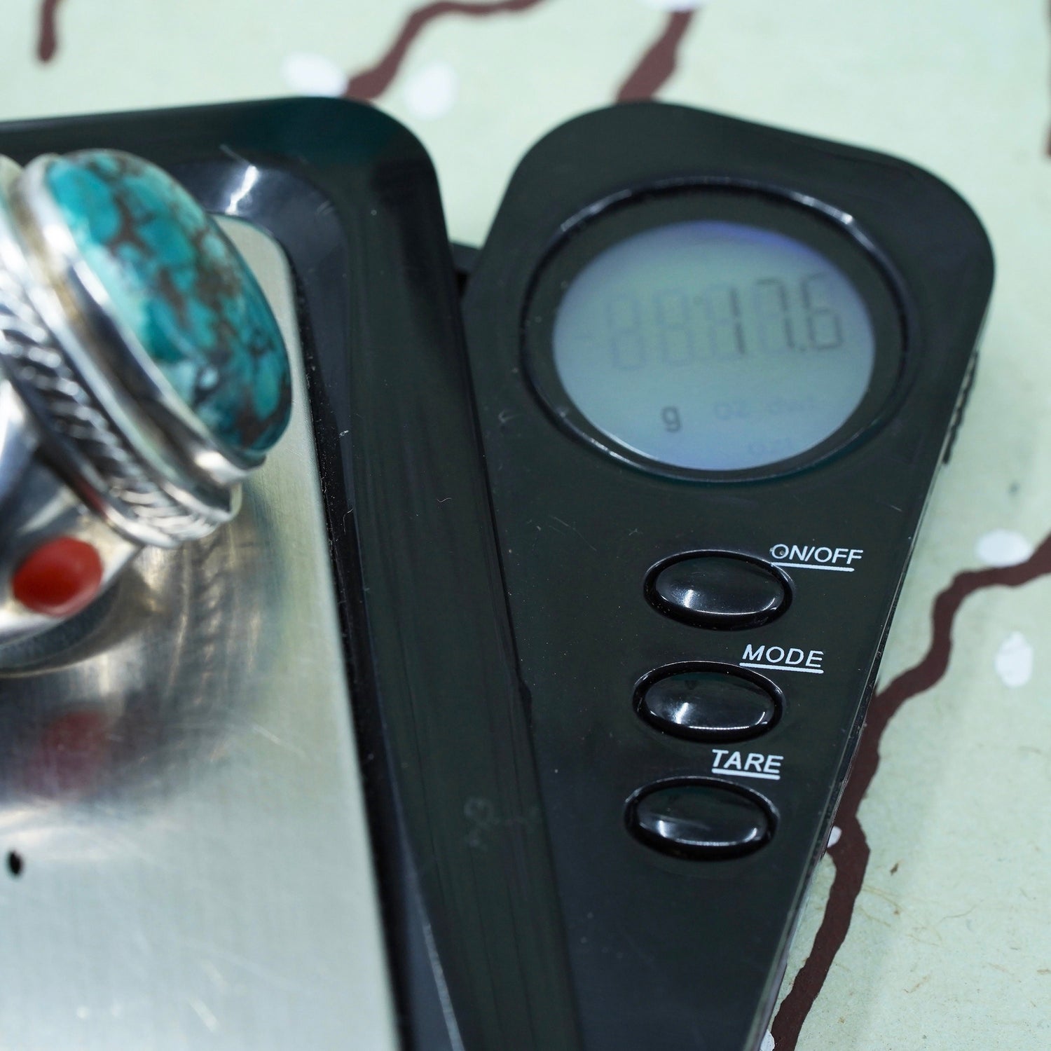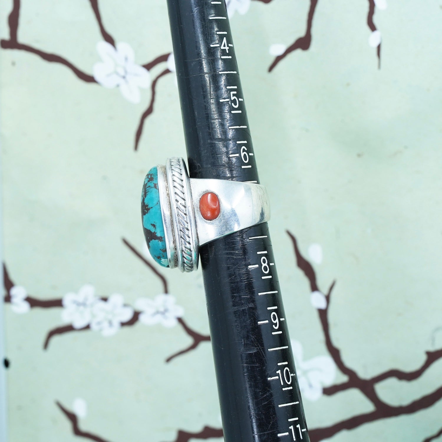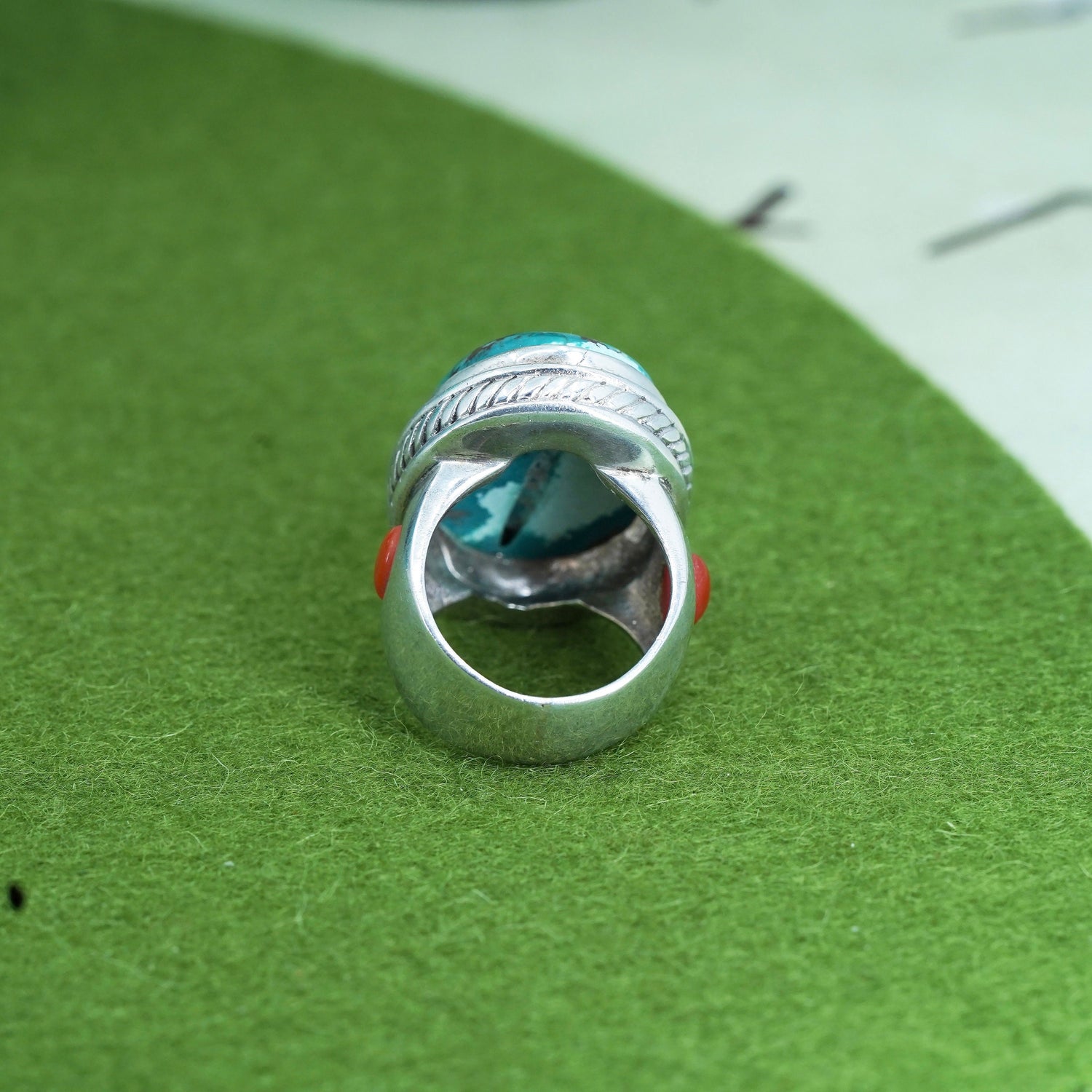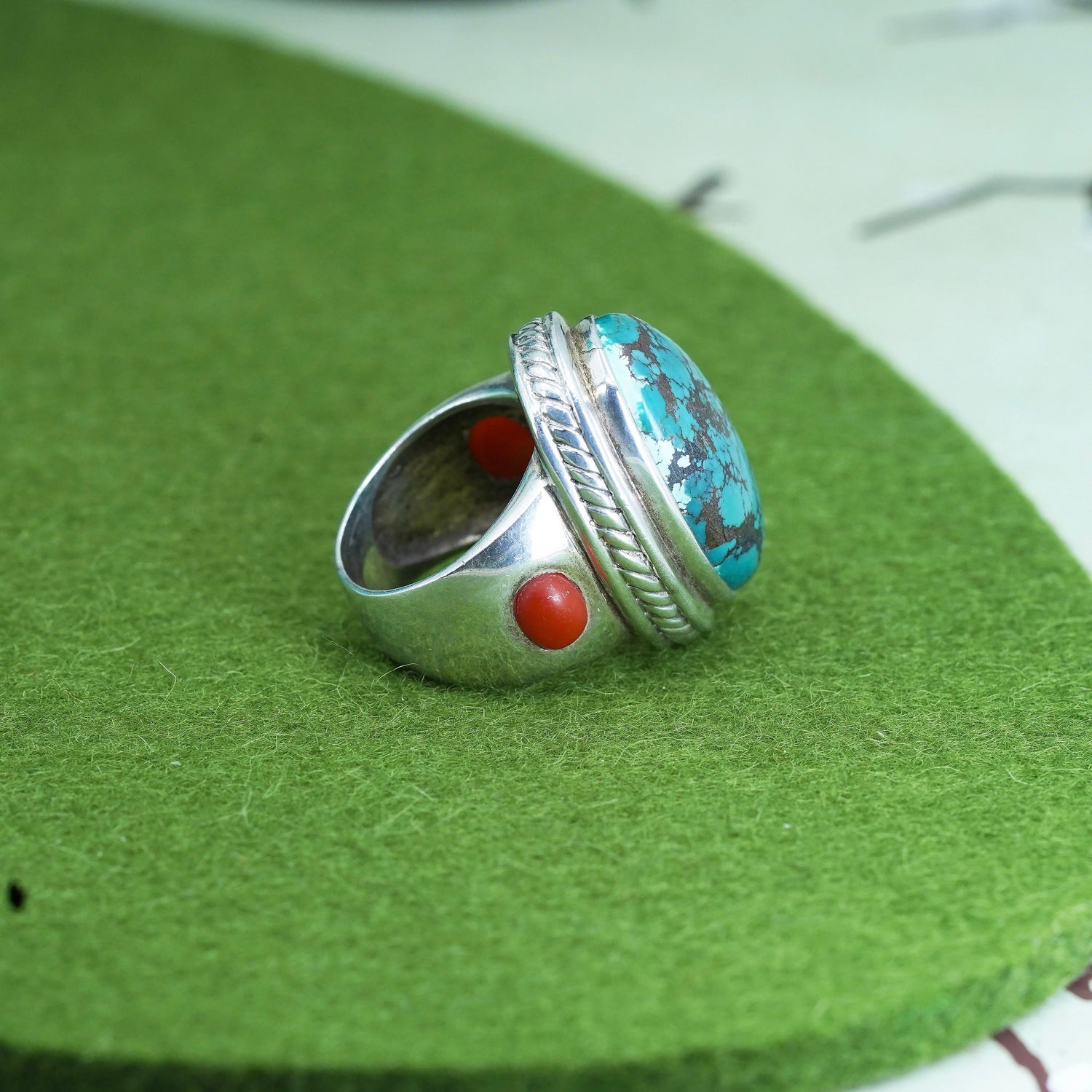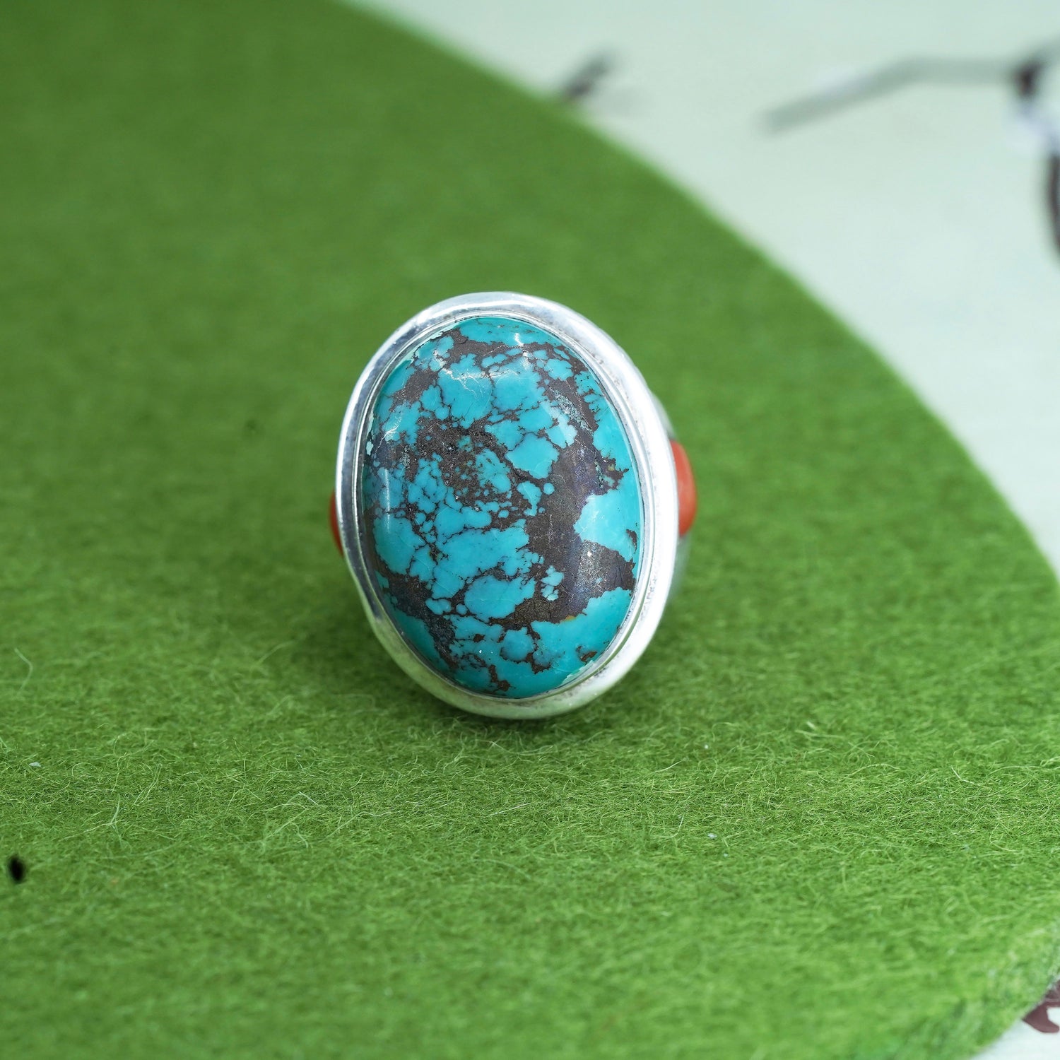Size 6.5, Navajo sterling silver handmade Native American 925 statement ring with oval kingsman spiderwebbed turquoise and coral, stamped 925