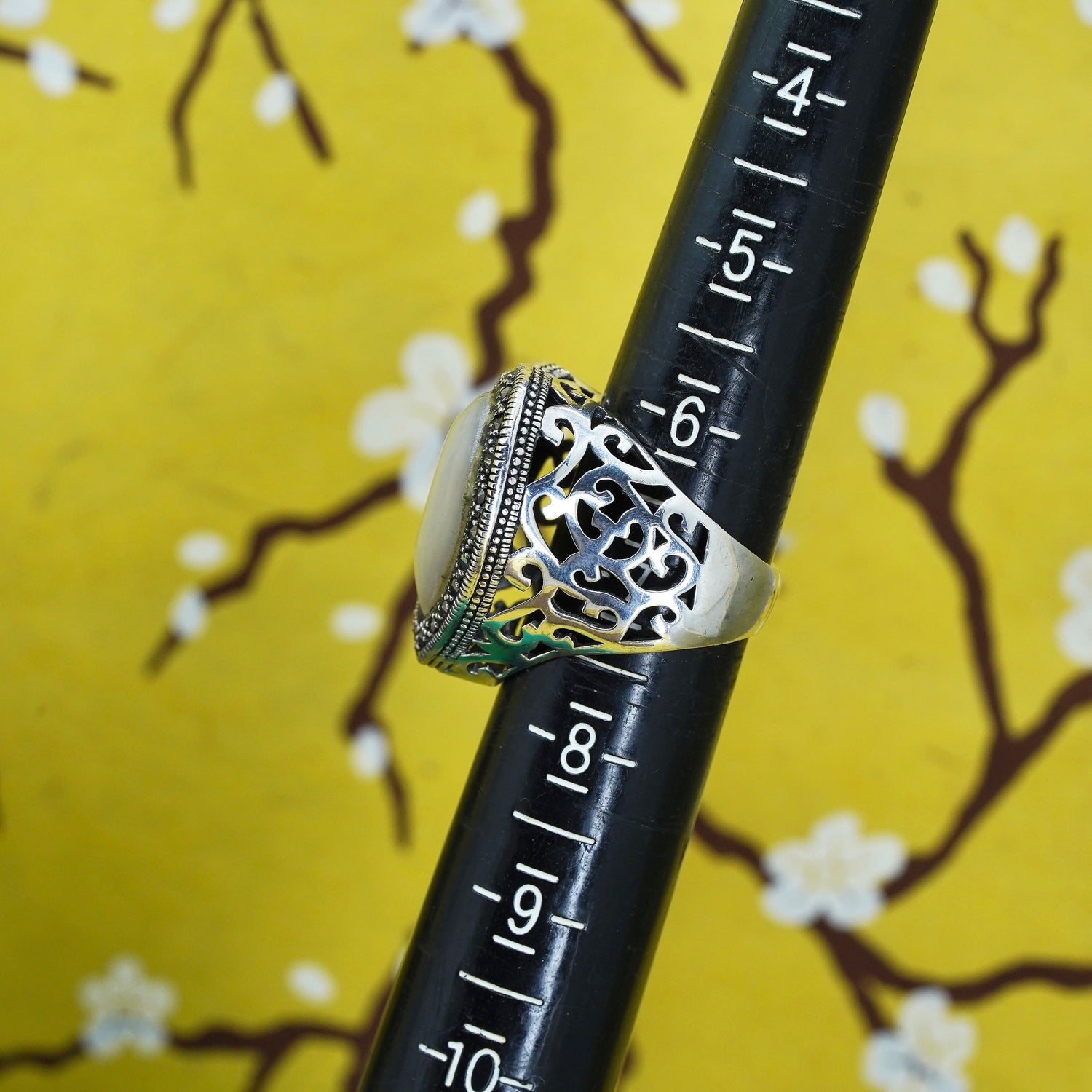Size 6.5, vintage Sterling 925 silver handmade ring with heart moonstone and marcasite, stamped 925