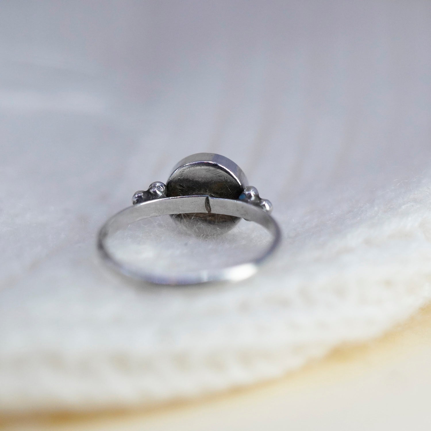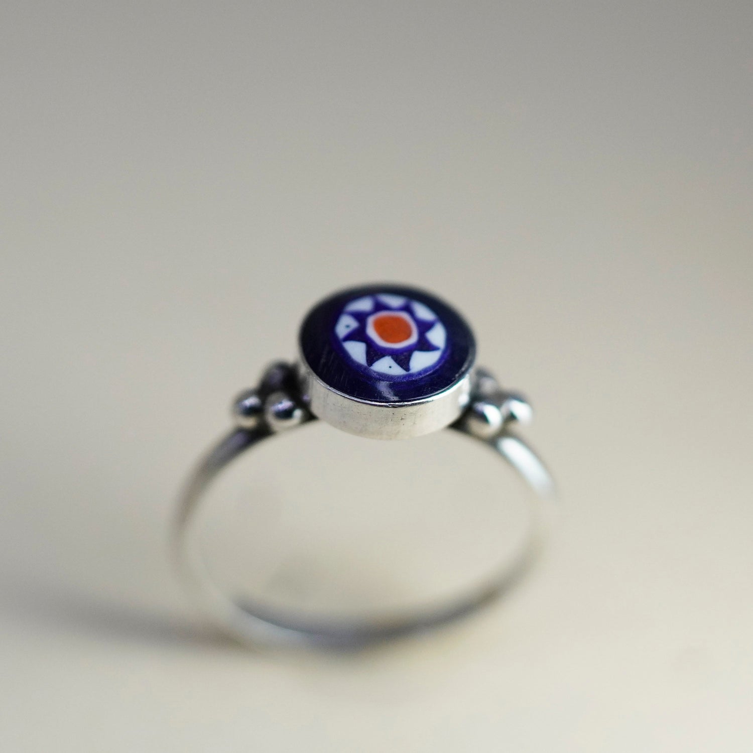 Size 6.5, vintage sterling 925 silver handmade ring w/ blue dots glass