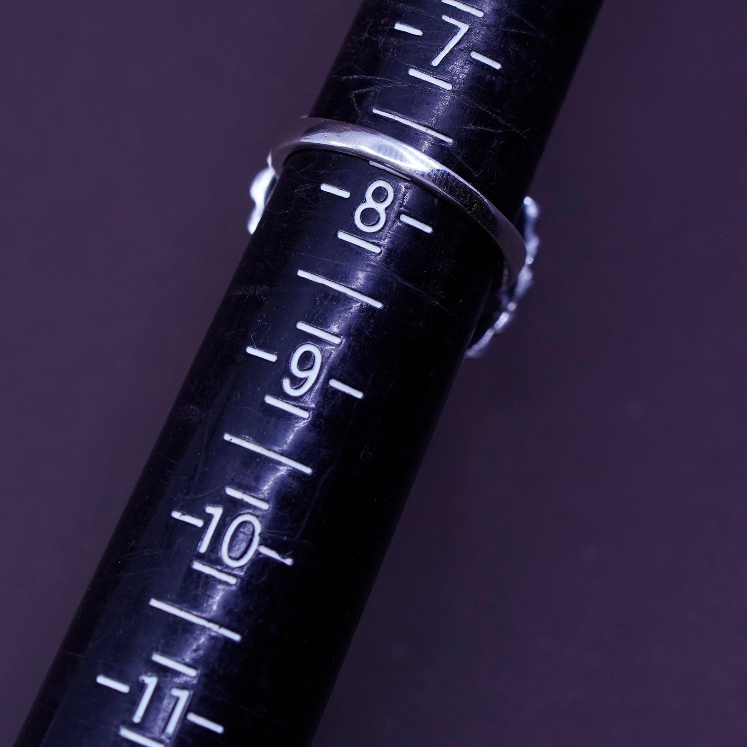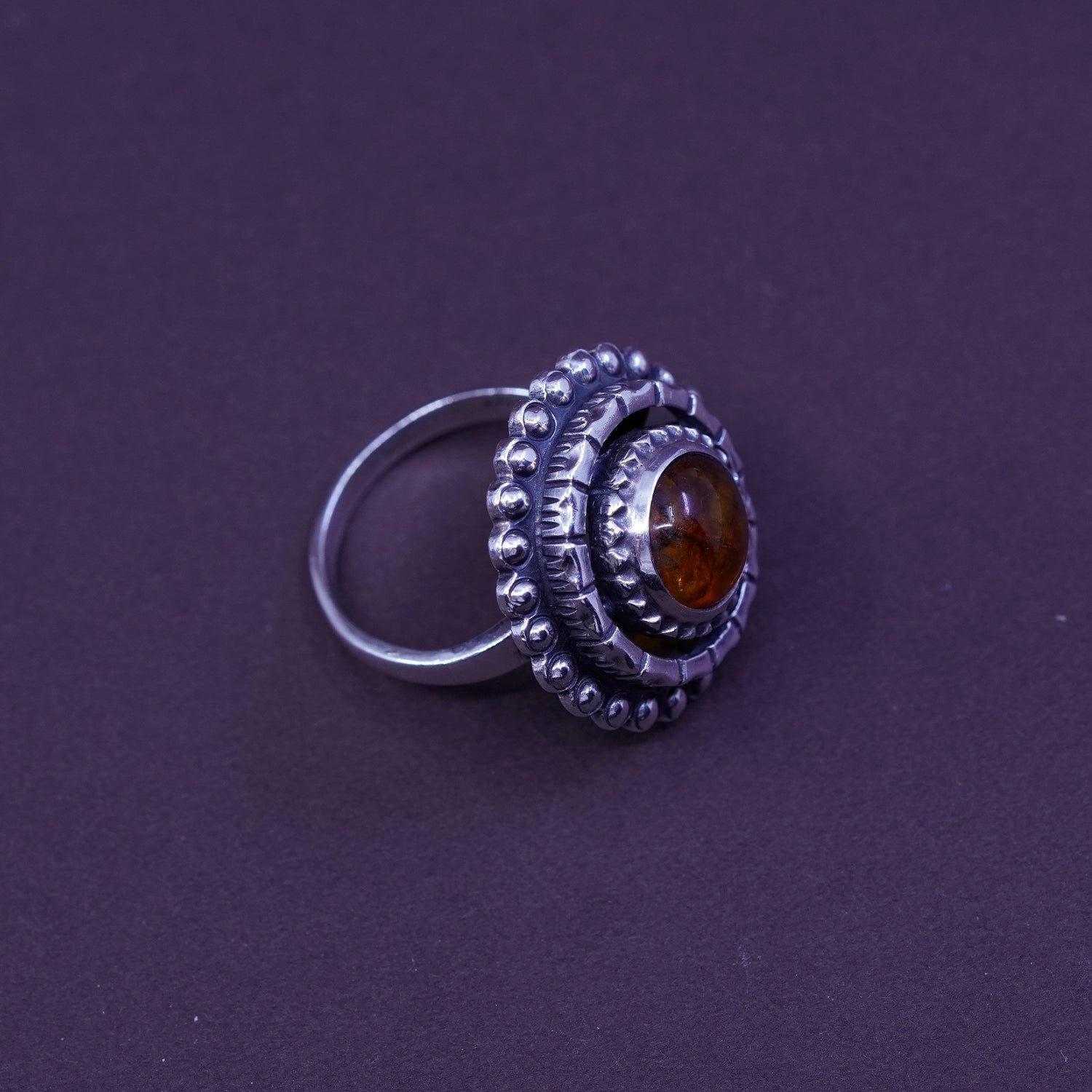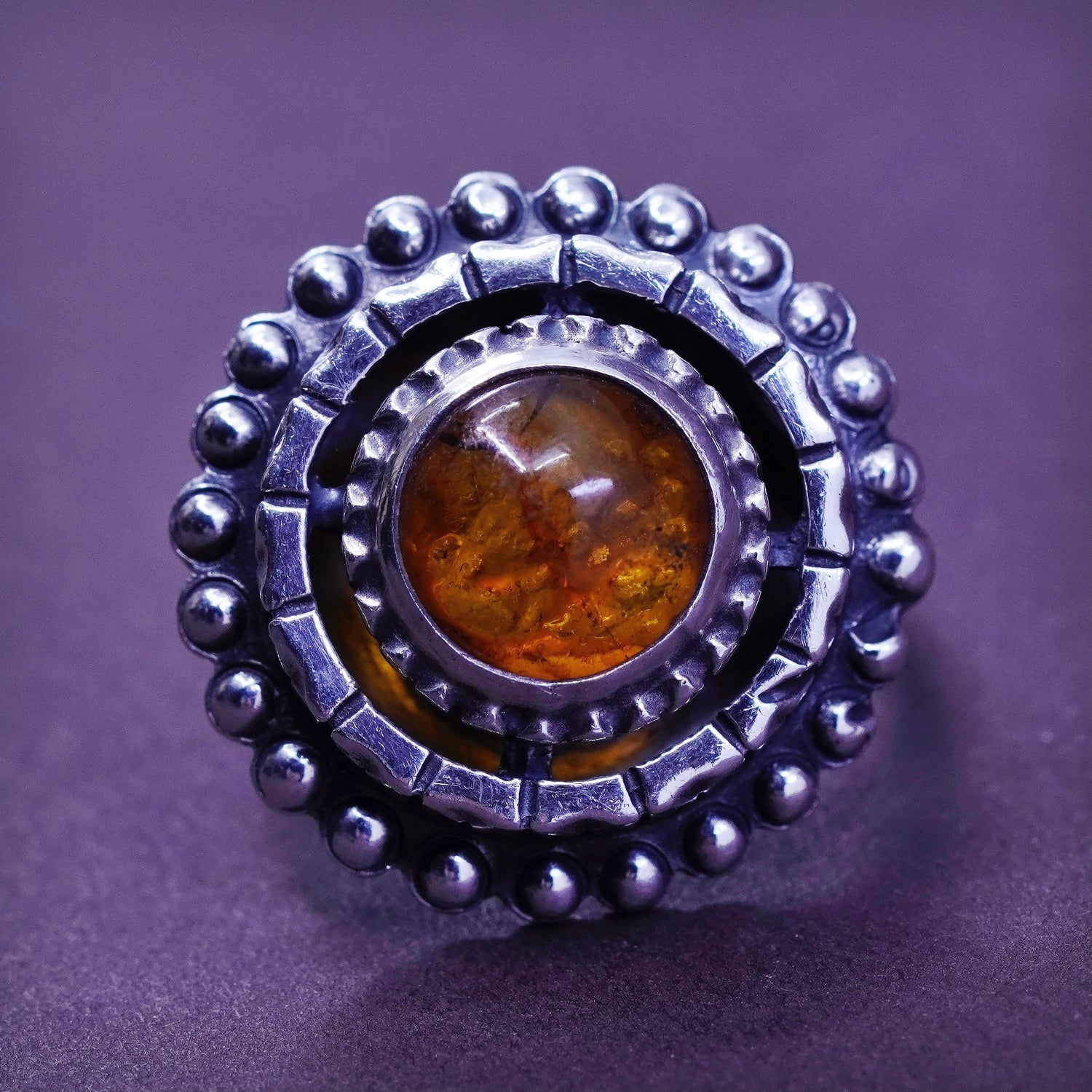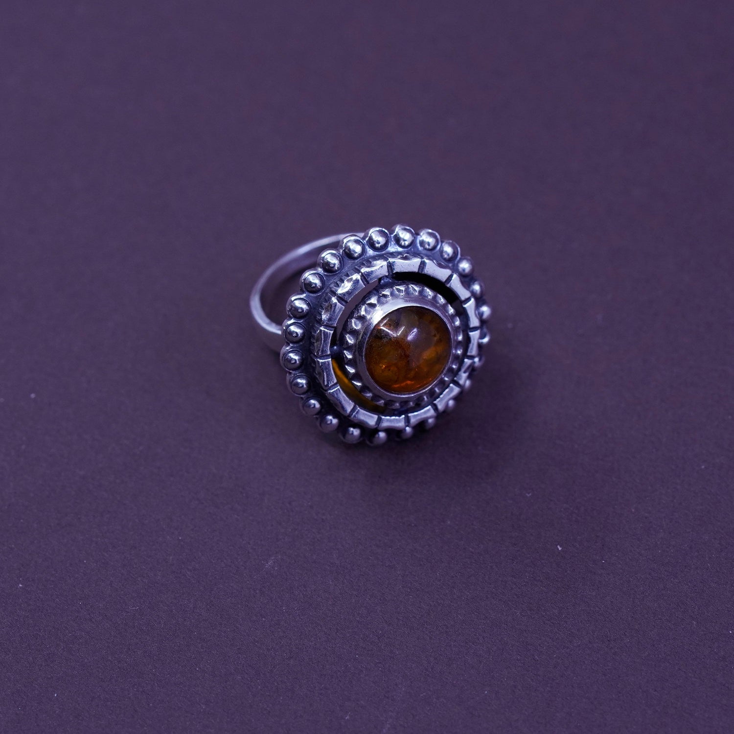 Size 7.5, vtg KALUPE Sterling 925 silver handmade sun ring with Amber and beads