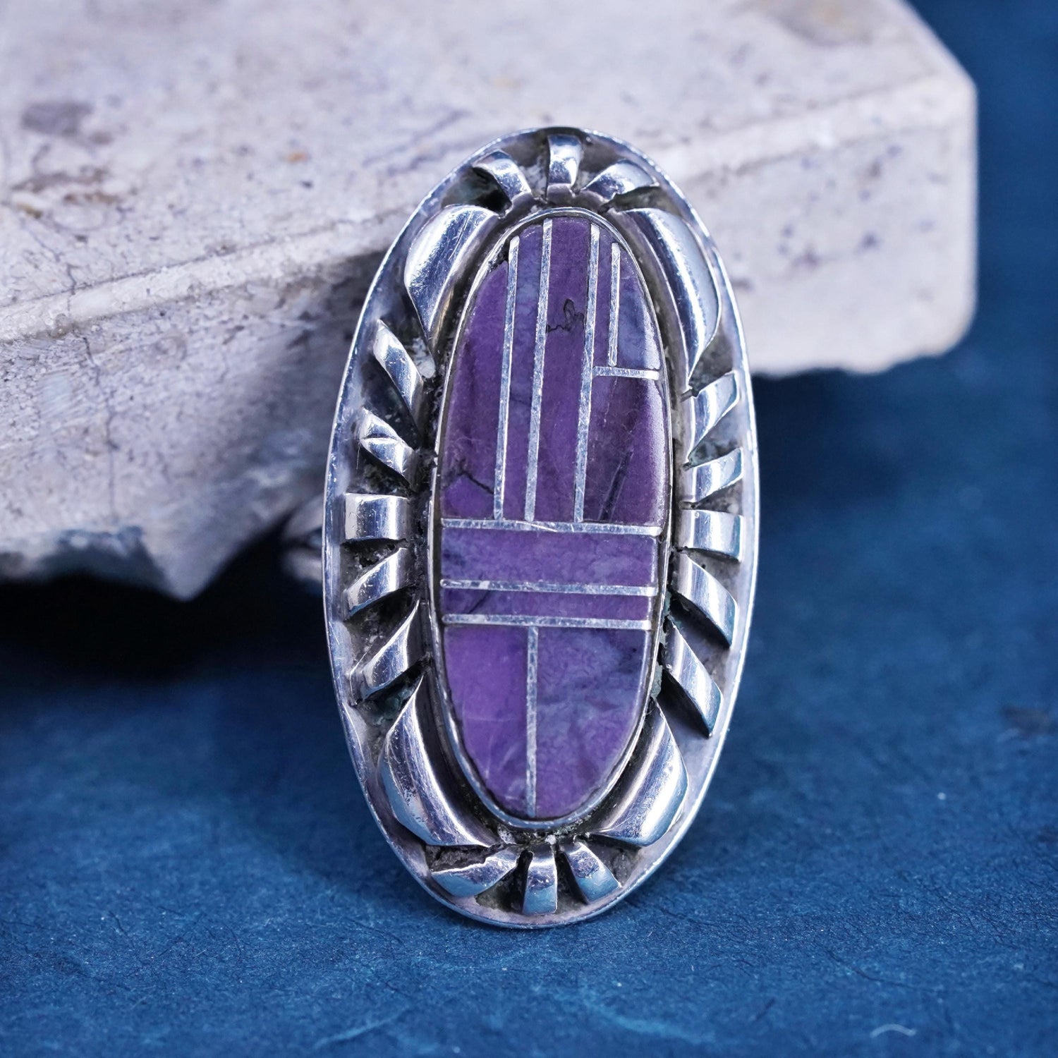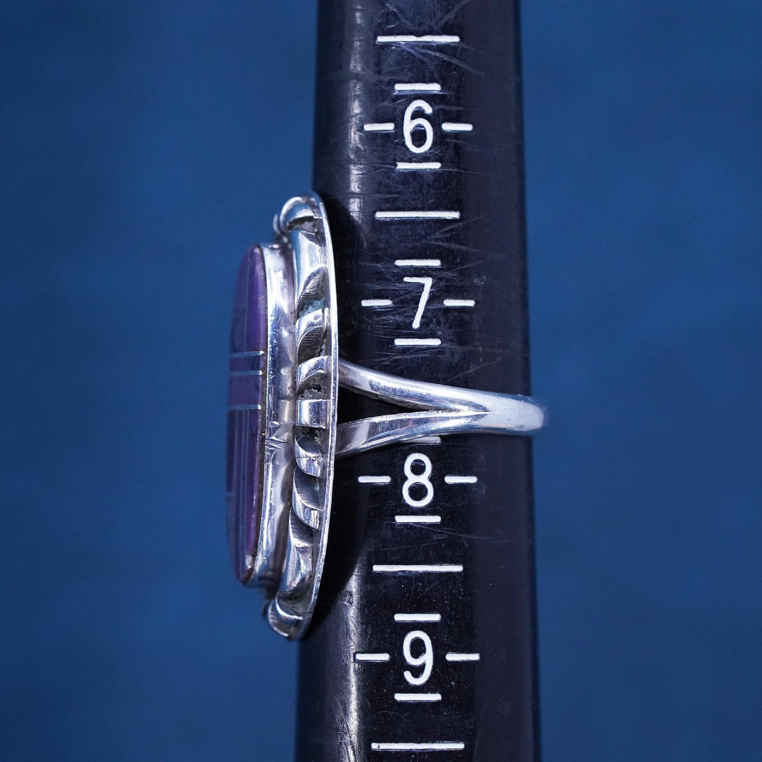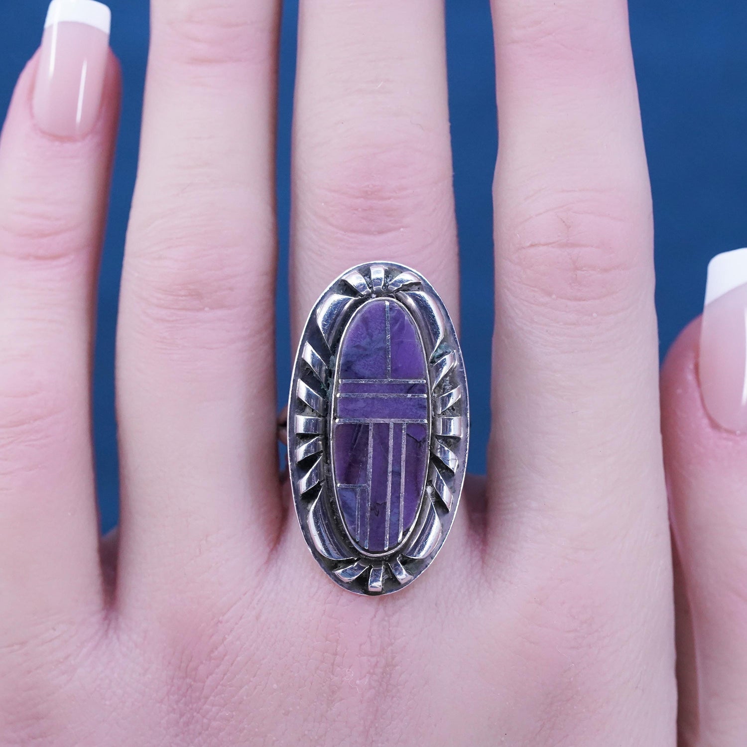Size 7.5, vintage Navajo Margaret Lee ML Sterling 925 silver handmade ring, Native American, southwestern with purple turquoise, stamped Sterling ML
