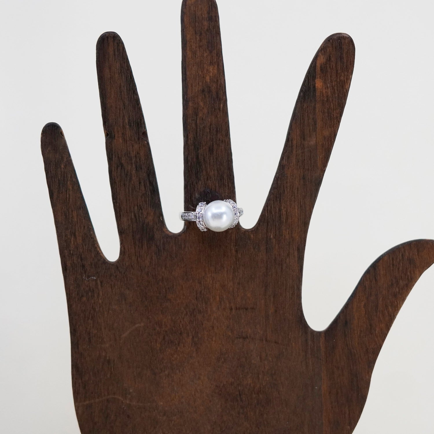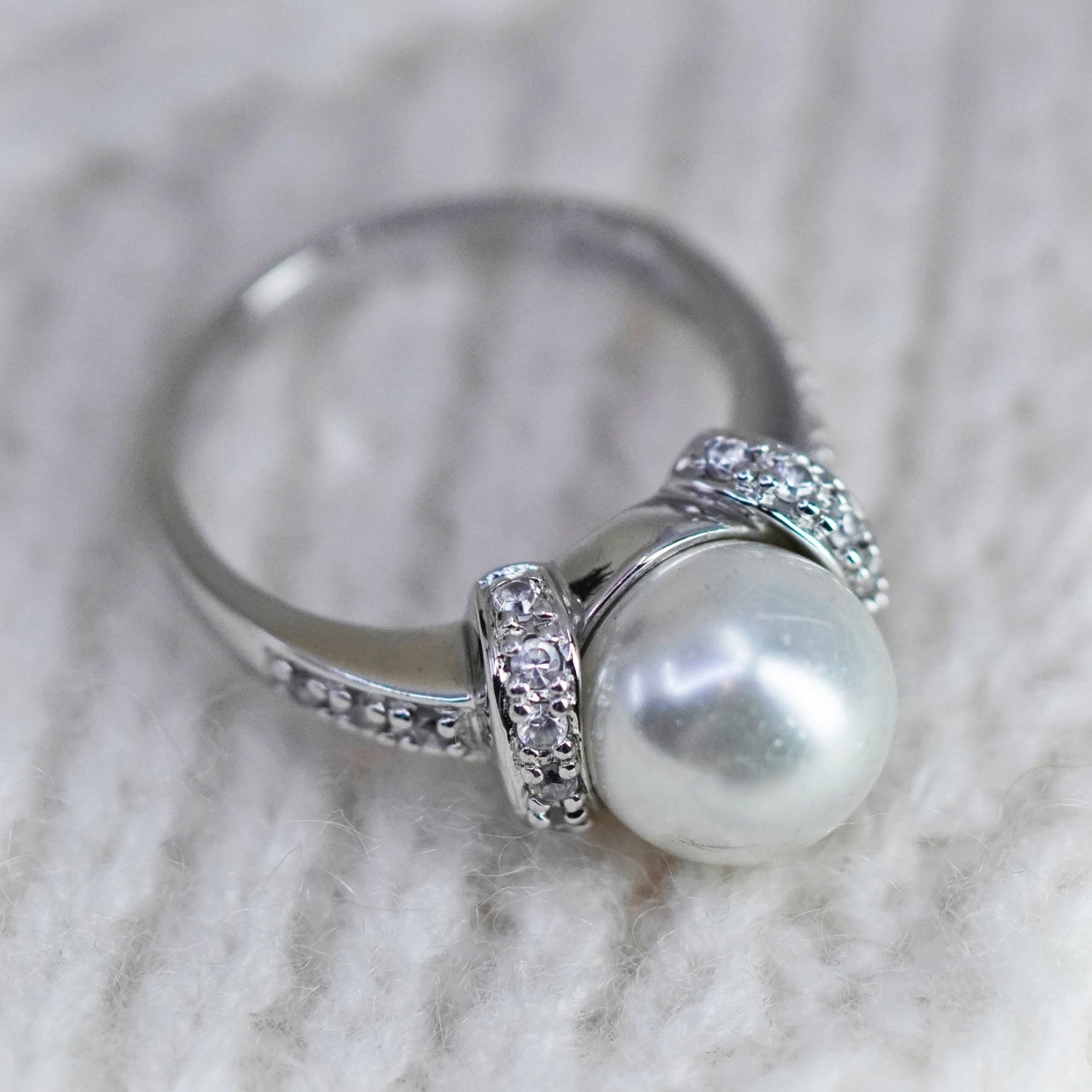 Size 7, Vintage sterling 925 silver handmade ring with faux pearl and cz details, stamped 925