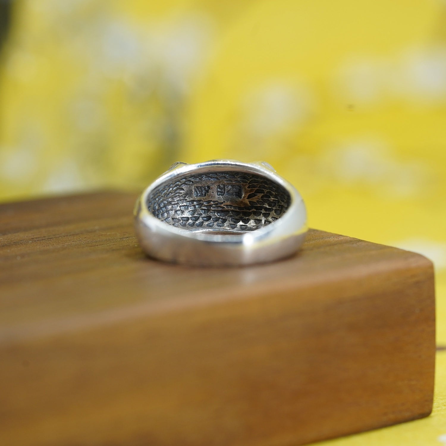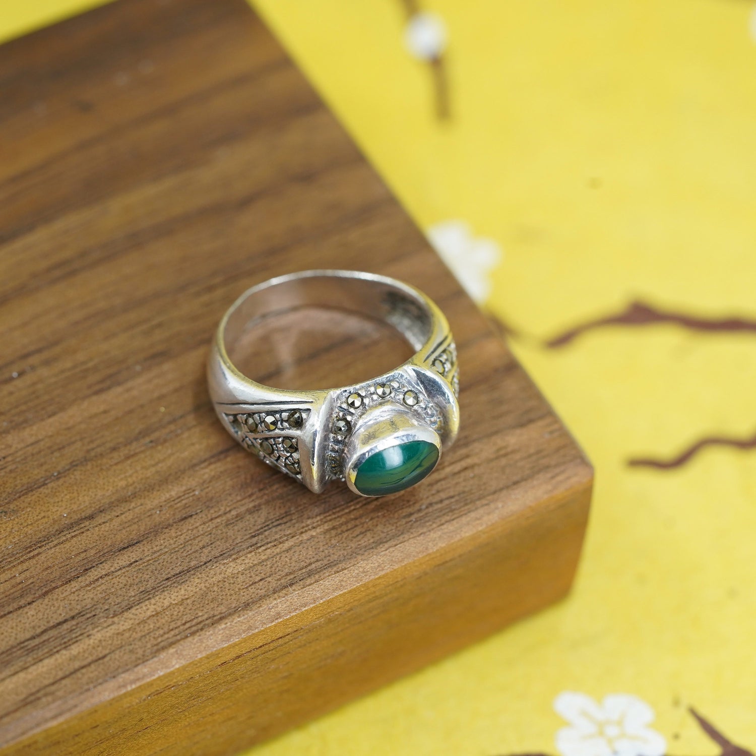 Size 8, Sterling 925 silver handmade statement ring with green onyx marcasite