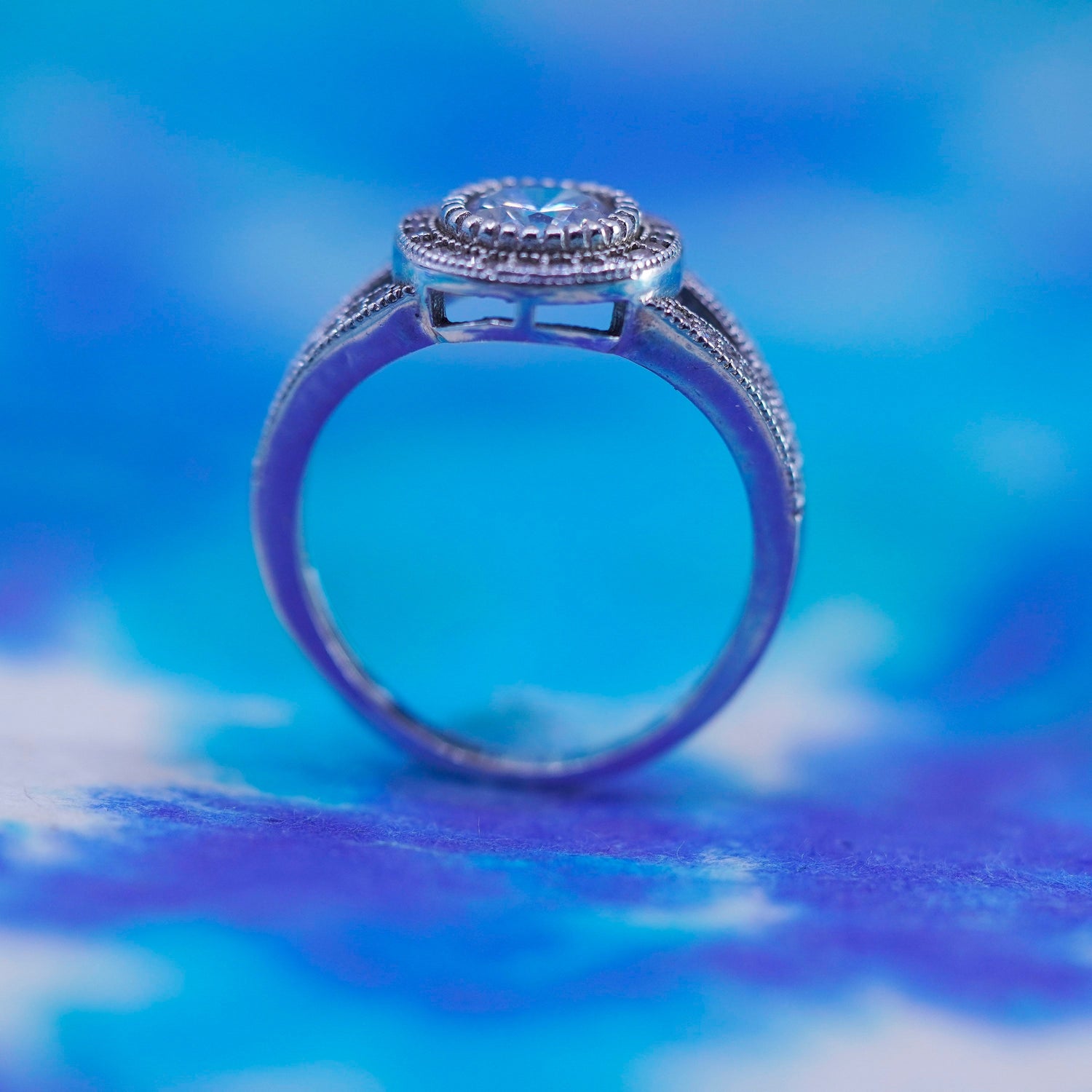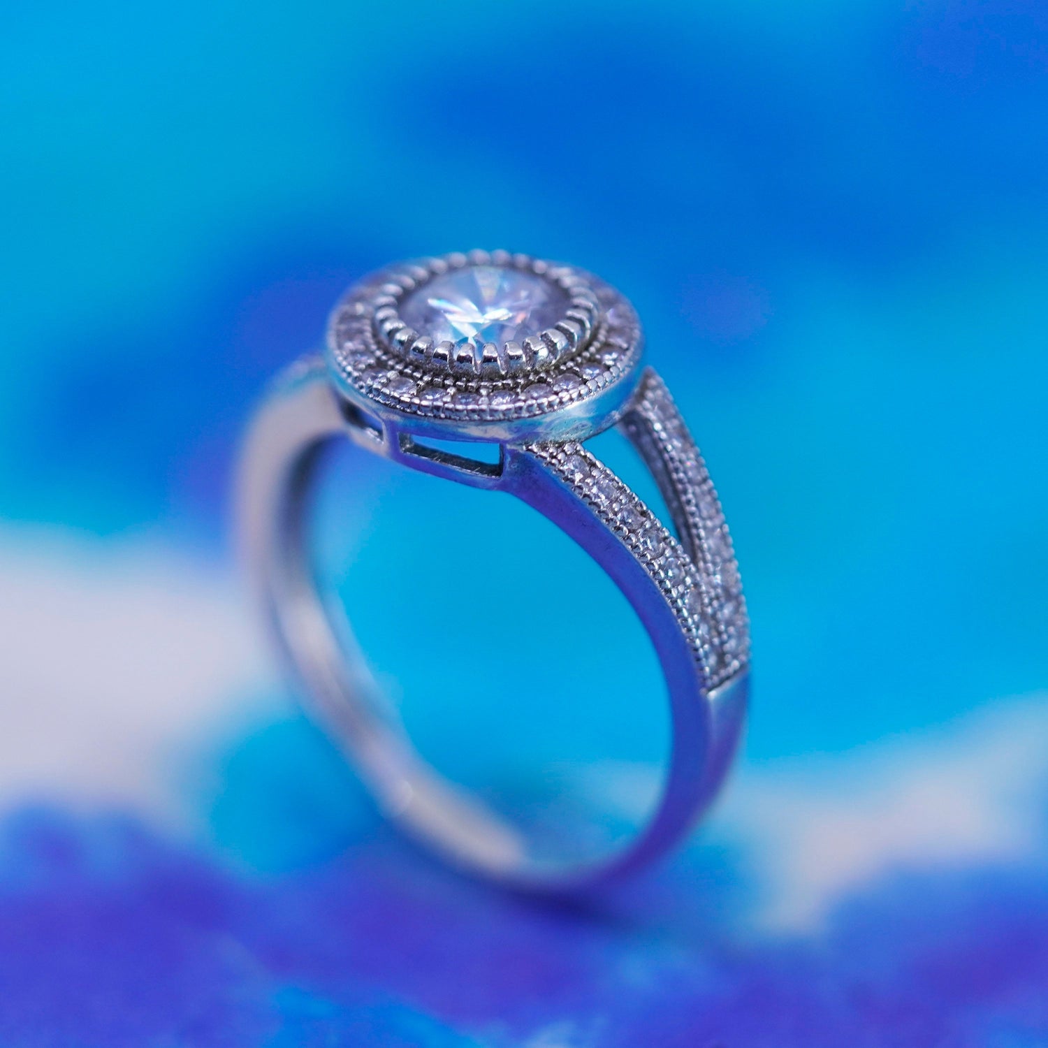 Size 8, vintage Sterling 925 silver engagement ring with cluster Cz around