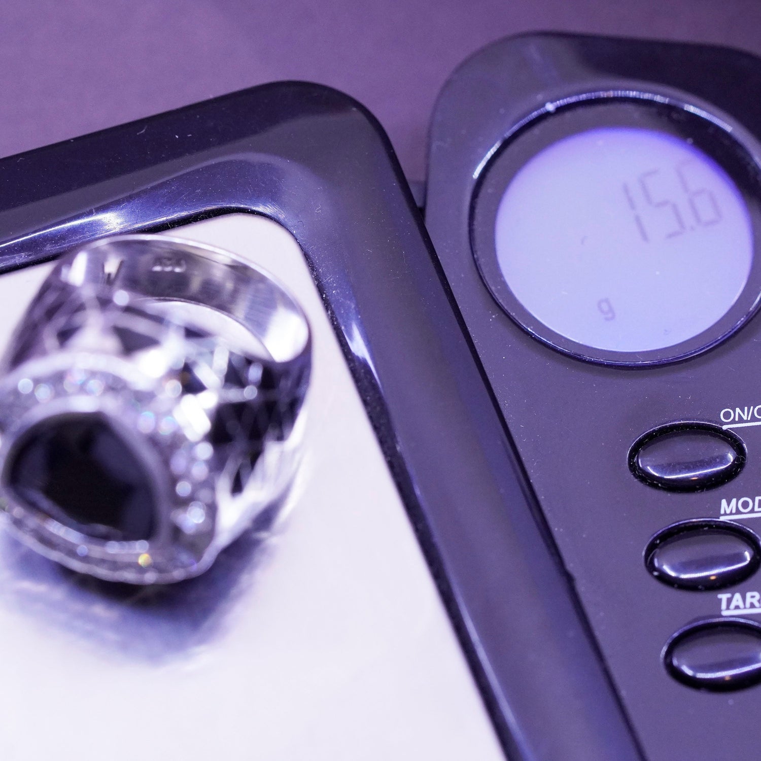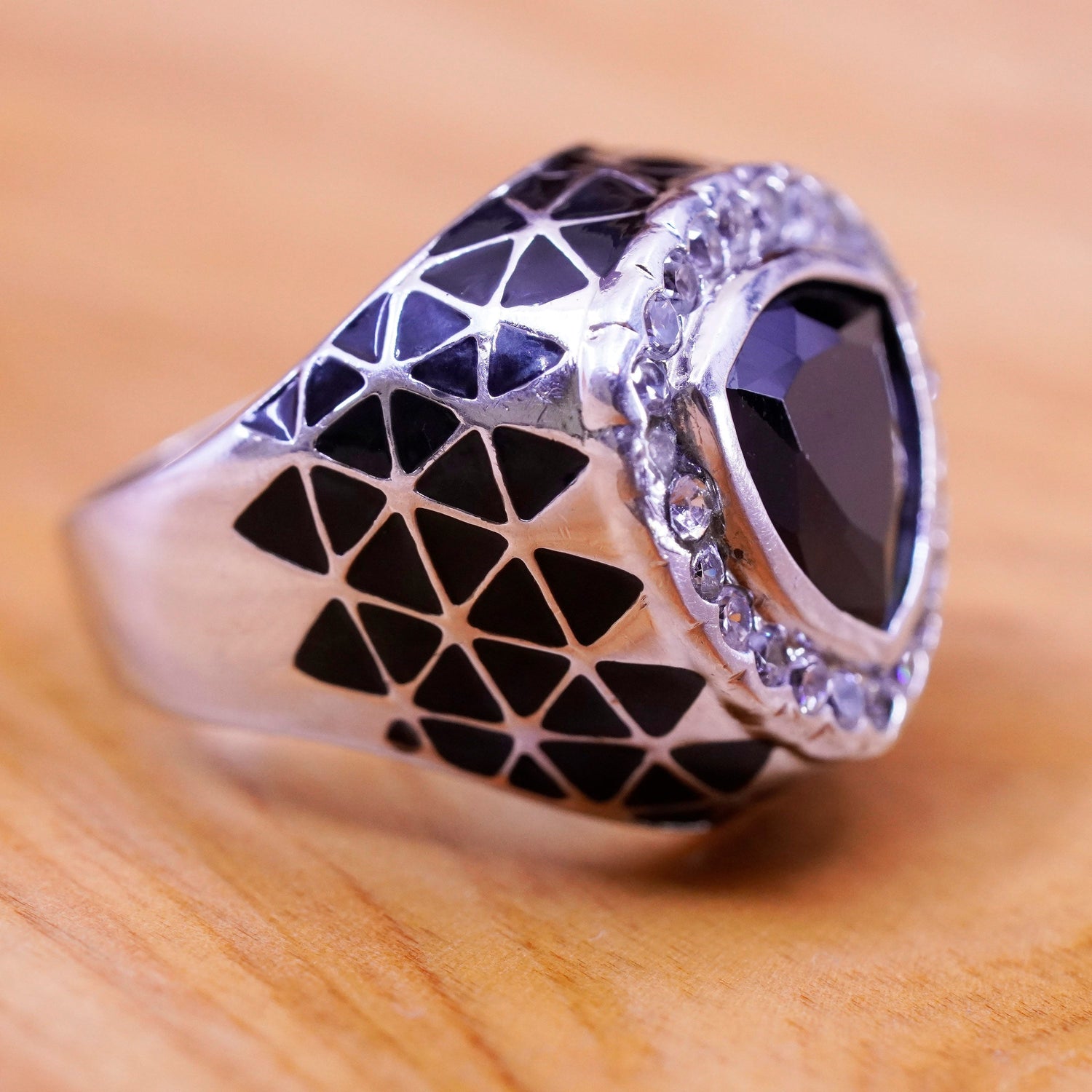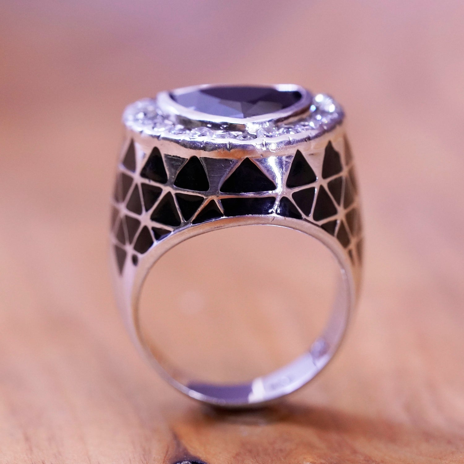Size 7, vintage designer Sterling 925 silver handmade statement ring with obsidian and cz around, stamped 925 M