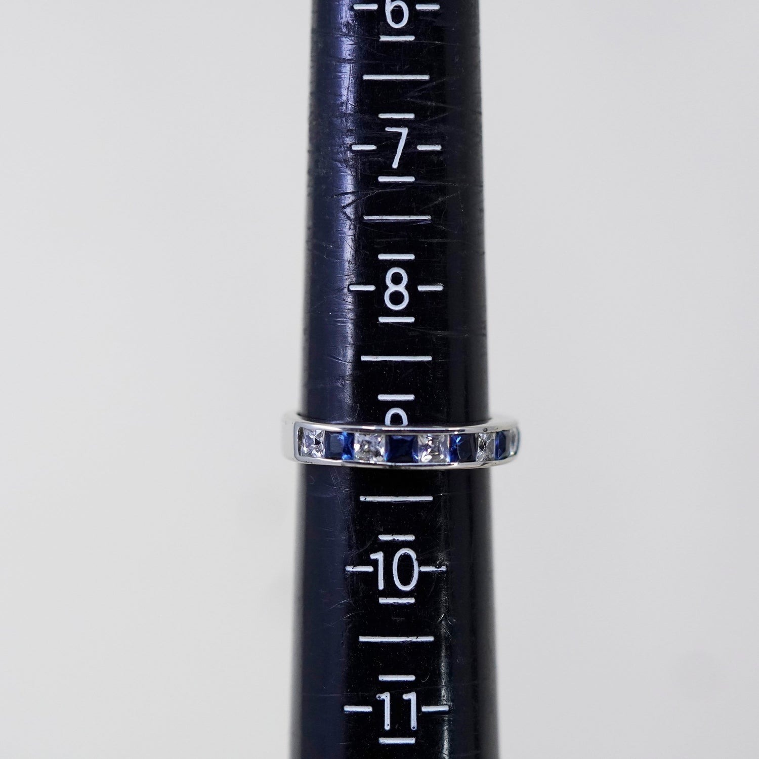 Size 9, Sterling 925 silver stackable ring, wedding band with blue and clear CZ, stamped 925