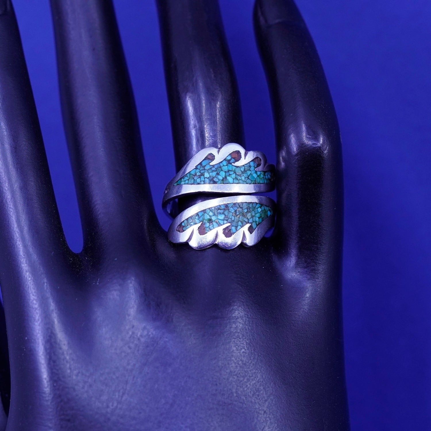 Size adjustable, Native American Navajo Frank Bowman sterling silver inlaid handmade ring, 925 wings with turquoise coral, silver tested
