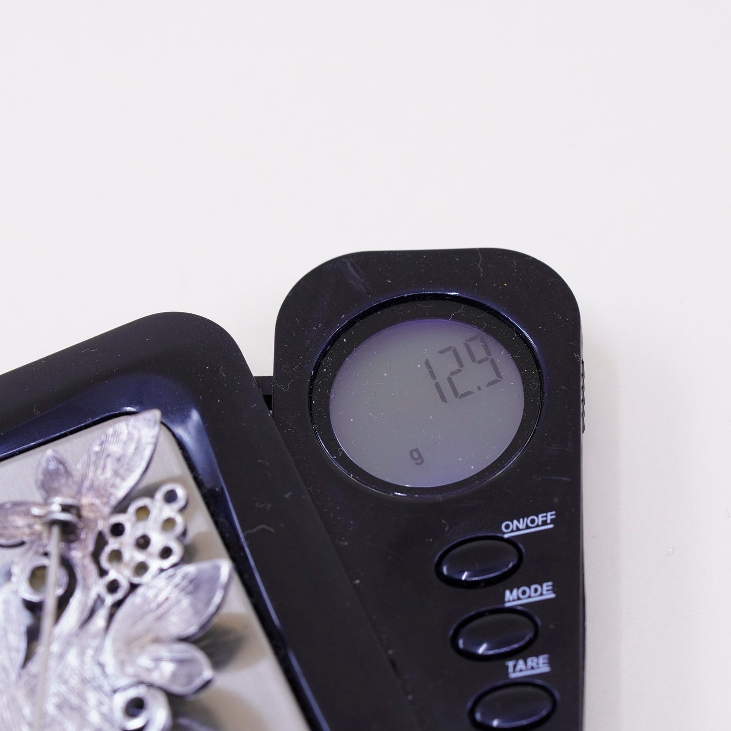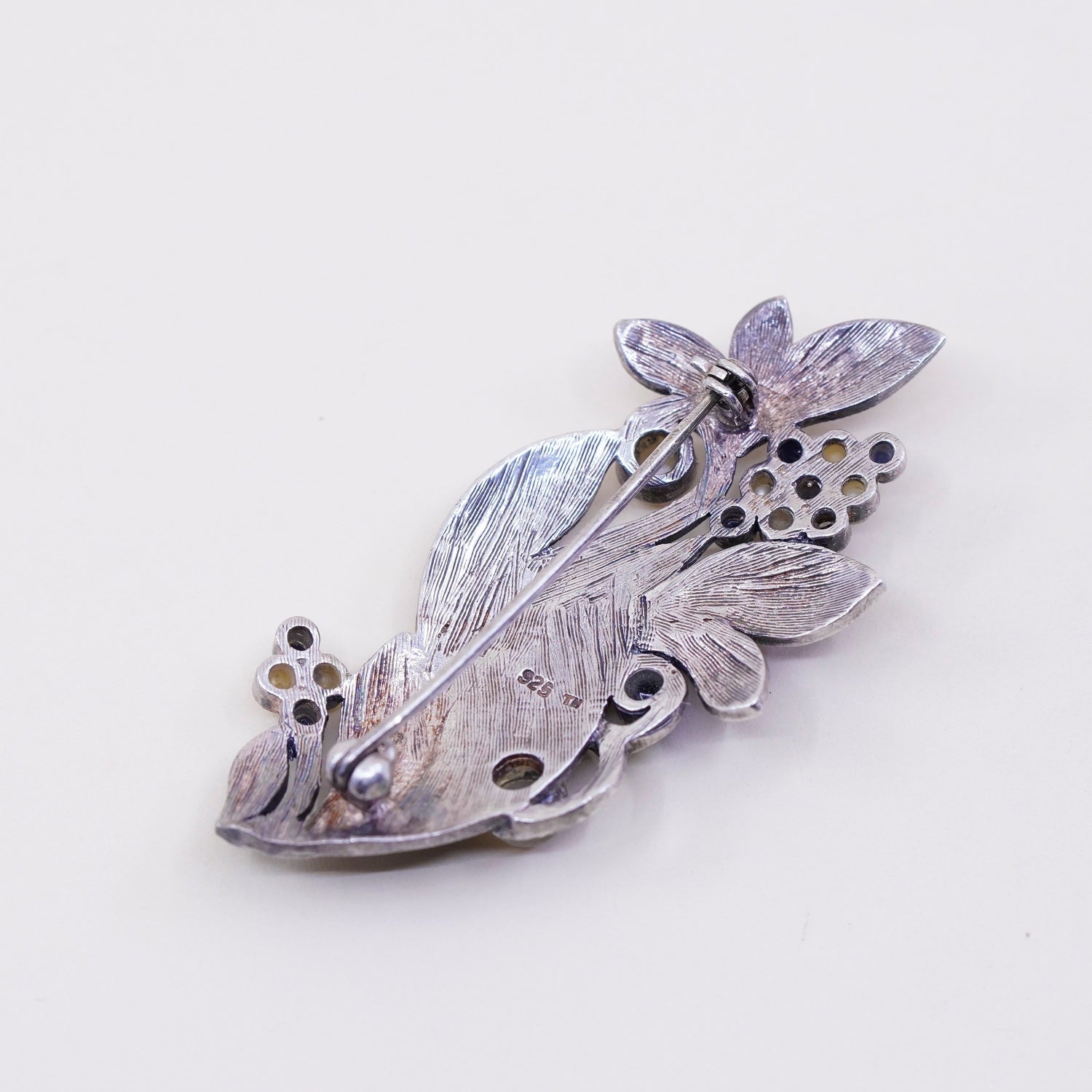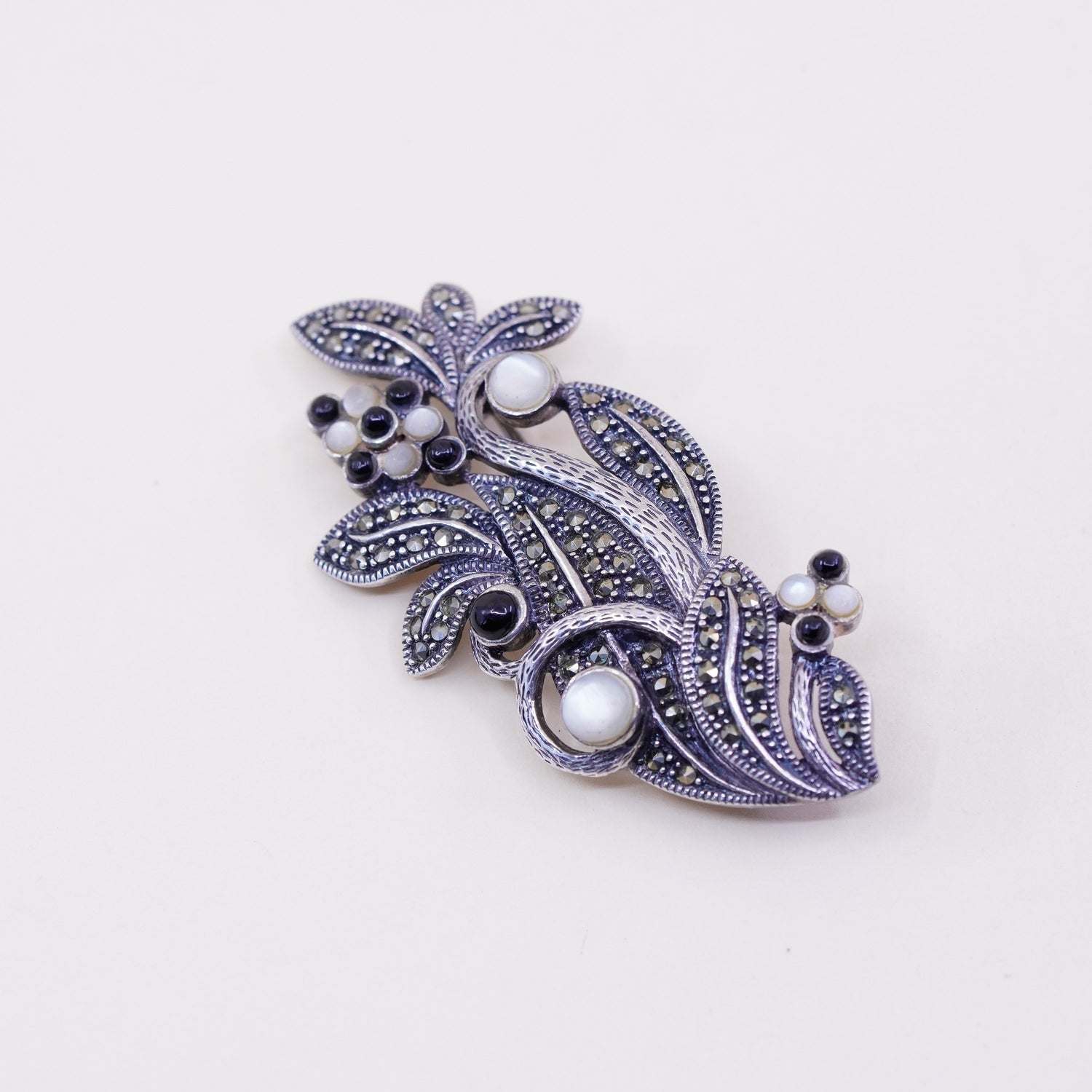 Vintage Sterling 925 silver handmade brooch with obsidian mother of pearl and marcasite details, stamped 925