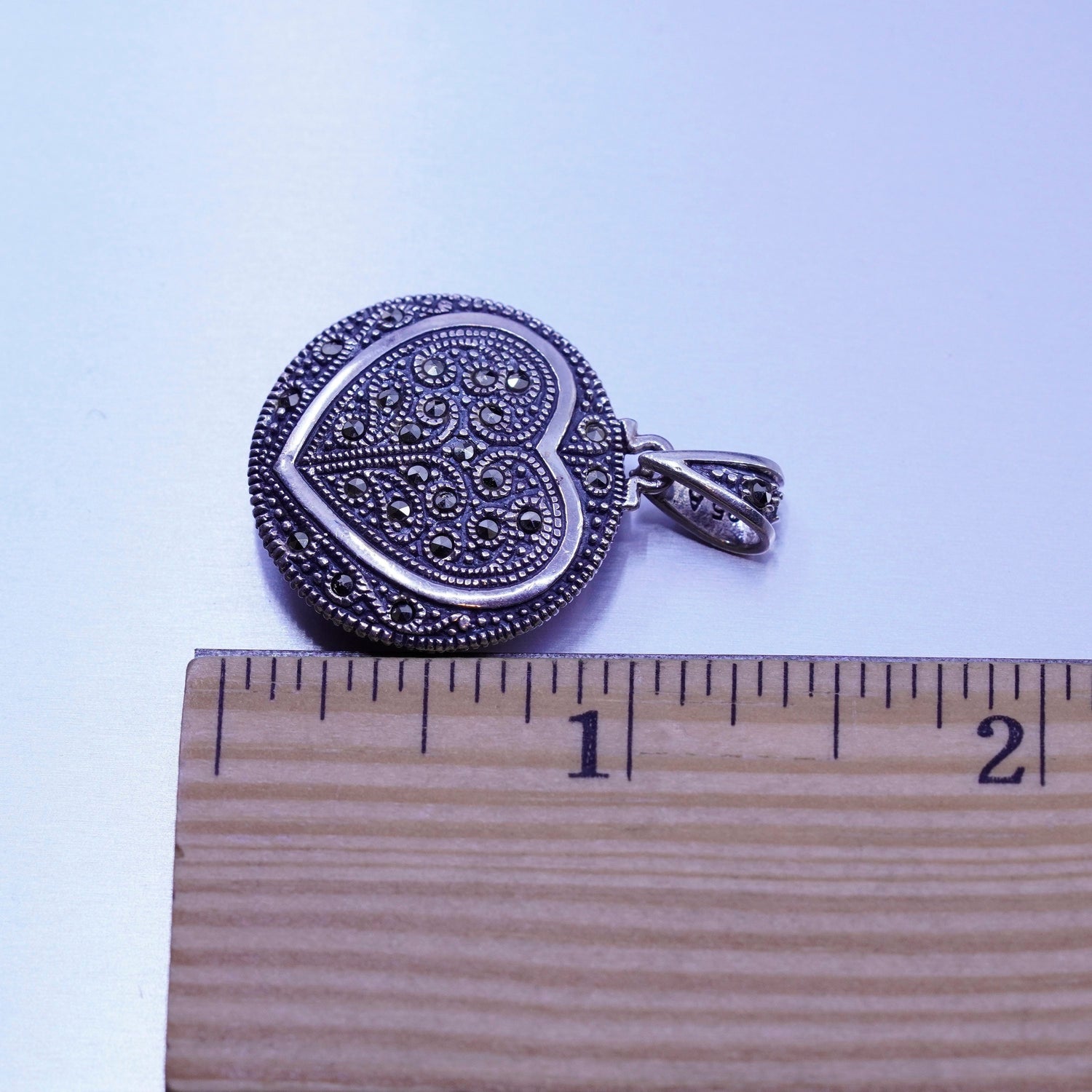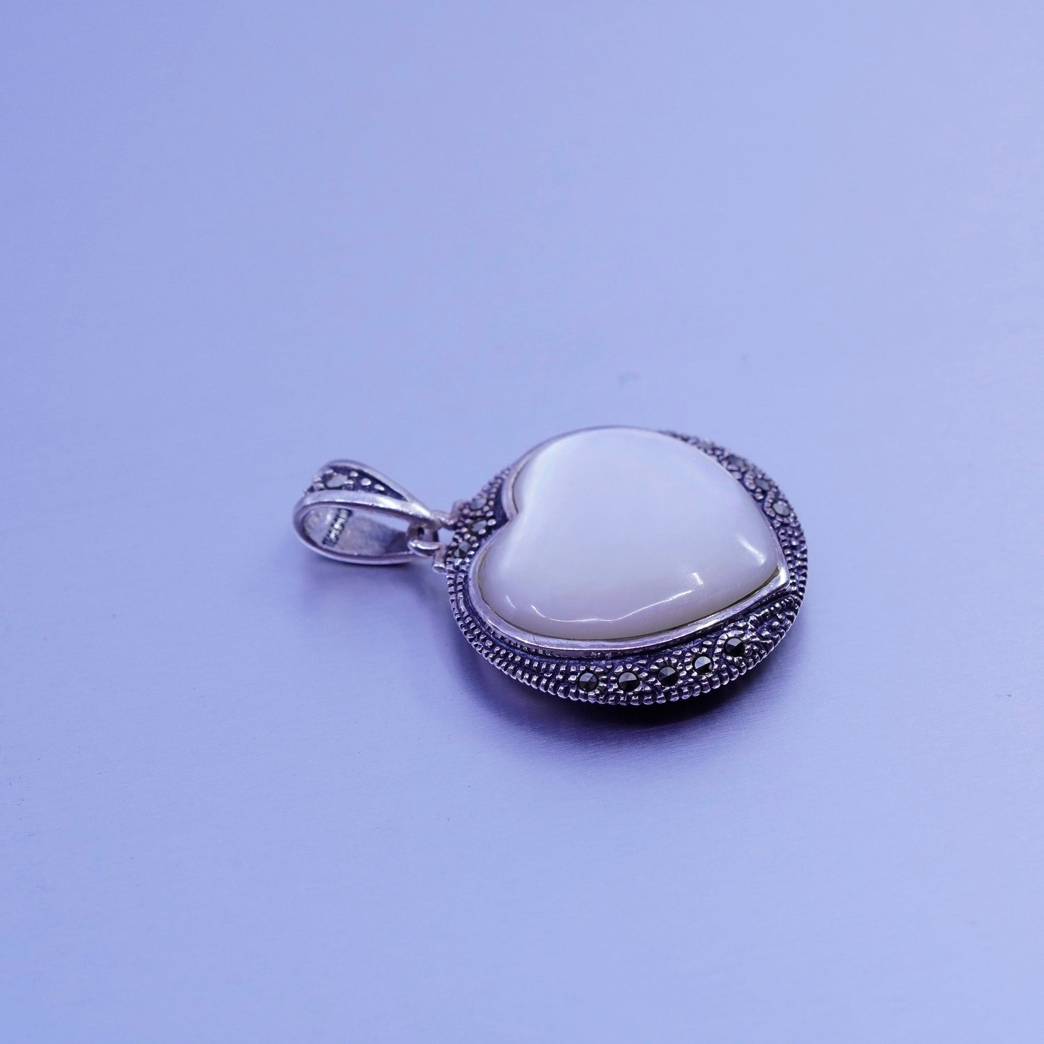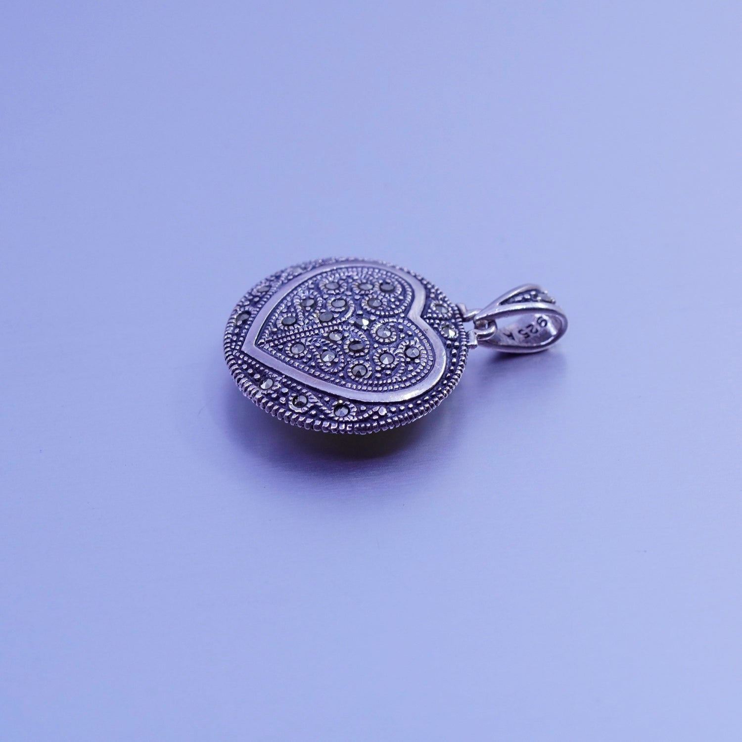 Vintage Sterling 925 silver handmade double sided pendant with heart moonstone and Marcasite, stamped 925