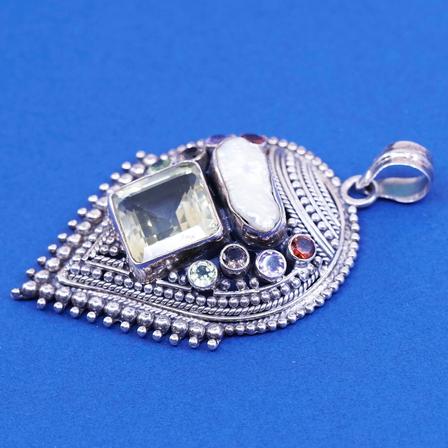 Vintage Sterling silver handmade pendant, 925 Bali teardrop with pearl citrine amethyst peridot and ruby, silver tested