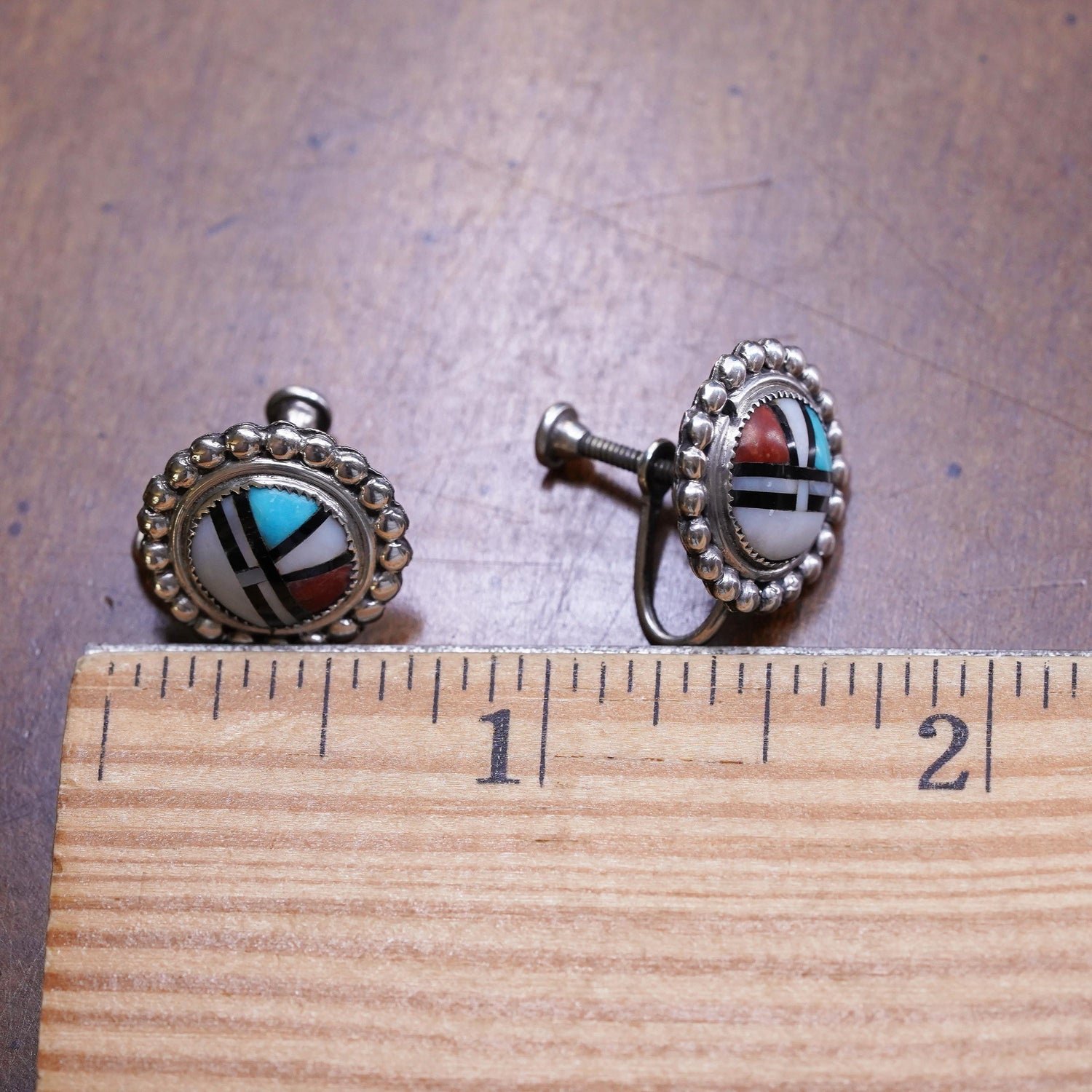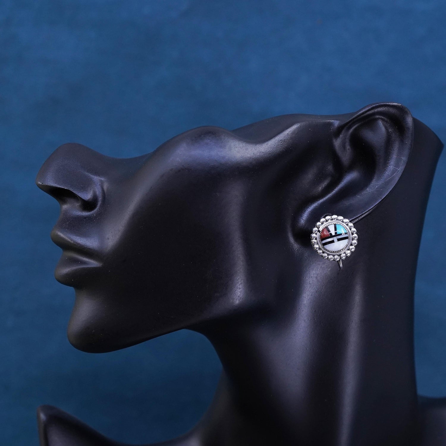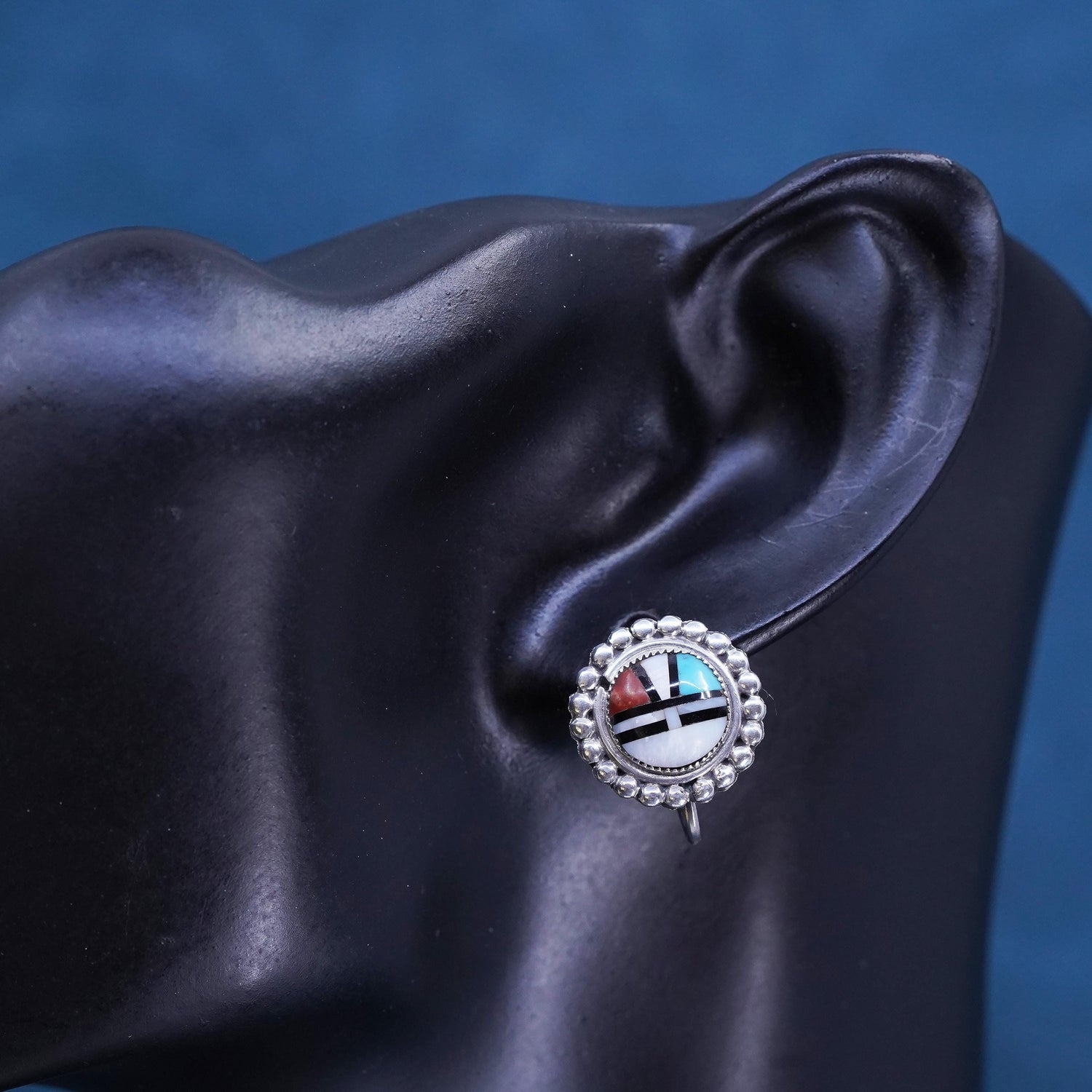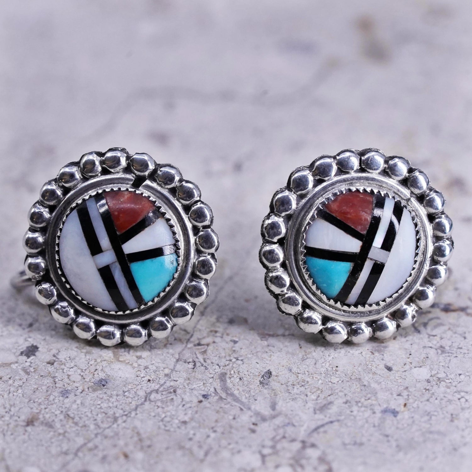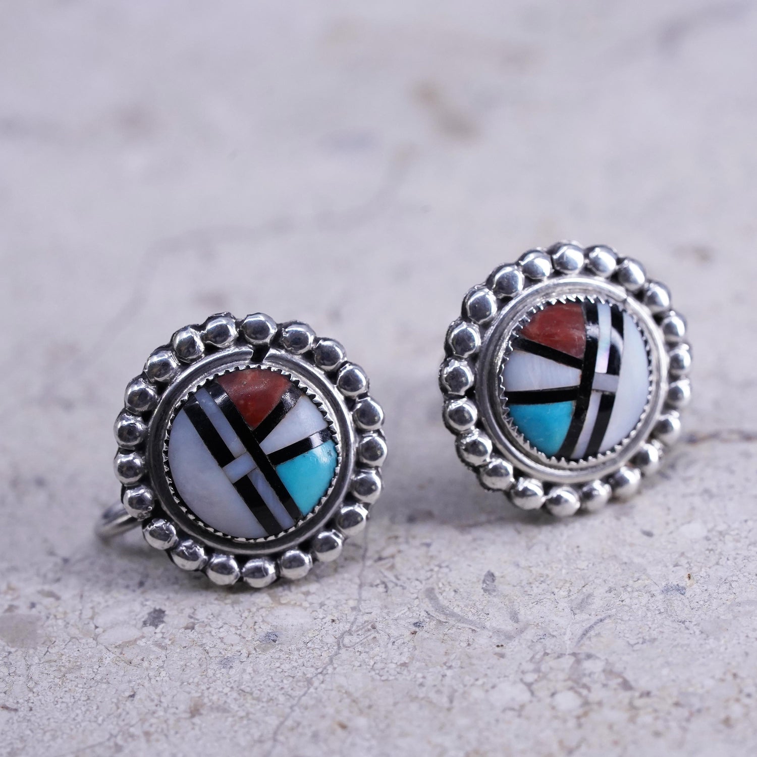 Vintage sterling silver handmade earrings, Zuni Sunface 925 screw back with mother of pearl and turquoise Inlay, stamped sterling