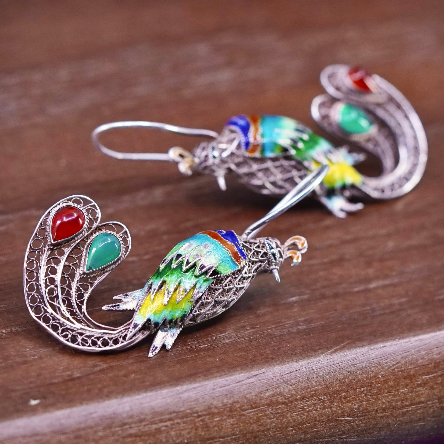 Vintage Sterling silver handmade earrings, filigree 925 peacock drops with colorful enamel, stamped silver D3
