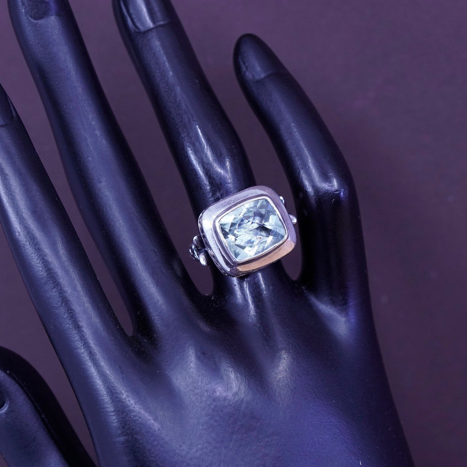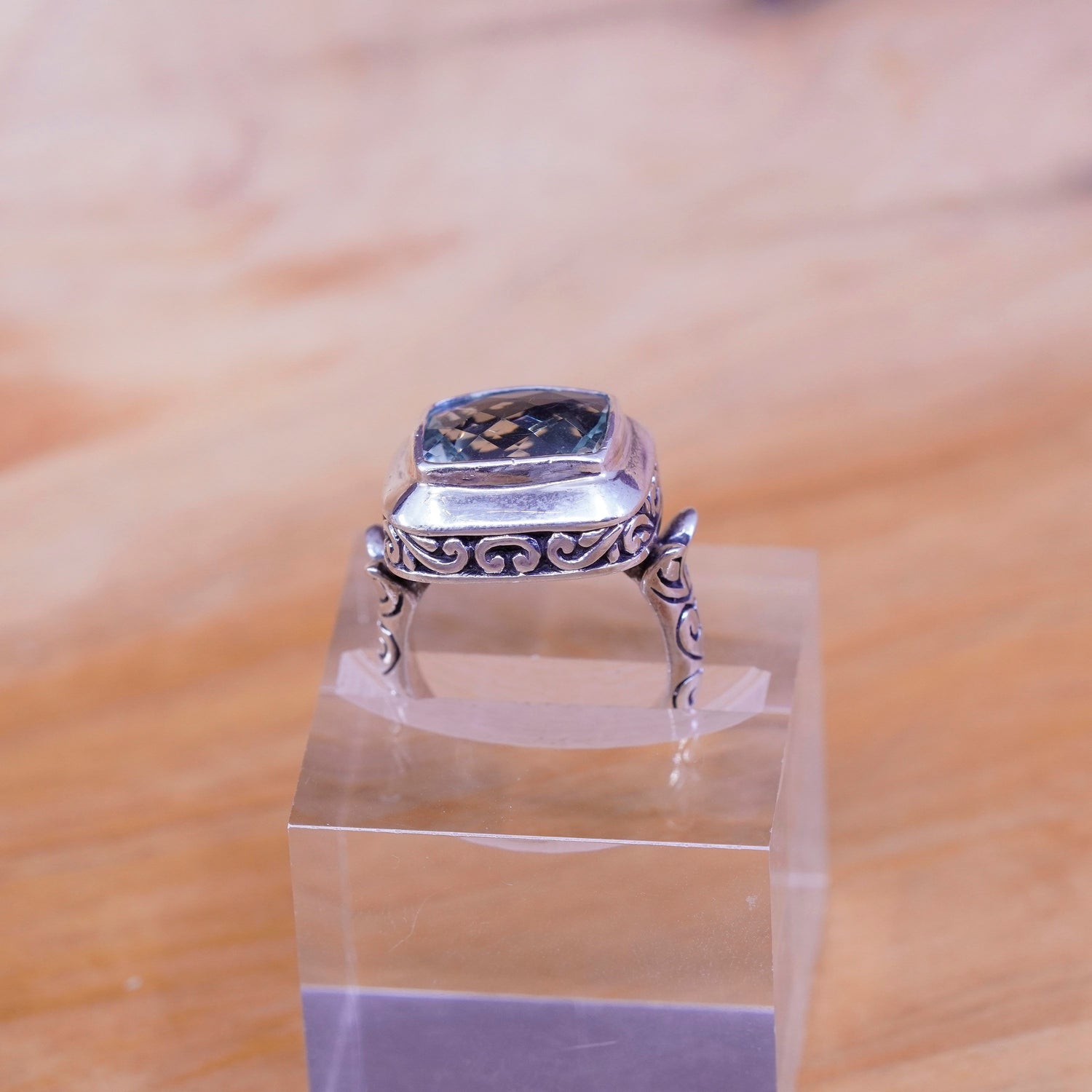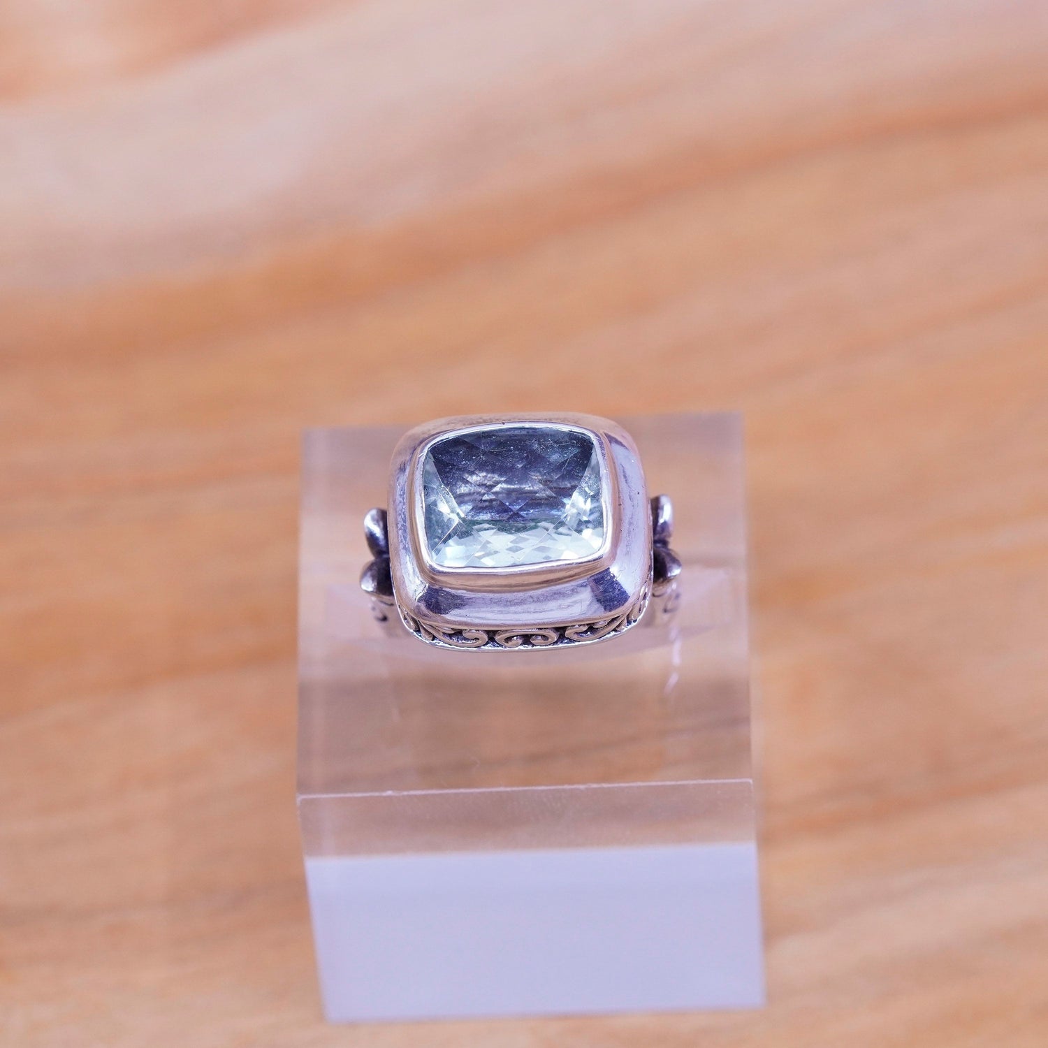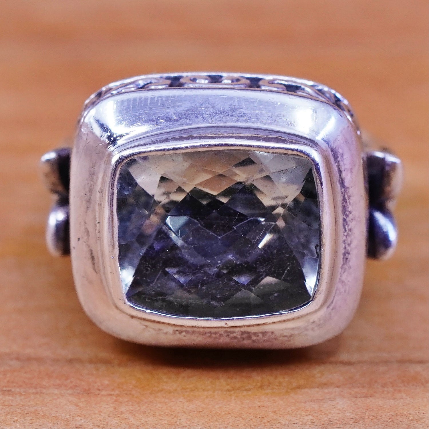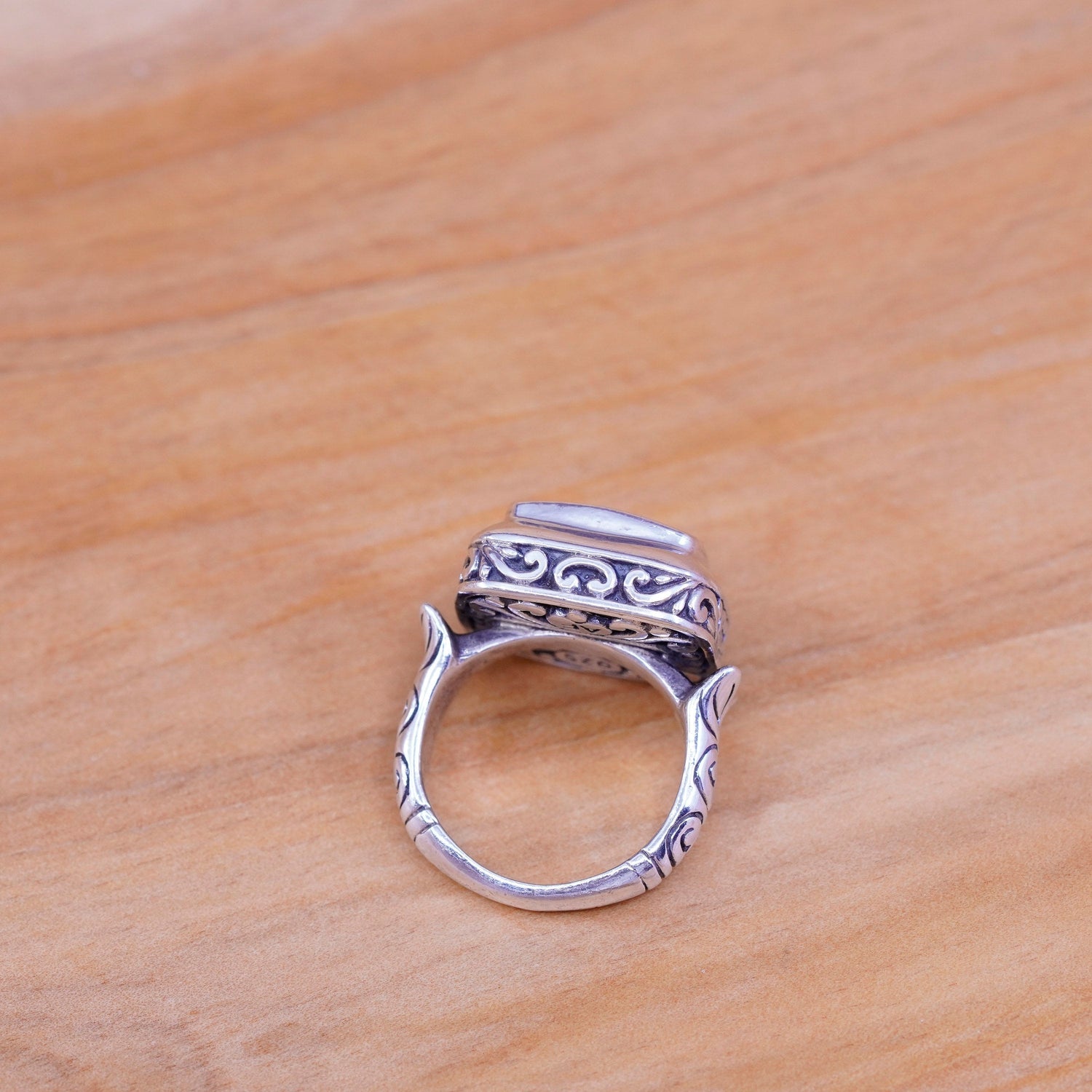Size 5.75, vintage AF Sterling silver handmade ring, textured 925 leafy band with cushion cut chrysoberyl, stamped 925 AF