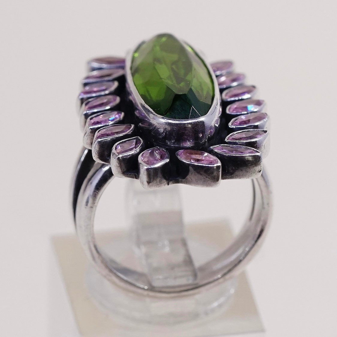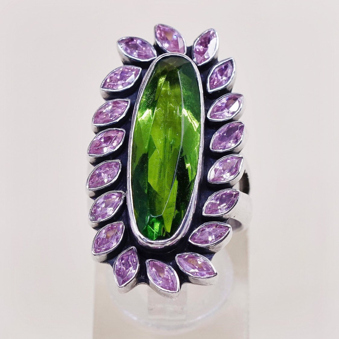 sz 6.25, sterling 925 silver handmade statement ring, peridot n pink crystal