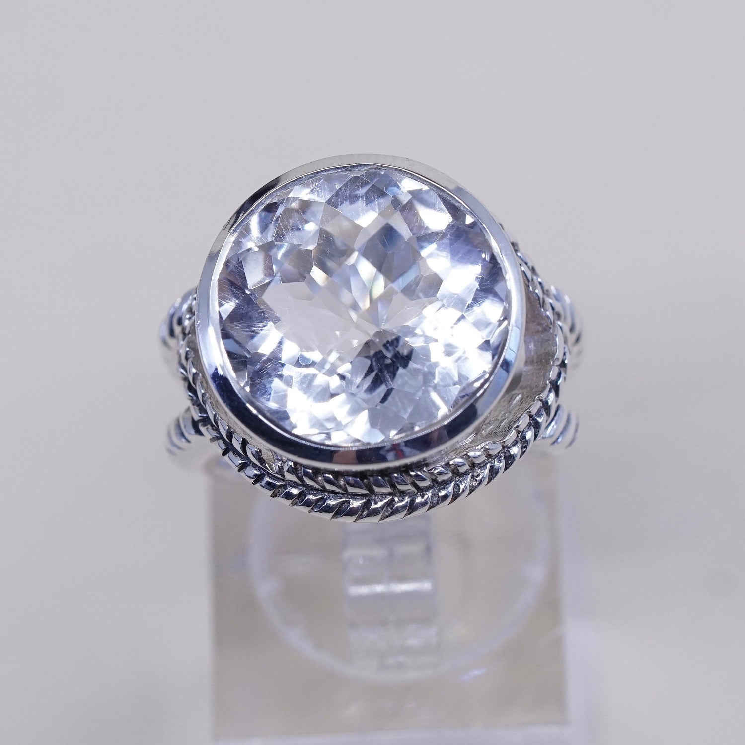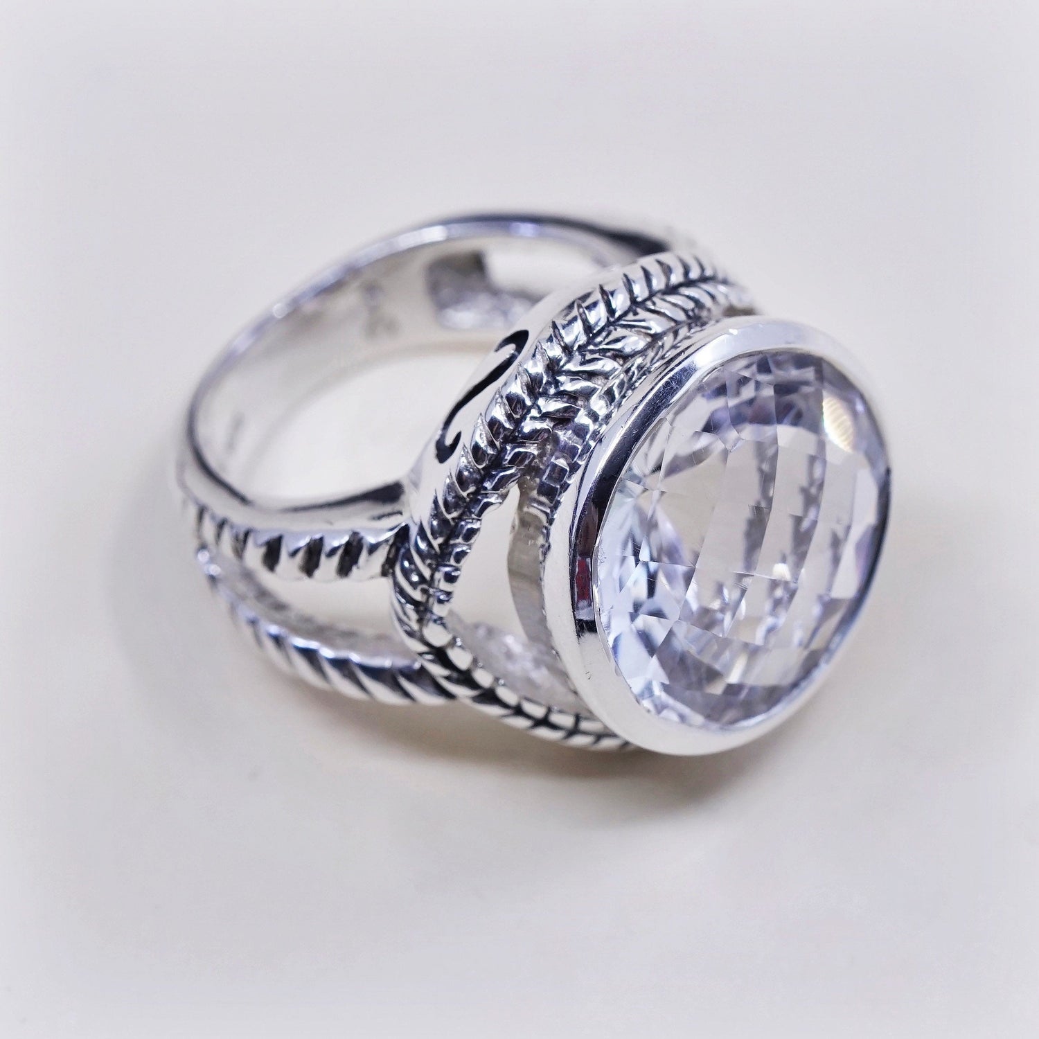 Size 6, vintage Sterling 925 silver handmade cocktail ring with checker cut crystal, stamped 925, signed question mark
