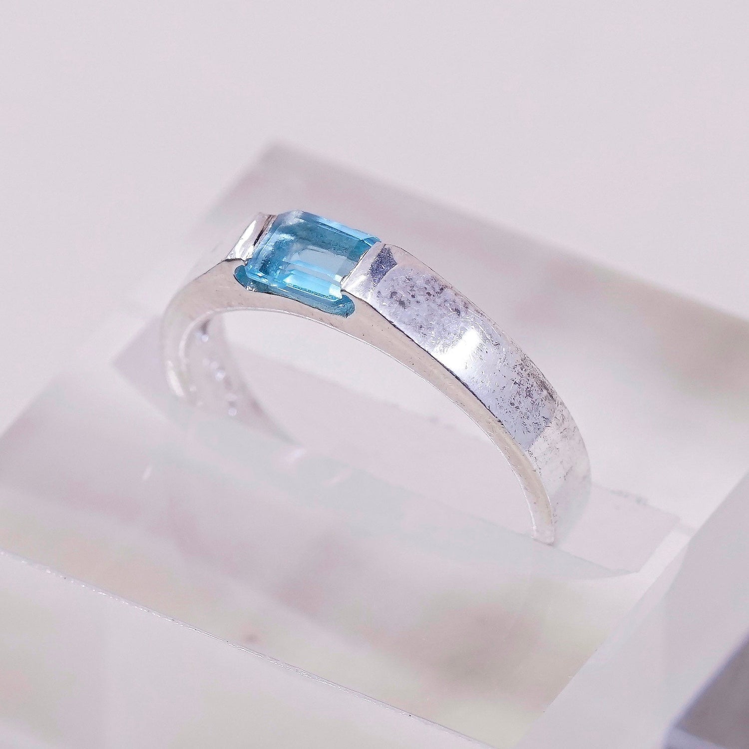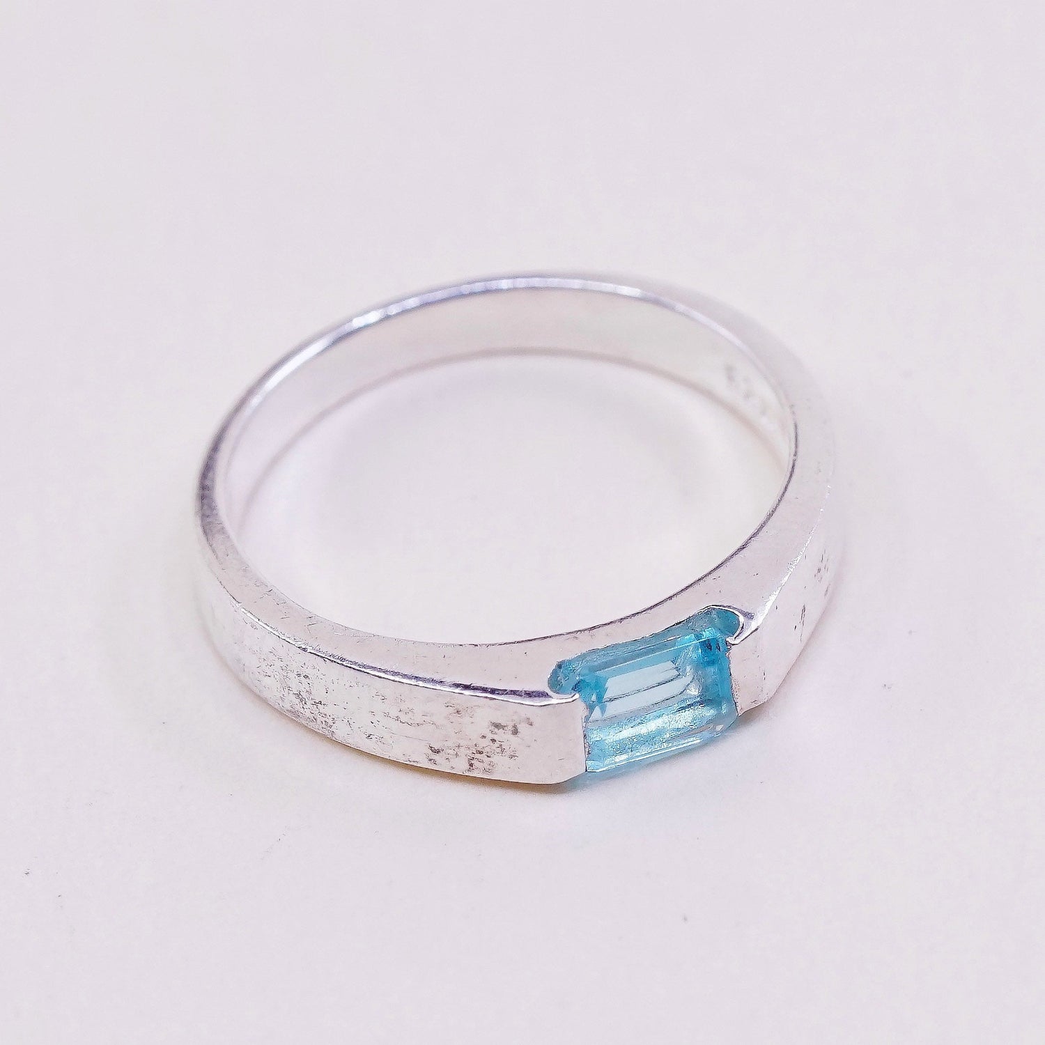 Size 7.25, vintage Sterling silver statement ring, 925 silver stackable band with blue topaz, stamped 925