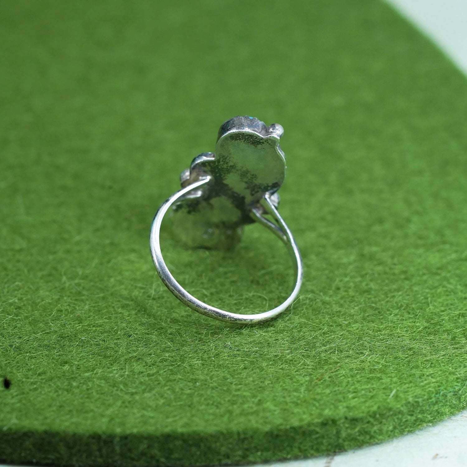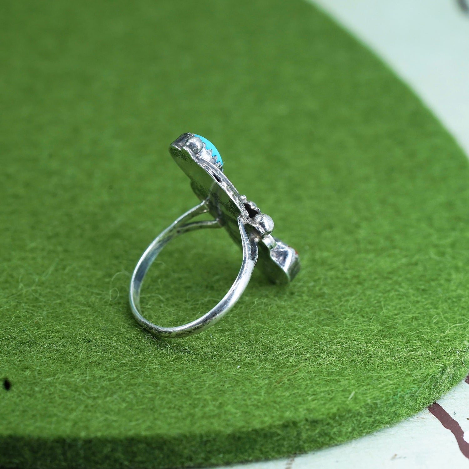 Size 7, Vintage John Delvin sterling silver ring, Native American handmade 925 ring with turquoise coral and flower details, stamped sterling D