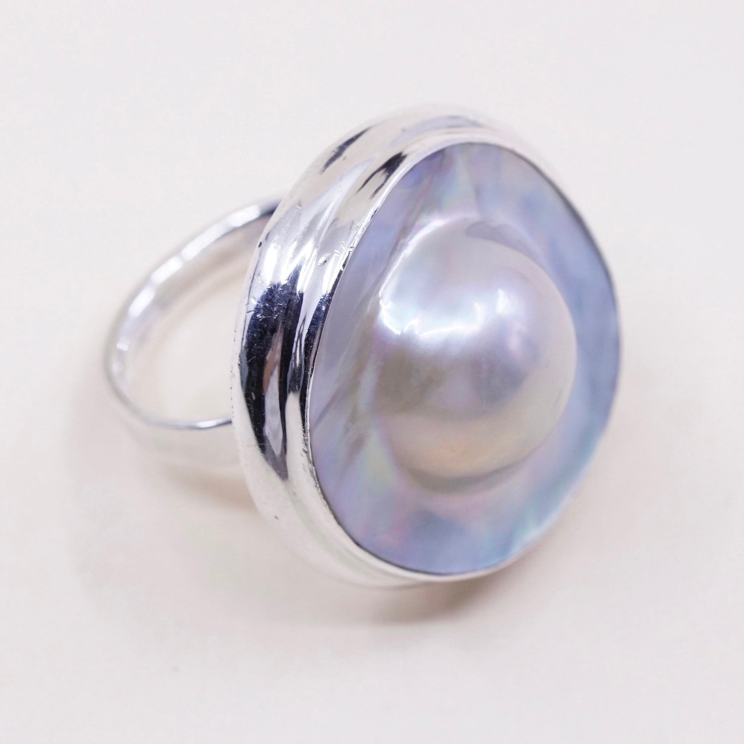 sz 7, vtg SLJ Sterling silver handmade ring, modern 925 band w/ bluster pearl