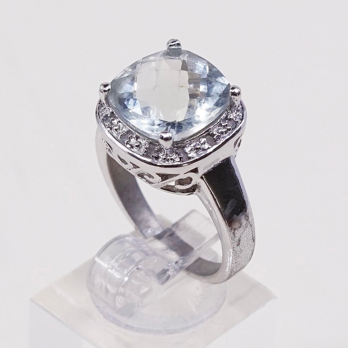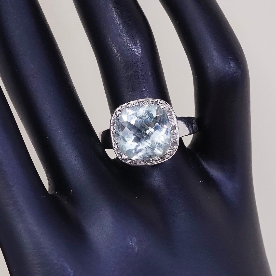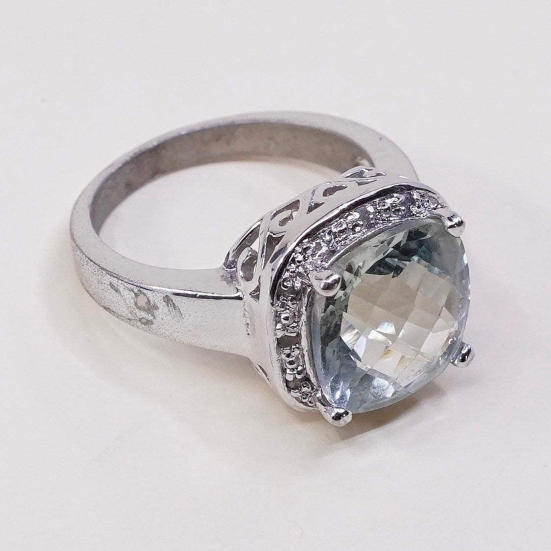 Size 8.25, Vintage sterling silver handmade ring, checker cut prehnite grapestone and genuine diamond details, stamped 925