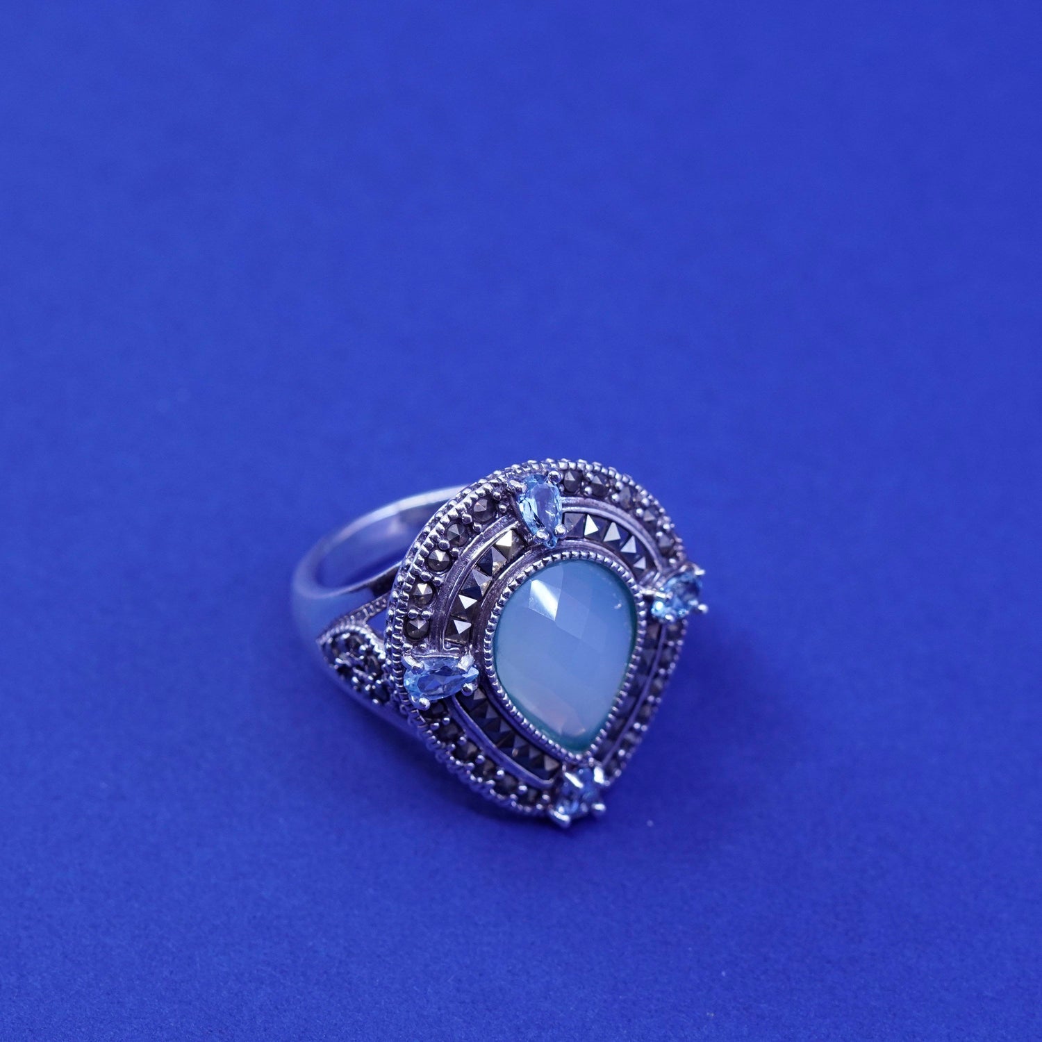 sz10, vtg 925 Sterling 925 Silver teardrop Chalcedony Cocktail Ring Marcasite