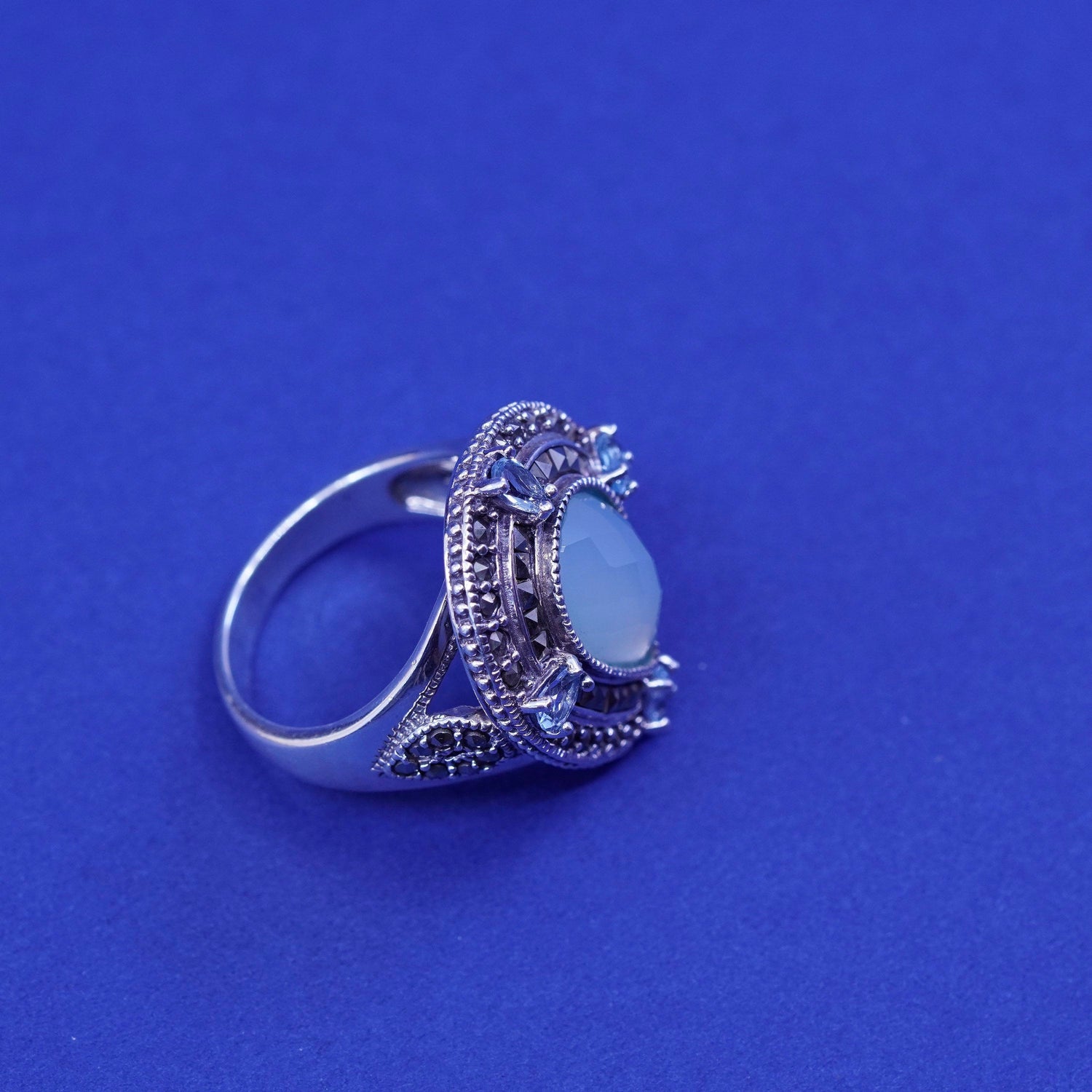 Size 10, 925 Sterling 925 Silver teardrop Chalcedony Cocktail statement Ring with Marcasite, stamped 925
