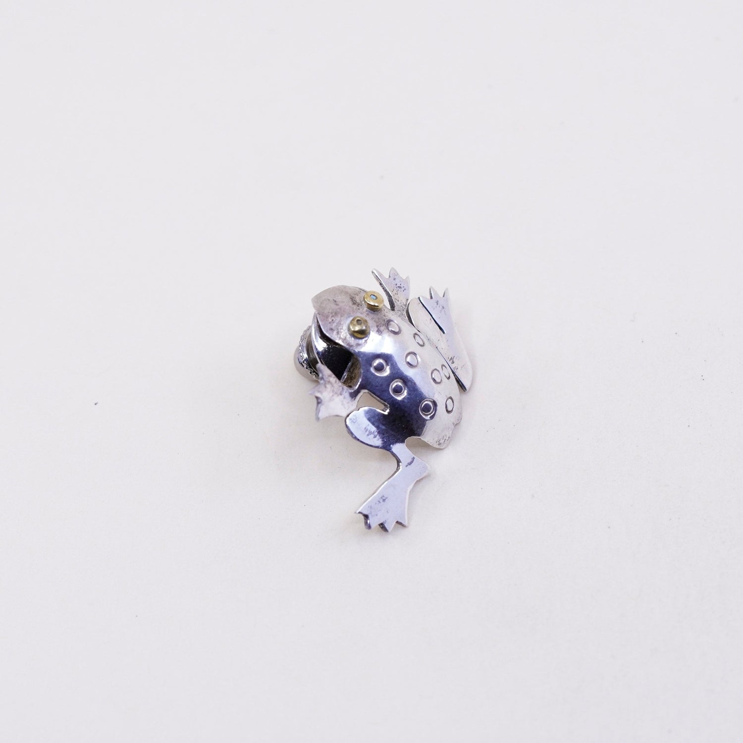 Vintage two tone Sterling silver handmade brooch, 925 frog pin with brass gold tone eyes, stamped 925 far fetched