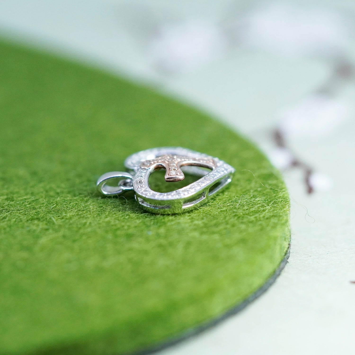 Vermeil rose gold filled sterling silver pendant, 925 heart with cross and diamond, stamped 925